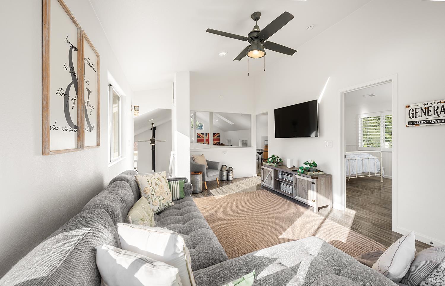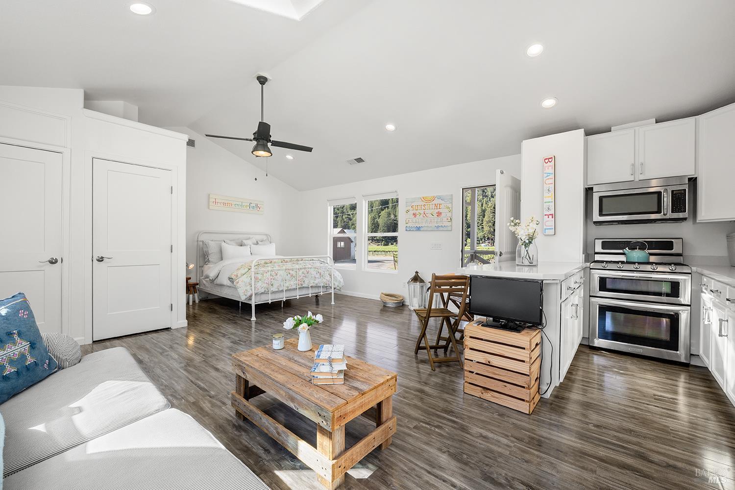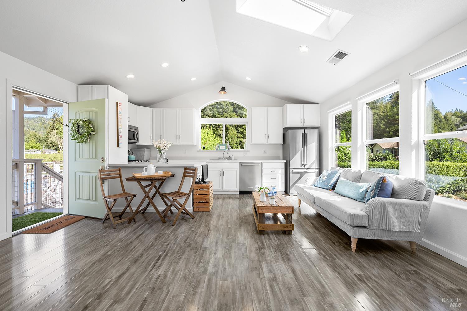 Perched above the rolling vineyards of Korbel with 180-degree views of forested ridgelines and mountain peaks, this fully updated West County farmhouse sets a standard for what a Guerneville estate can be. Set near the end of a private lane on a level 0.25-acre parcel with just one neighbor, the home delivers the kind of privacy and presence that defines true Sonoma County living. At 2,548 square feet with 5 bedrooms and 3.5 bathrooms, the floor plan is both gracious and flexible including a self-contained guest suite with its own private entrance, ideal for multigenerational living, visiting wine country guests, or income potential. Inside, the architecture earns its views. Soaring ceilings and walls of glass draw the vineyards and hills directly into the living space, while the thoughtfully updated kitchen and bathrooms make no compromises designer plumbing fixtures, elevated hardware, and rich stone and tile finishes create a refined, cohesive aesthetic from room to room. The result is a home that feels polished without being precious, luxurious without losing its warmth. Step outside and the property reveals its final act: a sparkling newer in-ground pool anchors a beautifully lit outdoor entertaining area that transitions seamlessly from golden afternoon gatherings to evenings under the stars. Whether you're hosting a harvest dinner for twelve or unwinding after a day on the Sonoma Coast, this outdoor space delivers. Practical details matter too municipal water and sewer, an attached garage, and a location that places you minutes from Guerneville's beloved farm-to-table dining scene, legendary wineries, Armstrong Redwoods State Natural Reserve, and the rugged, breathtaking bluffs and beaches of the Sonoma Coast. As a full-time residence or a West County retreat, this is a property that rewards you every single day you're in it.