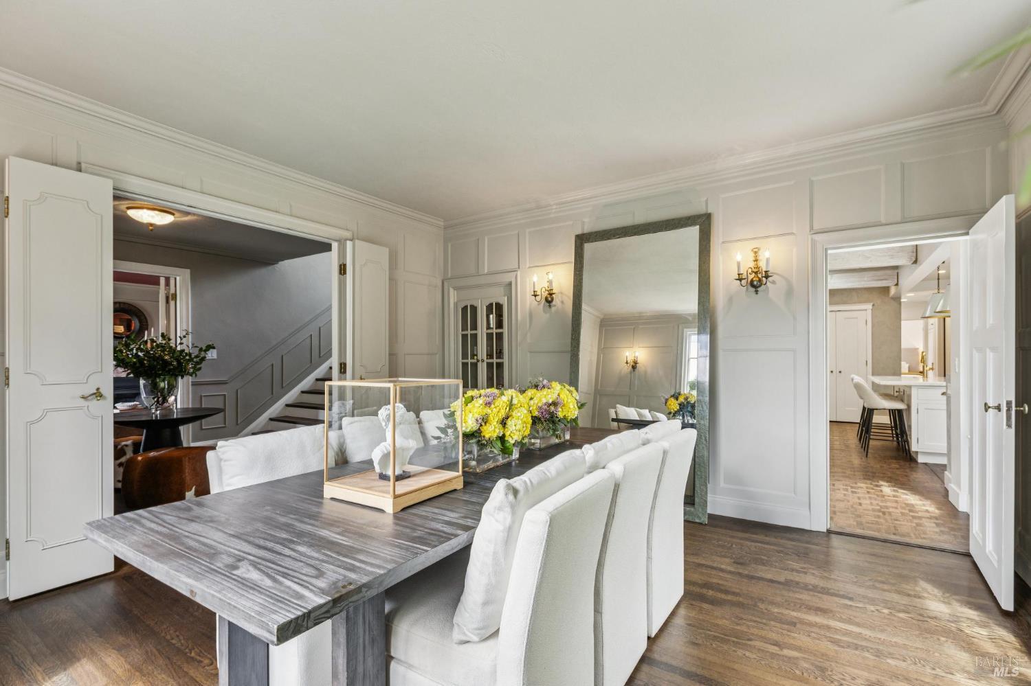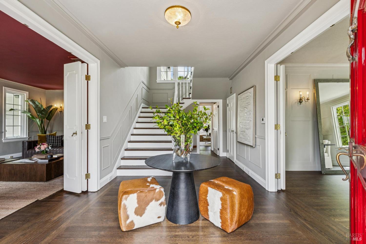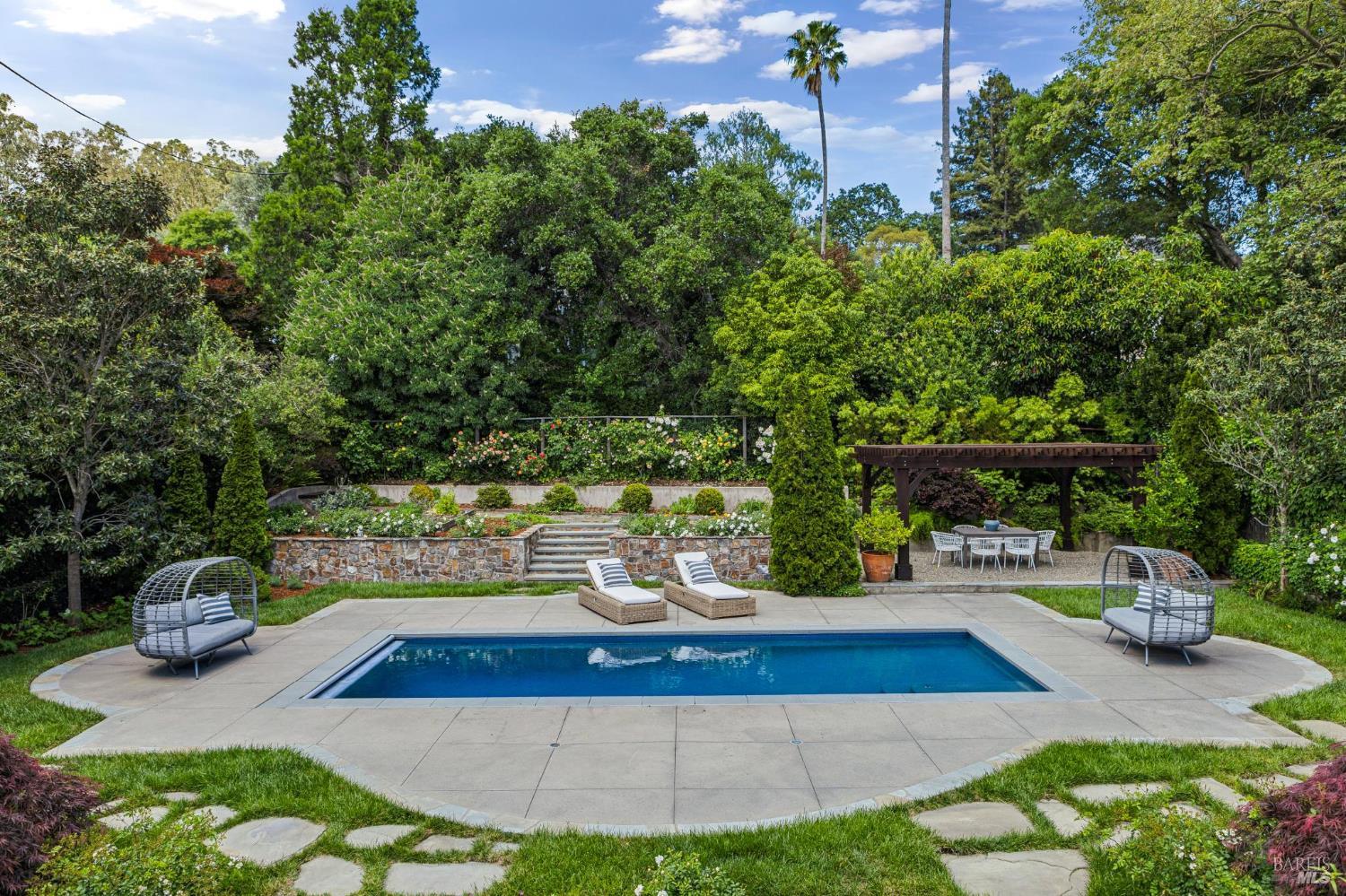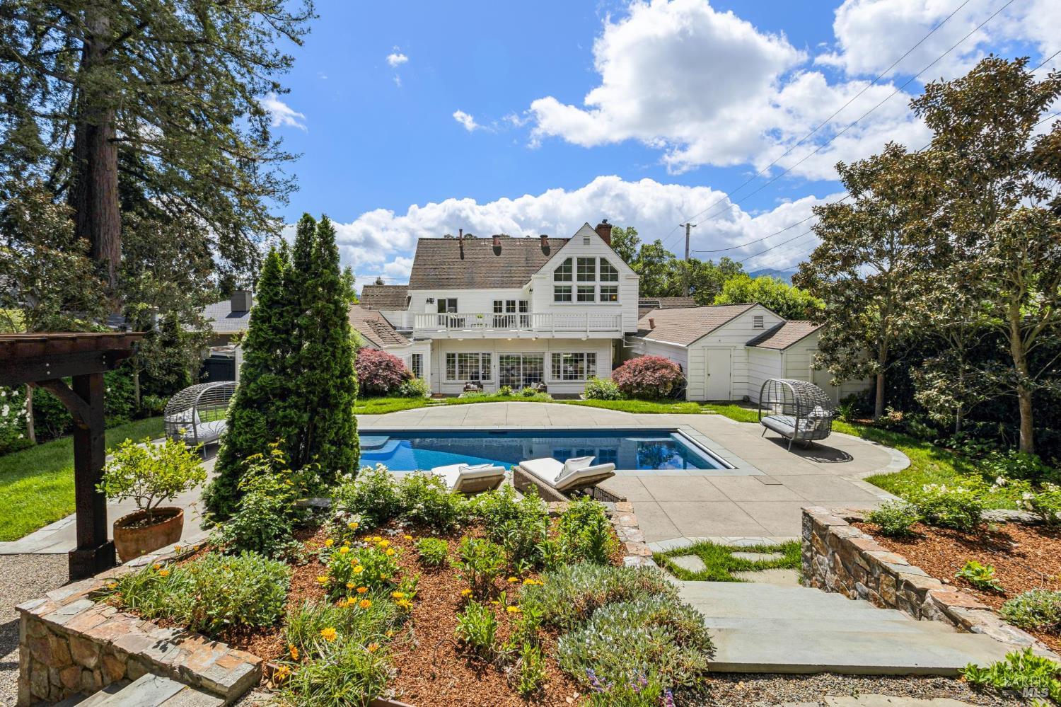 Welcome to this elegant 1927 Georgian estate, tucked behind a gated circular drive in the coveted Dominican neighborhood. The classic facade, framed by stately columns, traditional shutters, and a striking red door, offers a timeless first impression, complemented by manicured gardens of roses, lavender, boxwood, and olive trees. Inside, grand moldings, custom built-ins, hardwood floors, and a sweeping staircase reflect the home's architectural pedigree, thoughtfully updated to blend historic character with modern sophistication. The home offers four bedrooms and four and a half baths, including a main-level ensuite ideal for guests, a private office, powder room, and laundry room. At its heart, a chef's kitchen by Judi Cooper features Calacatta marble and soapstone countertops, premium appliances, and ample storage, flowing into the family room with seamless indoor-outdoor connection. Upstairs, three ensuite bedrooms include a primary suite with a remodeled bath, dual walk-in closets, and a deck overlooking lush grounds. The backyard offers a stone patio, sparkling pool, gardens, fountain, and pergola seating - ideal for relaxation or entertaining. Private yet convenient, minutes to trails, shopping, dining, and Hwy 101 - An extraordinary setting for gracious living.