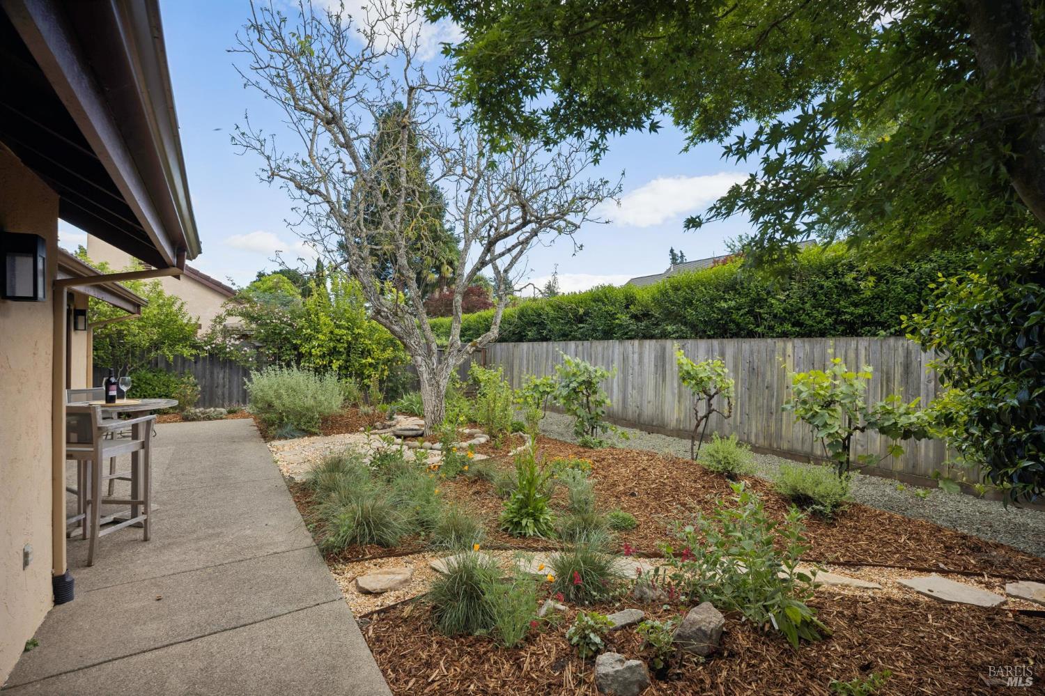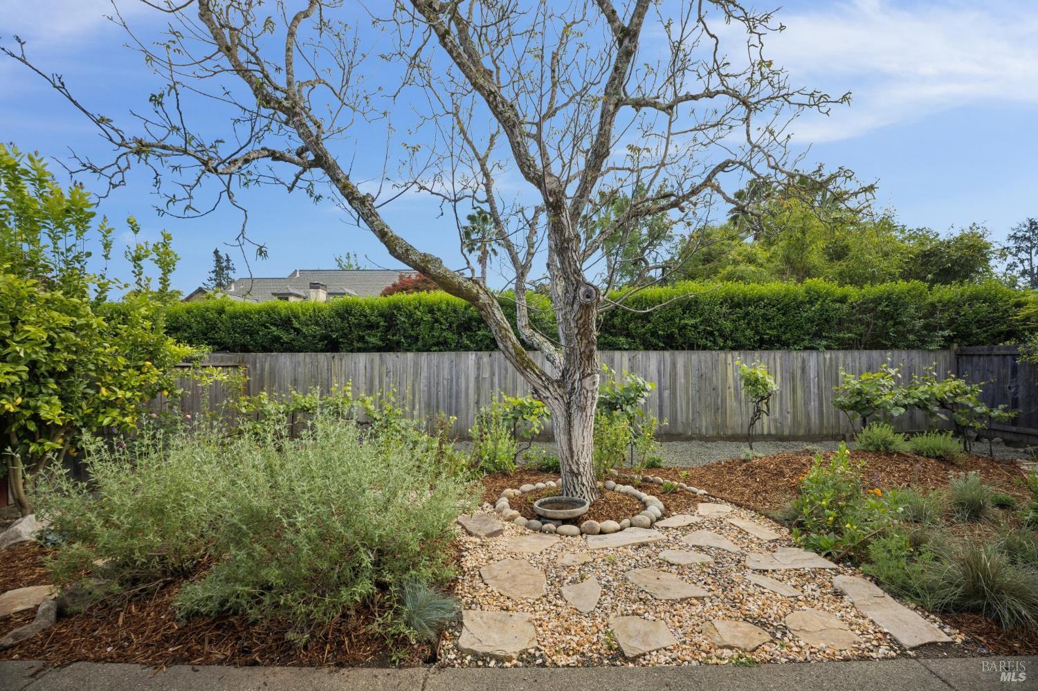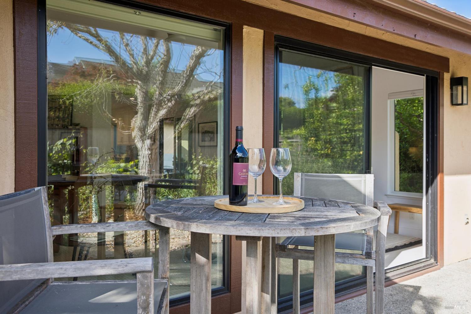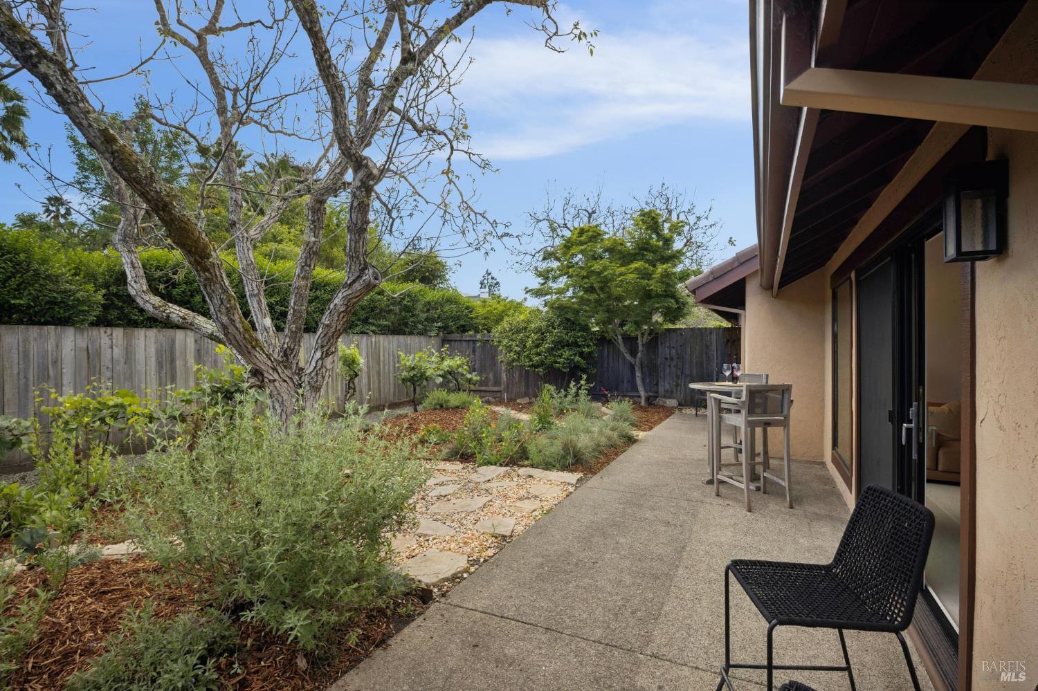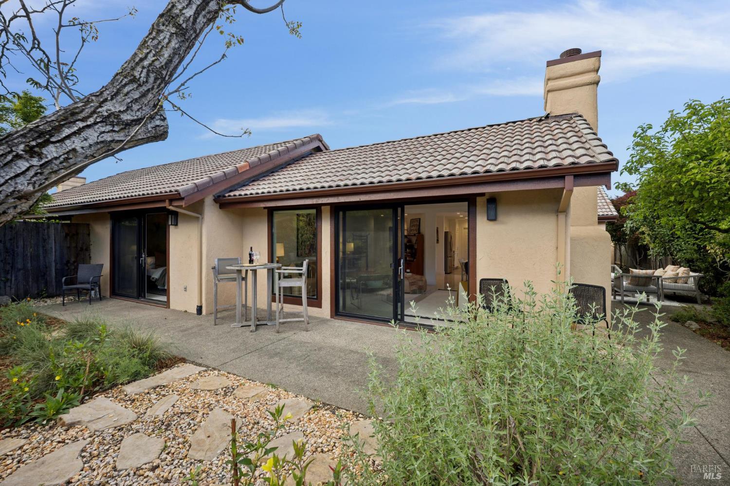 This stunning two-bedroom, two-bath home has undergone significant renovations and upgrades, with healthy living and environmental benefits as key considerations. The bright living room features soaring cathedral ceilings, abundant natural light, and a rare sense of spaciousness. A wood-burning fireplace provides a warm and inviting focal point, and the space opens directly to the landscaped back garden, thoughtfully designed with native plants and pollinators. The open dining area connects to the side patio, creating seamless indoor-outdoor living and easy al fresco diningperfect for Sonoma's temperate climate. The beautifully designed and well-equipped kitchen offers ample storage and counter space, along with direct access to the two-car garage with additional storage and laundry. The spacious primary suite overlooks the garden and includes a recently remodeled ensuite bath with a walk-in shower and double sinks. The comfortable front bedroom also offers direct outdoor access. A conveniently located hall bath features a rejuvenating soaking tub and has likewise been remodeled to a high standard. Environmentally conscious cork floors, new energy-efficient Marvin windows and sliding doors throughout, and upgraded Mitsubishi Electric HVAC and insulation are among the many thoughtful improvements to the home. The small, well-run HOA includes a community pool and hot tub. The quiet, laid-back neighborhood offers easy access to nearby walking trails, markets, restaurants, and the wine destinations that have made Sonoma famous.