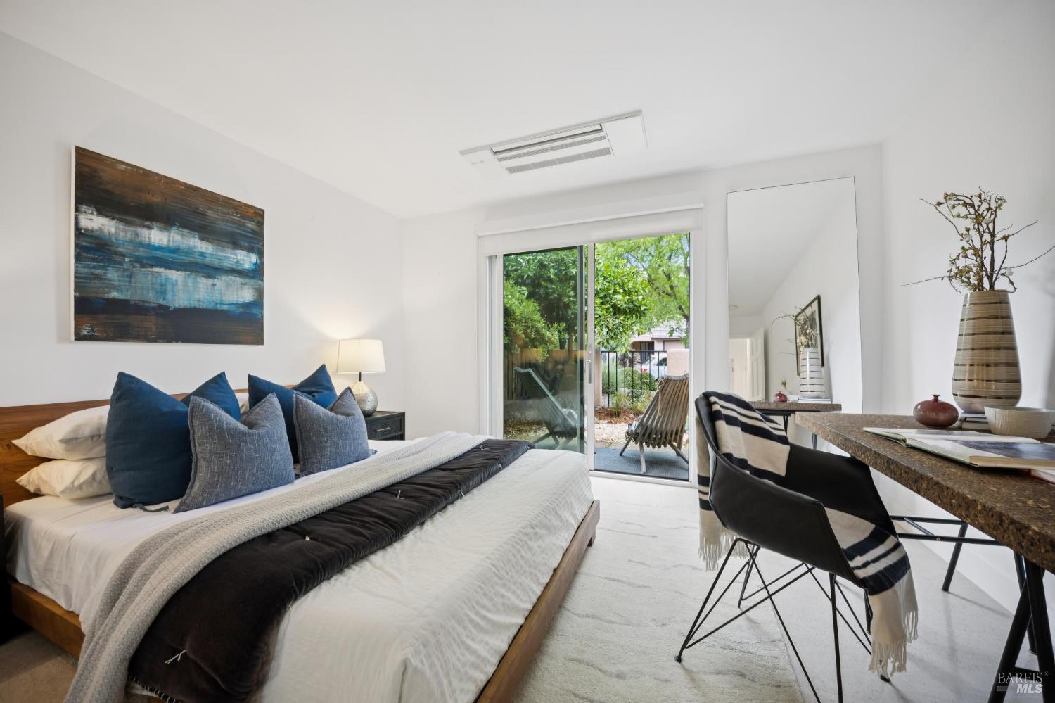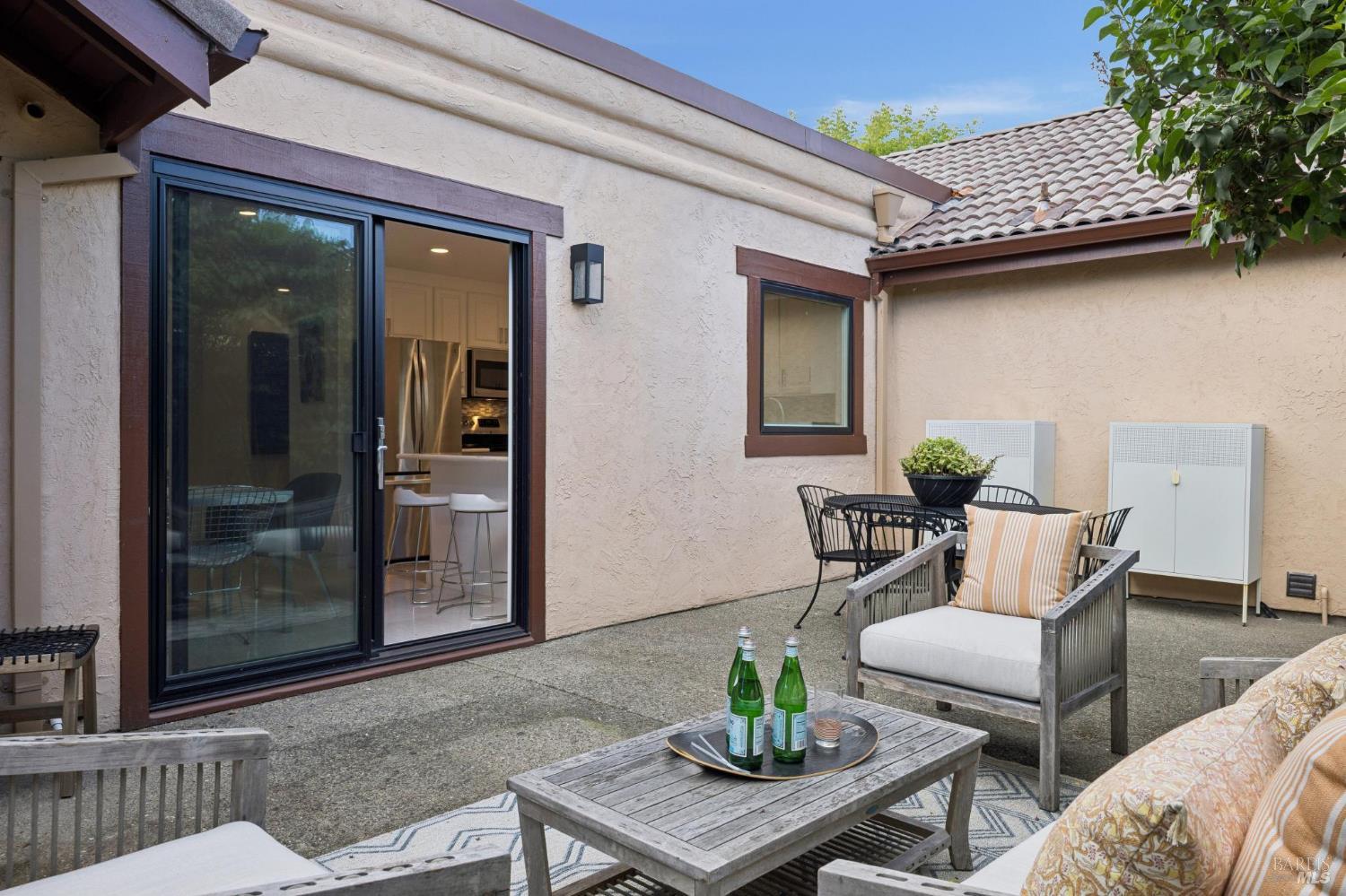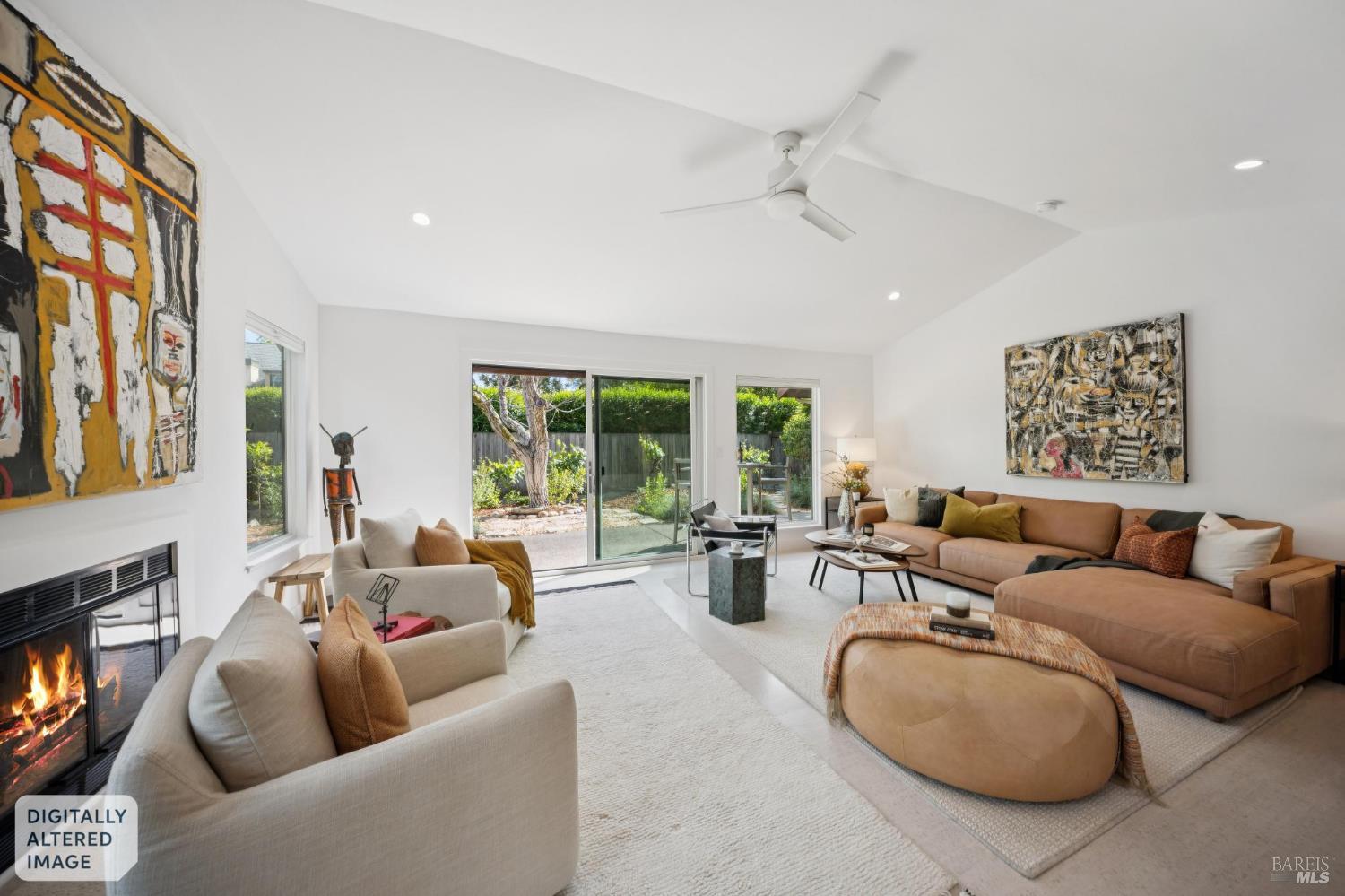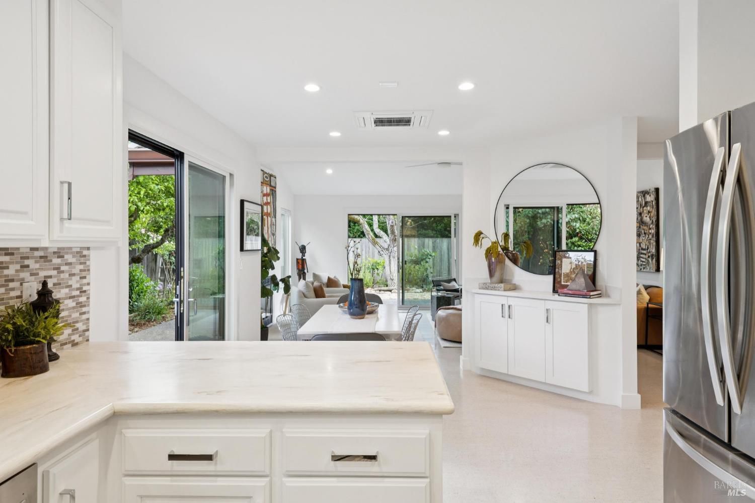 This stunning two-bedroom, two-bath home has undergone significant renovations and upgrades, with healthy living and environmental benefits as key considerations. The bright living room features soaring cathedral ceilings, abundant natural light, and a rare sense of spaciousness. A wood-burning fireplace provides a warm and inviting focal point, and the space opens directly to the landscaped back garden, thoughtfully designed with native plants and pollinators. The open dining area connects to the side patio, creating seamless indoor-outdoor living and easy al fresco diningperfect for Sonoma's temperate climate. The beautifully designed and well-equipped kitchen offers ample storage and counter space, along with direct access to the two-car garage with additional storage and laundry. The spacious primary suite overlooks the garden and includes a recently remodeled ensuite bath with a walk-in shower and double sinks. The comfortable front bedroom also offers direct outdoor access. A conveniently located hall bath features a rejuvenating soaking tub and has likewise been remodeled to a high standard. Environmentally conscious cork floors, new energy-efficient Marvin windows and sliding doors throughout, and upgraded Mitsubishi Electric HVAC and insulation are among the many thoughtful improvements to the home. The small, well-run HOA includes a community pool and hot tub. The quiet, laid-back neighborhood offers easy access to nearby walking trails, markets, restaurants, and the wine destinations that have made Sonoma famous.