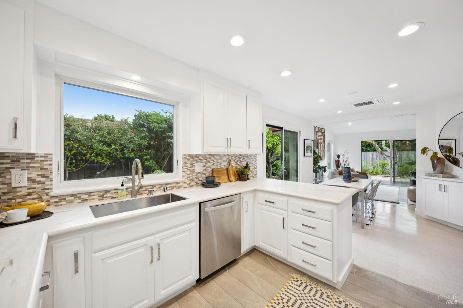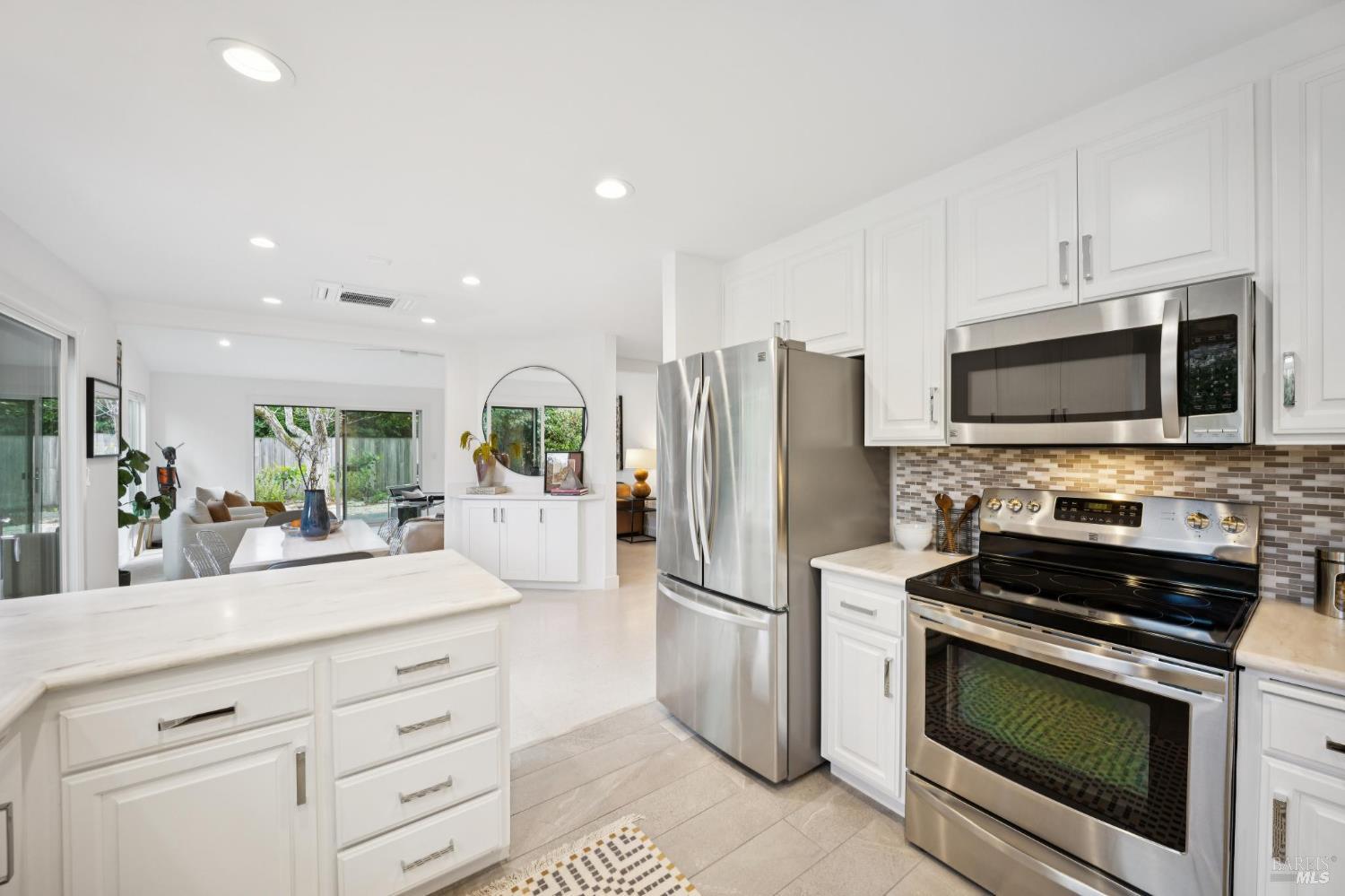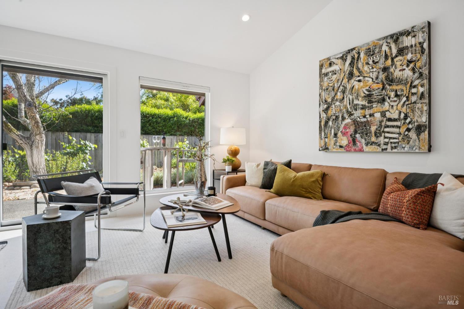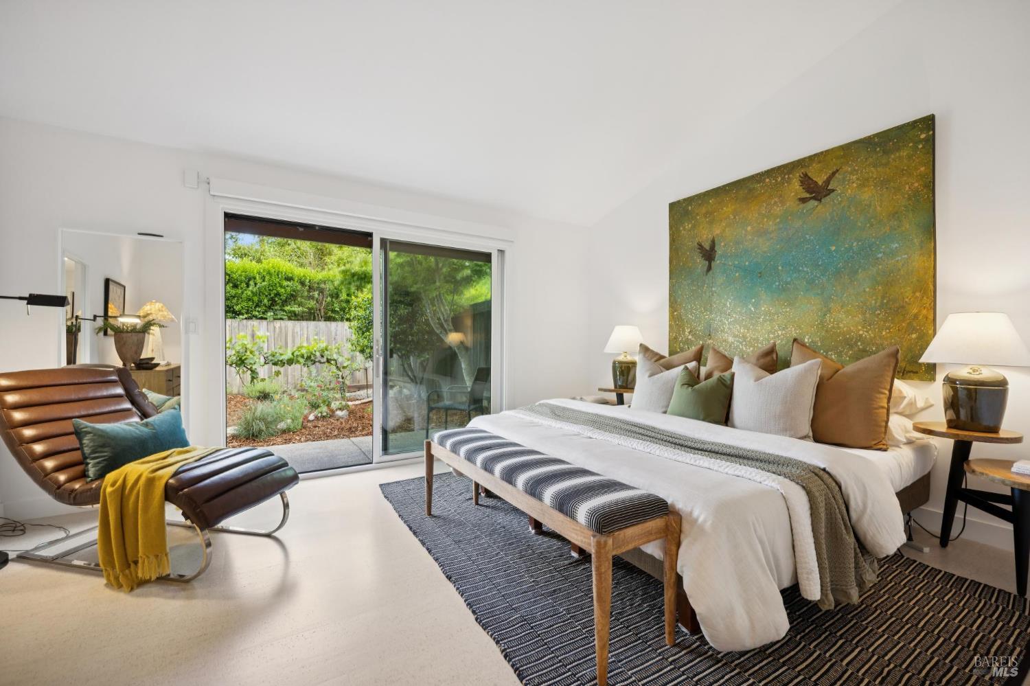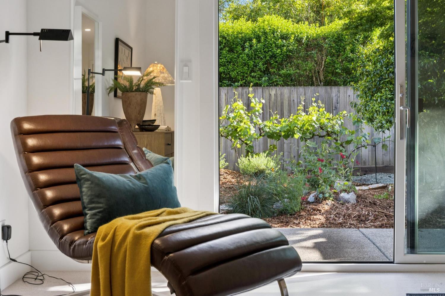 This stunning two-bedroom, two-bath home has undergone significant renovations and upgrades, with healthy living and environmental benefits as key considerations. The bright living room features soaring cathedral ceilings, abundant natural light, and a rare sense of spaciousness. A wood-burning fireplace provides a warm and inviting focal point, and the space opens directly to the landscaped back garden, thoughtfully designed with native plants and pollinators. The open dining area connects to the side patio, creating seamless indoor-outdoor living and easy al fresco diningperfect for Sonoma's temperate climate. The beautifully designed and well-equipped kitchen offers ample storage and counter space, along with direct access to the two-car garage with additional storage and laundry. The spacious primary suite overlooks the garden and includes a recently remodeled ensuite bath with a walk-in shower and double sinks. The comfortable front bedroom also offers direct outdoor access. A conveniently located hall bath features a rejuvenating soaking tub and has likewise been remodeled to a high standard. Environmentally conscious cork floors, new energy-efficient Marvin windows and sliding doors throughout, and upgraded Mitsubishi Electric HVAC and insulation are among the many thoughtful improvements to the home. The small, well-run HOA includes a community pool and hot tub. The quiet, laid-back neighborhood offers easy access to nearby walking trails, markets, restaurants, and the wine destinations that have made Sonoma famous.