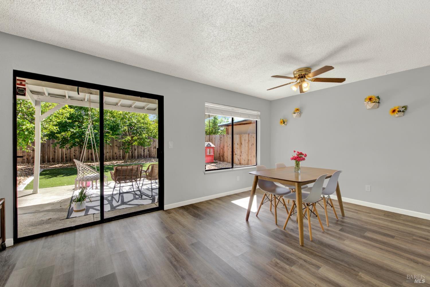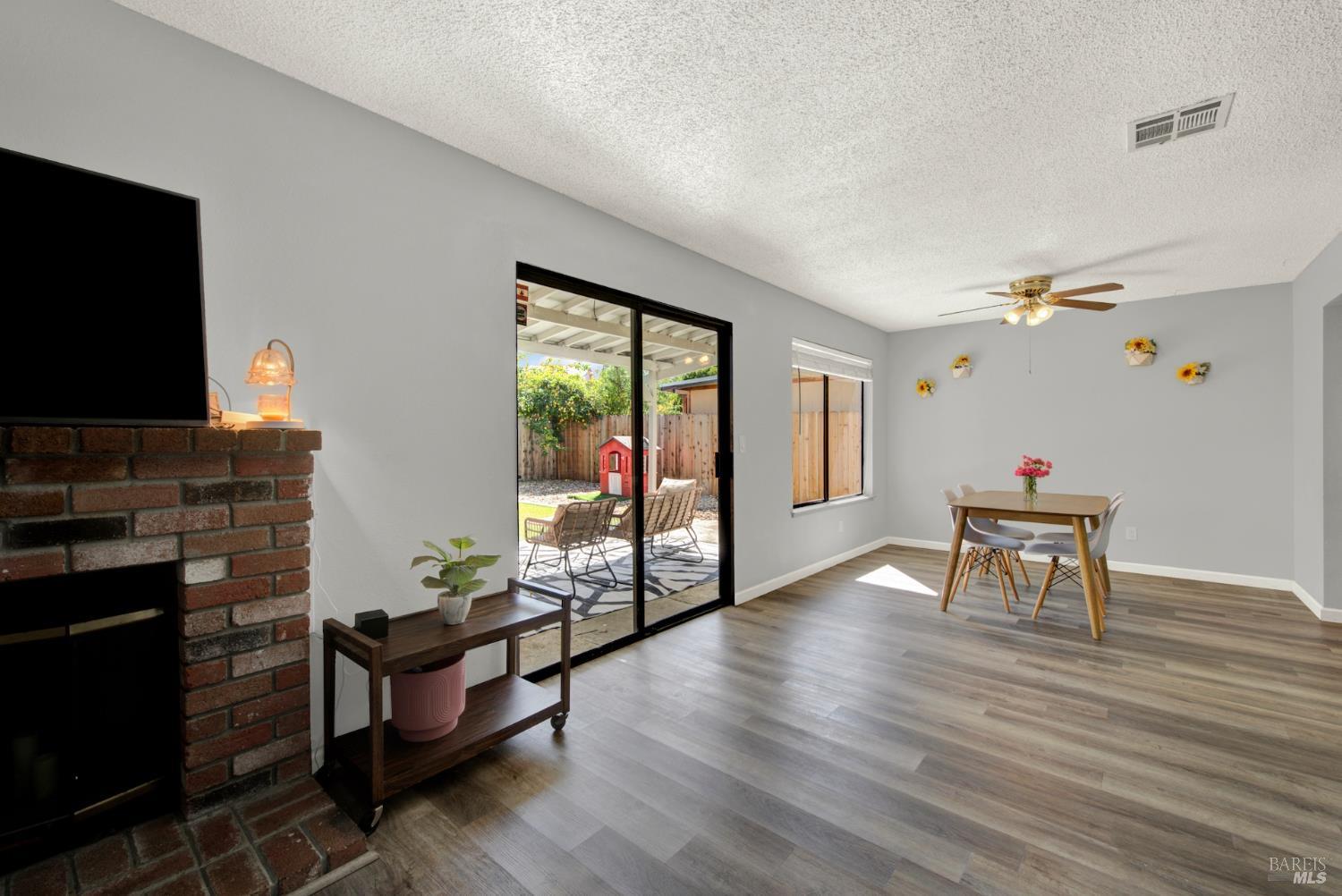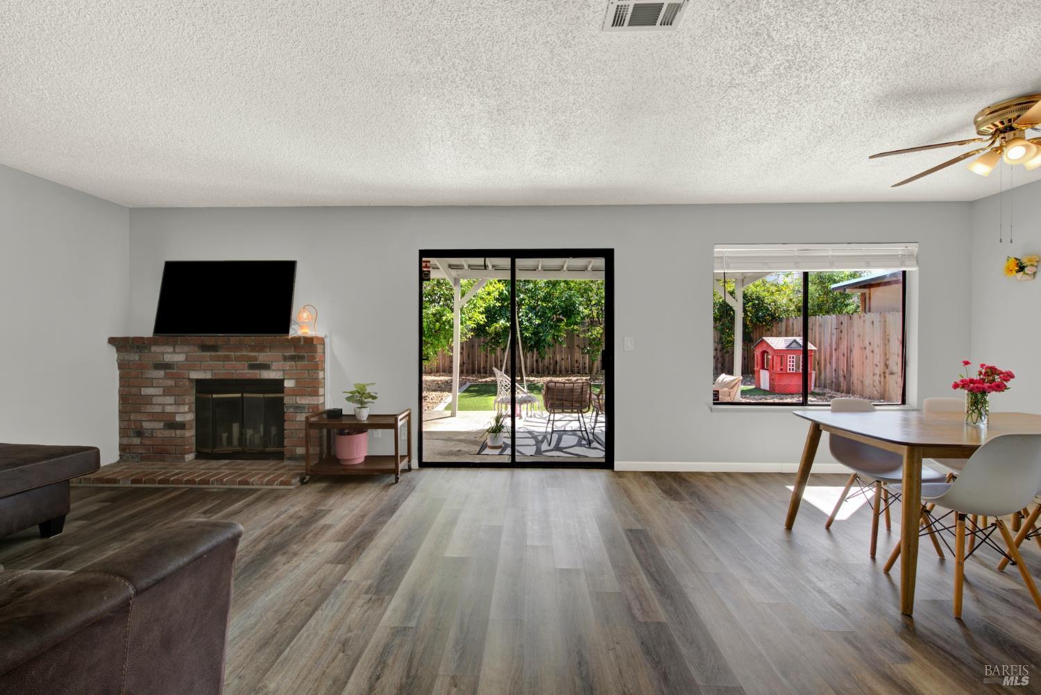 Nestled in a great location, this neatly kept and spacious two-story home welcomes you with an open and bright floor plan and durable LVT flooring throughout. The well-appointed kitchen features granite countertops and a gas stove, making meal prep a pleasure. The downstairs den can easily be converted into a bedroom, and there is a full bathroom on this level for added convenience. The primary suite is generous in size and showcases double doors, a large bathroom with a walk-in shower, and ample closet space. Outside, the large backyard offers fruit trees, lush turf, and an awning that provides welcome shade. Located near shopping, Travis Air Force base, train station, freeways, and schools. This home combines comfort, practicality, and accessibility in one wonderful package.