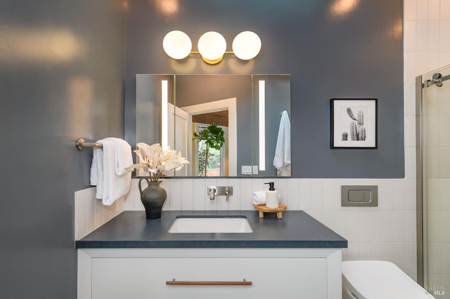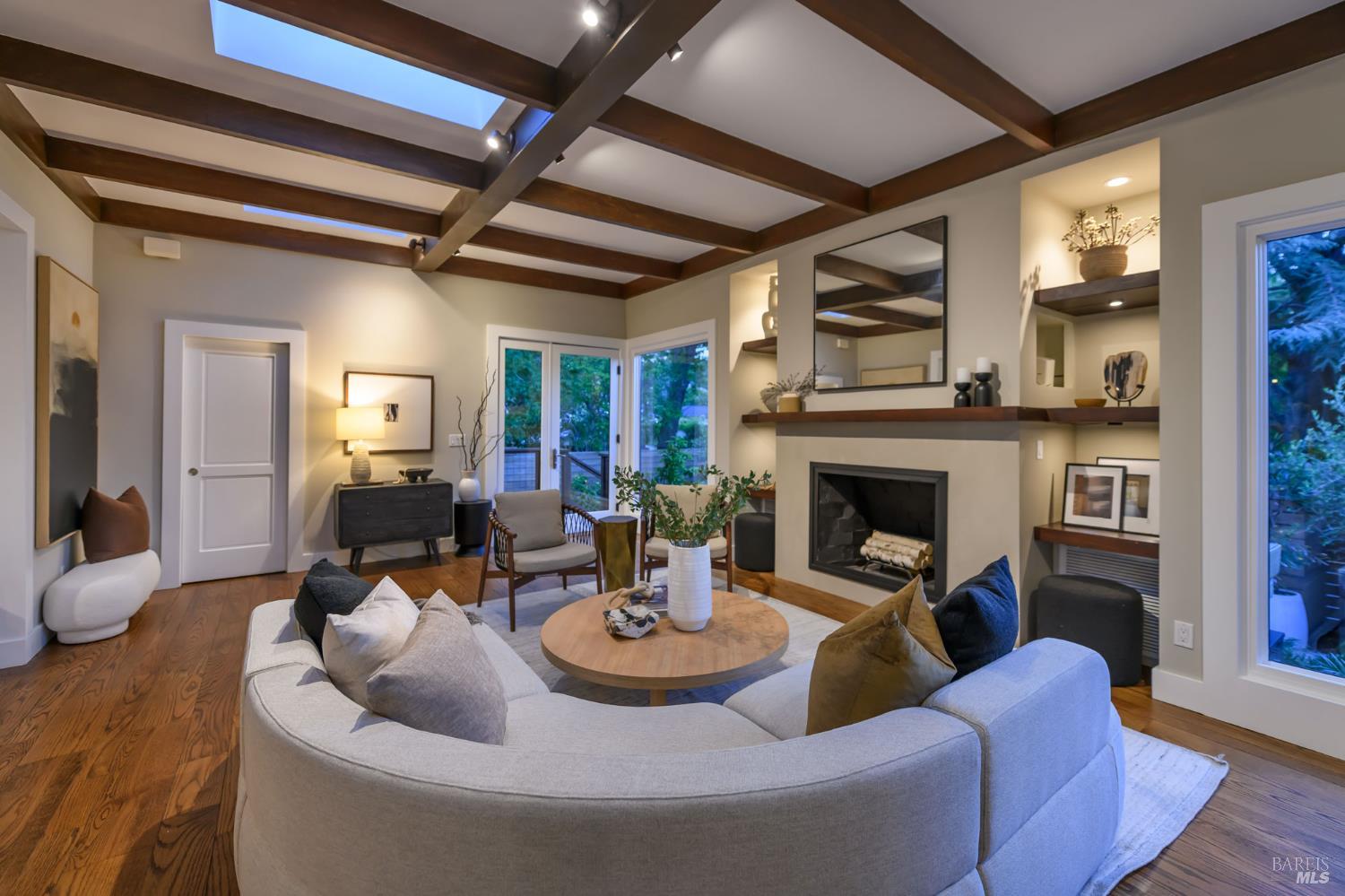 Located in the highly desirable Kentfield flats, this thoughtfully renovated single-level mid-century modern home offers exceptional privacy, effortless indoor/outdoor living, and a remarkably efficient floor plan. Set behind mature landscaping and framed by heritage trees, the home lives far beyond its footprint, opening seamlessly to a beautifully curated, park-like backyard. Designed for both everyday living and entertaining, the expansive outdoor spaces include a large deck with covered outdoor kitchen, hot tub, level turf lawn, bluestone courtyard, and multiple gathering areas. Two detached modern studios provide flexible space ideal for home offices, fitness, or creative use. Inside, the light-filled great room with soaring ceilings flows directly to the outdoors, creating a seamless connection between interior and exterior living. The chef's kitchen anchors the home with a professional Wolf range, with pot filler and center island. Spa-inspired bathrooms feature luxury details, including heated floors, California Closets in the primary suite, and custom millwork throughout. Ideally located near Ross Commons, Pixie Park, Woodlands Market, scenic pathways, and top-rated Kentfield schools, this property offers a rare combination of privacy, convenience, and design-forward living. Thoughtfully updated and beautifully finished, this is a truly special opportunity in one of Marin's most sought-after neighborhoods.