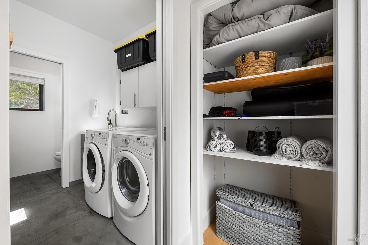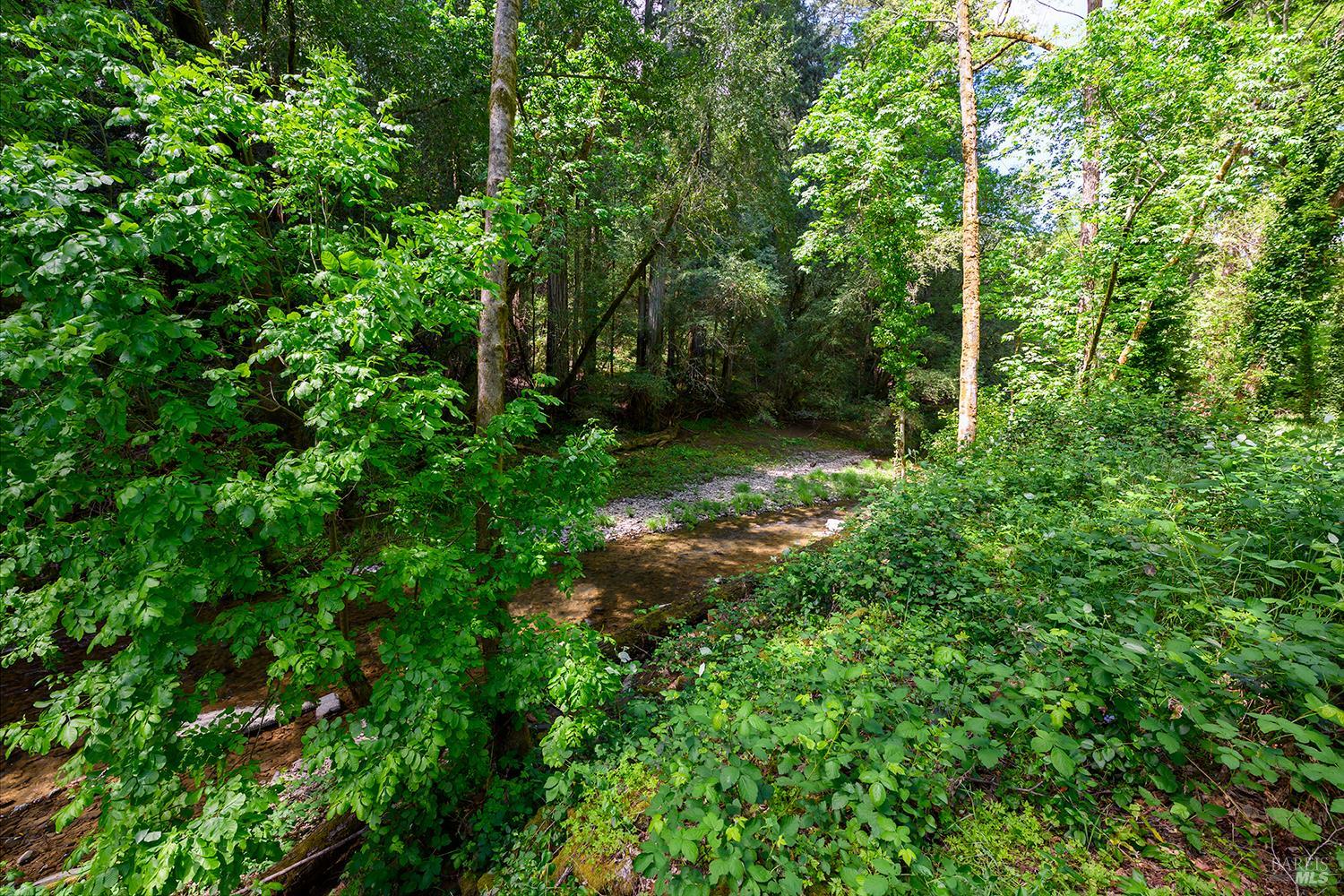 Eight minutes from the Healdsburg plaza, Mill Creek Road gives way to a forest canopy and the kind of quiet that makes you exhale. That's the setting for 2563 & 2560 Mill Creek Rd combined to offer an almost 1 acre property, modern designed 2 bedroom, 2.5 bathroom 1,409 sqft home, genuine nature immersion, and one of the most compelling income opportunities in Healdsburg today. A striking modern home with floor-to-ceiling windows, warm oak plank floors, and an open-concept layout built for living well. The kitchen anchors the main level with a large island, wine fridge, stainless appliances, and floating shelves. Multiple glass sliders dissolve the boundary between inside and out, opening to an expansive deck for dining and entertaining, gravel path, dedicated patio, hot tub, cold plunge, and sauna the kind of amenity stack that earns five-star reviews or creates quality memories. Both ensuite bedrooms sit upstairs, framed by forest views on every side. Cross Mill Creek Road to the south parcel: a fully fenced half-acre with Mill Creek frontage, mature trees, flat open terrain, and a large storage shed ideal for recreation or leisure. Must see to appreciate this unique offering.