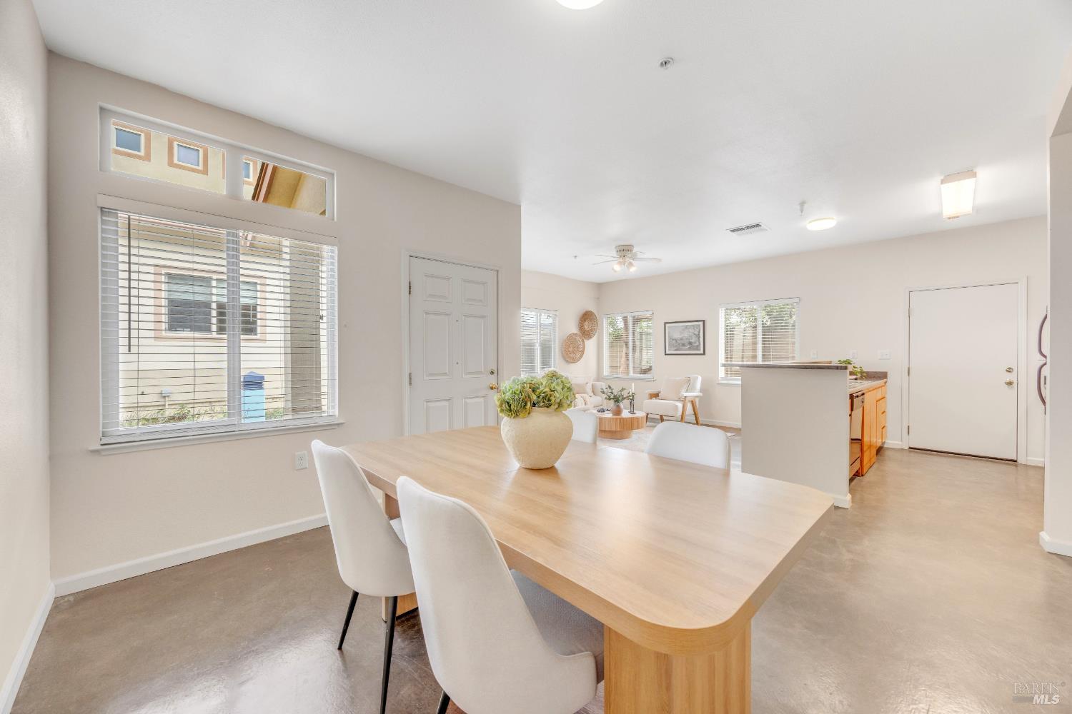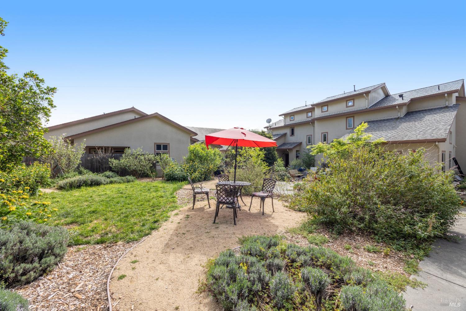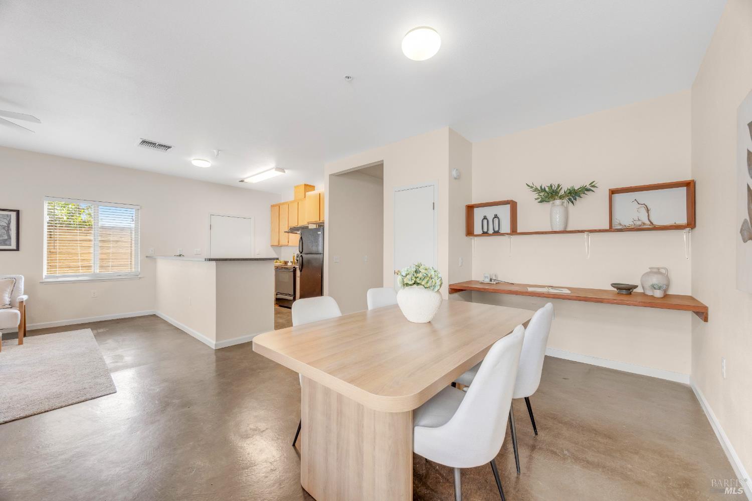 Welcome to this rare end-unit townhome in Sequoia Village Cohousing, where a unique sense of community meets the ease and privacy of home. This modern single-story home features 2 bedrooms and 1 bathroom, offering a bright, open-concept layout filled with abundant natural light. The open kitchen seamlessly flows into the dining and living areas and features countertop seating, ideal for both casual entertaining and quiet nights in. Additional highlights include a hallway laundry closet with a stacked washer and dryer, an included refrigerator, a landscaped front yard, and front and side patios. Built to high energy-efficiency standards, the home also features a solar system. At the heart of the community is a shared garden and vibrant common house, complete with a spacious gathering room, kids' playroom, commercial-grade kitchen, and an upstairs media/TV lounge, perfect for community events or relaxed everyday living. All this, just minutes from parks, shopping, and schools. Experience the unique charm of Sequoia Village Cohousing, welcome home.