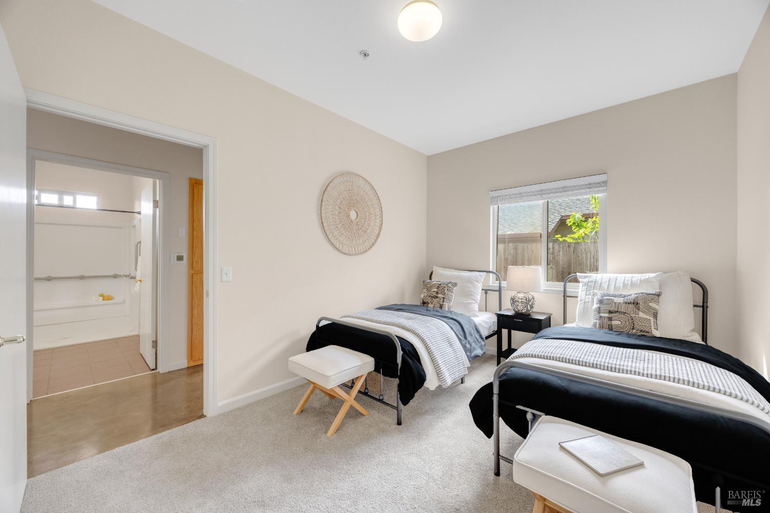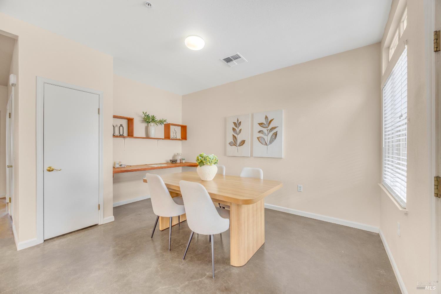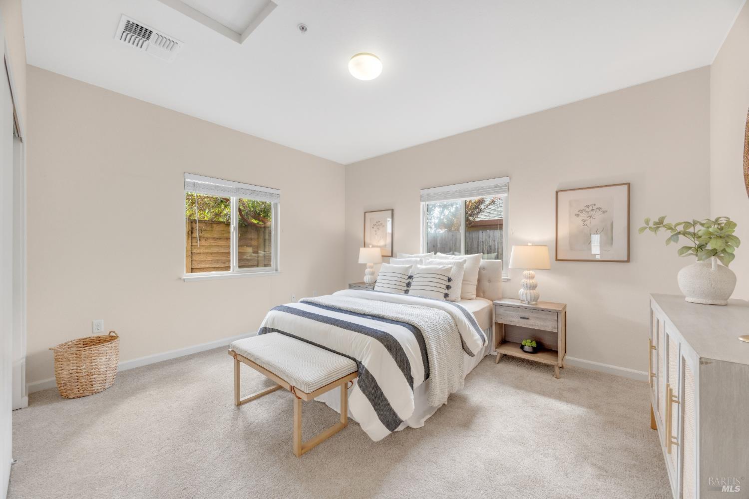 Welcome to this rare end-unit townhome in Sequoia Village Cohousing, where a unique sense of community meets the ease and privacy of home. This modern single-story home features 2 bedrooms and 1 bathroom, offering a bright, open-concept layout filled with abundant natural light. The open kitchen seamlessly flows into the dining and living areas and features countertop seating, ideal for both casual entertaining and quiet nights in. Additional highlights include a hallway laundry closet with a stacked washer and dryer, an included refrigerator, a landscaped front yard, and front and side patios. Built to high energy-efficiency standards, the home also features a solar system. At the heart of the community is a shared garden and vibrant common house, complete with a spacious gathering room, kids' playroom, commercial-grade kitchen, and an upstairs media/TV lounge, perfect for community events or relaxed everyday living. All this, just minutes from parks, shopping, and schools. Experience the unique charm of Sequoia Village Cohousing, welcome home.