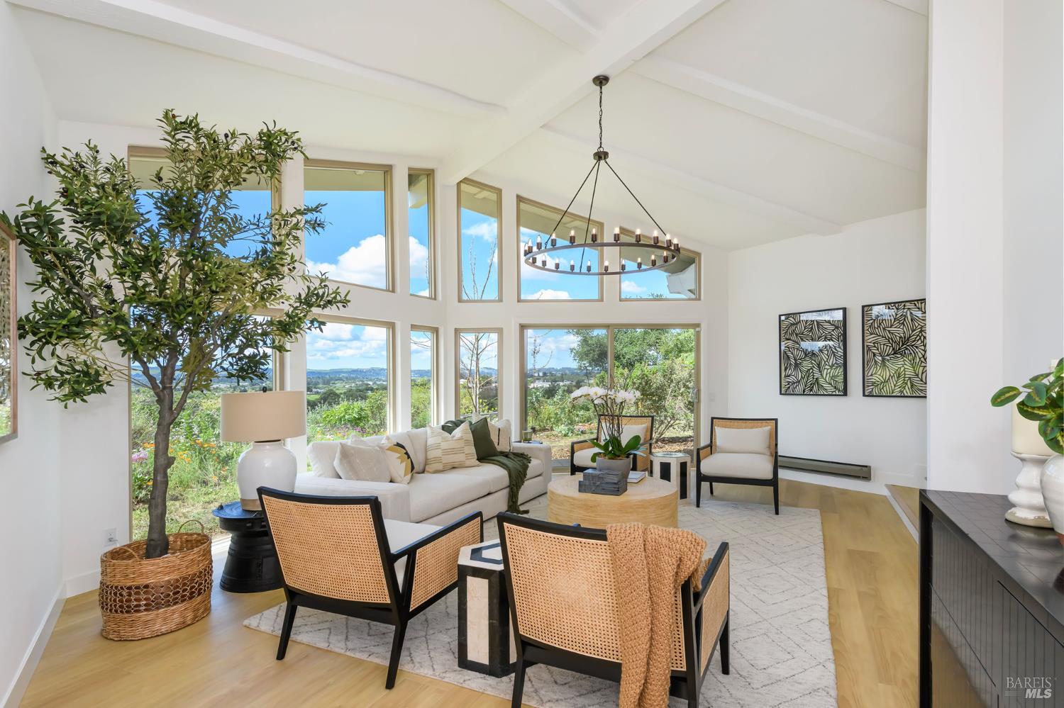 Soaring panoramic views of the Petaluma Valley and beyond. Prepare to fall in love with this classic 2,696sf ranchette set on 6.81 pastoral acres. 100 Frances Way is tucked behind a rolling grassy pasture, surrounded by gardens, more than 60 fruit and nut trees, native wildlife, pollinator gardens, and majestic trees. The flexible floor plan features three bedrooms plus an office, and a living room with a cathedral open-beam ceiling, chandelier, and floor-to-ceiling windows framing nightly sunset and city light views. The expansive primary suite offers access to a front deck with sweeping views, along with the privacy of a backyard patio and gardens. Bright, contemporary interiors include plank flooring, a wood-burning fireplace, and spa-inspired bathrooms. Equestrian amenities include a 36x36 barn with three stalls, a tack room, a small fenced horse arena, water, and electricity - perfect for animals and future farming. Recent upgrades include 21 owned solar panels, water filtration systems, leak detection, smart thermostats, and a SimpliSafe alarm system. A spacious attached two-car garage features an EV outlet and built-in storage. Ideally located close to downtown Petaluma and Penngrove and within the coveted Waugh School District yet tucked into the bucolic countryside of Petaluma, 100 Frances Way will captivate you.
