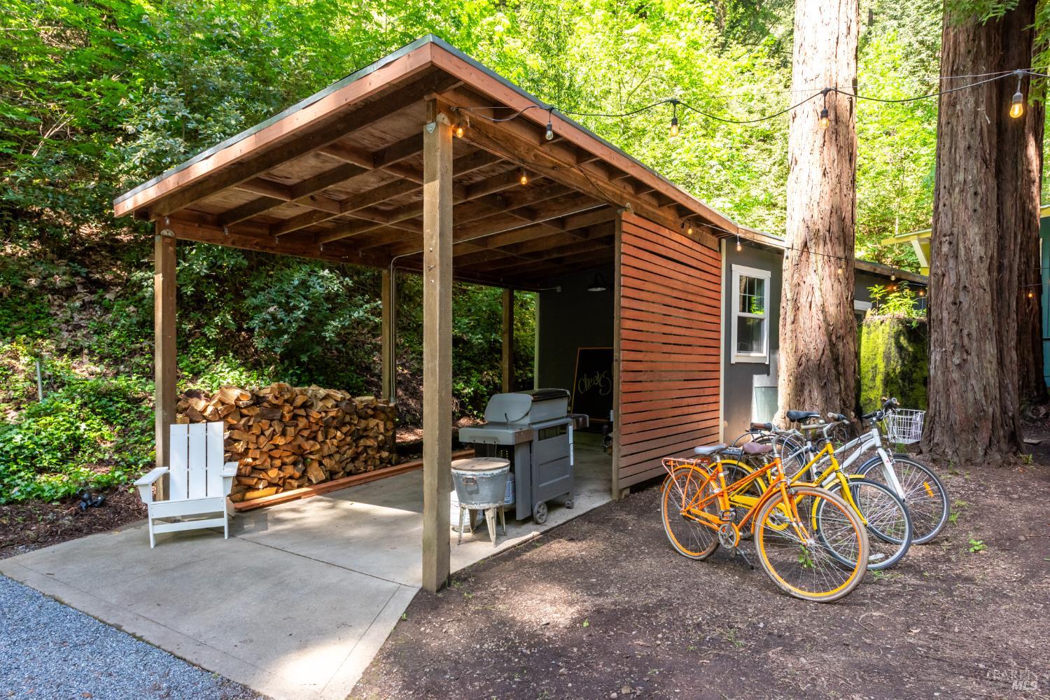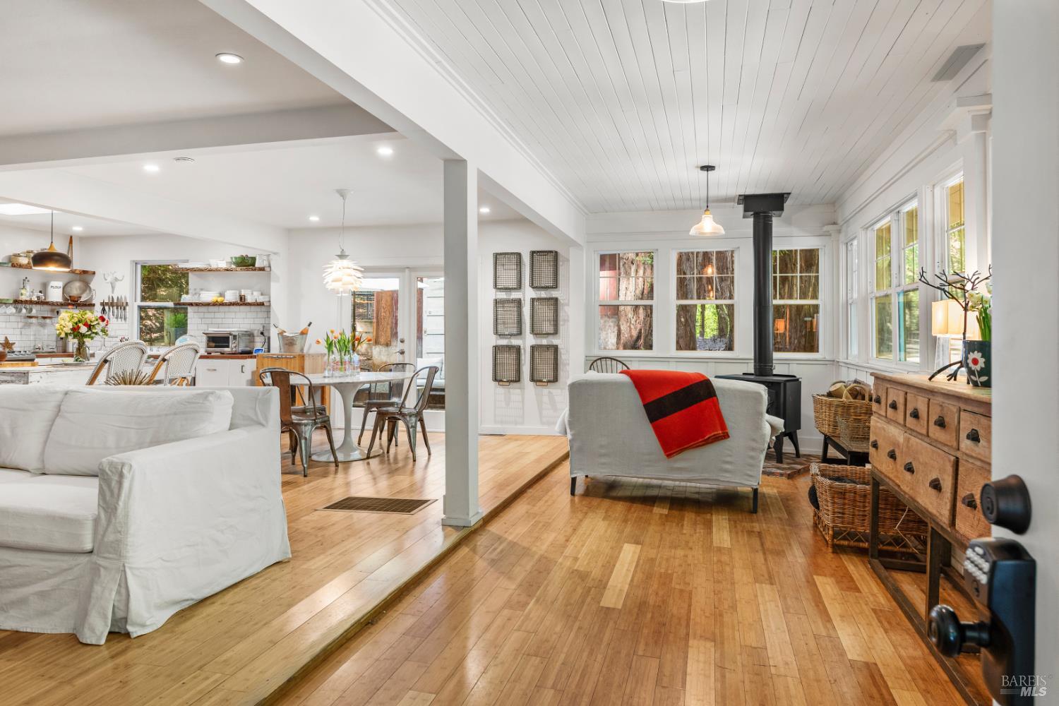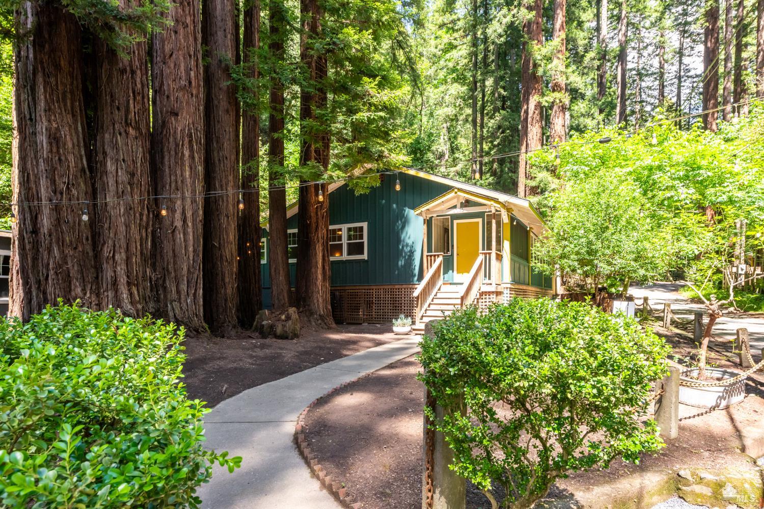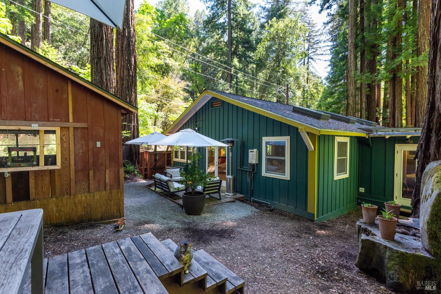 Meet the Grand Dame of Rio Nido - a home with stories to tell. Decades ago, performers from the Rio Nido Roadhouse would wander over after their sets, Jack Benny included. Today, the home has been beautifully refreshed, yet every bit of the original charm still shines through. Life here is peaceful. Step outside and the first thing you'll notice is the quiet, broken only by birds in the trees. Inside, the 2-bed, 2-bath layout feels open and inviting, with engineered wood floors, a newly updated primary ensuite with dramatic views of the redwoods, and a modern kitchen with new appliances and updated bathrooms. This home has been lovingly cared for and has a recent HVAC system, wood stove, insulation, and a newer roof. There's also a fully permitted 333 sq. ft. workshop with power, plenty of parking, and even a 16-foot canoe ready for adventure. A 13x16 shed with new roof & skylights is ready for your hobbies & storage needs. Areas for entertaining abound, and privacy is real on this near 1/3 acre parcel! You're connected to public water and sewer and just a short walk from Riverside Park Beach, the Roadhouse, and the community pool. It's history, comfort, and heart all in one place.