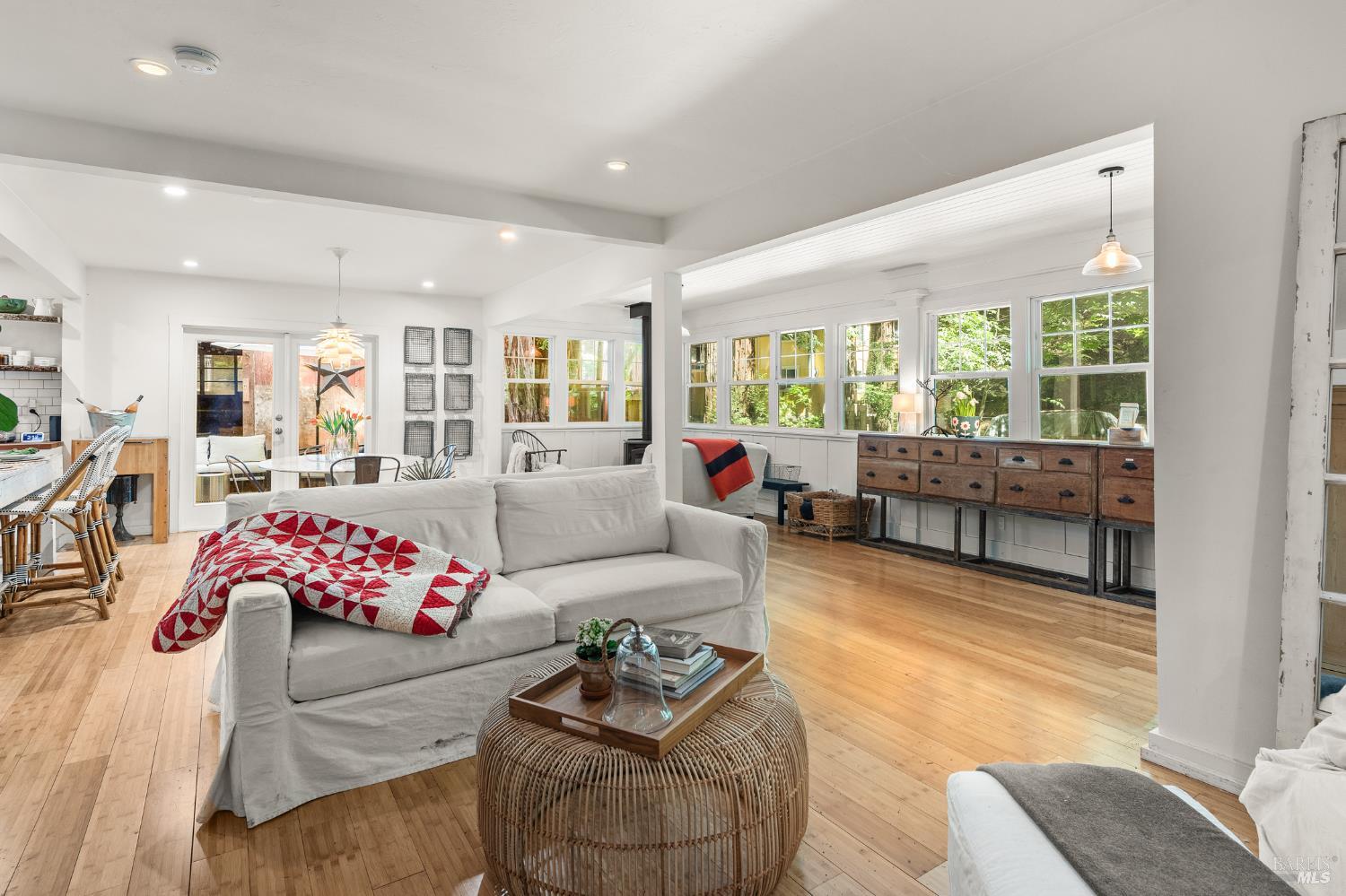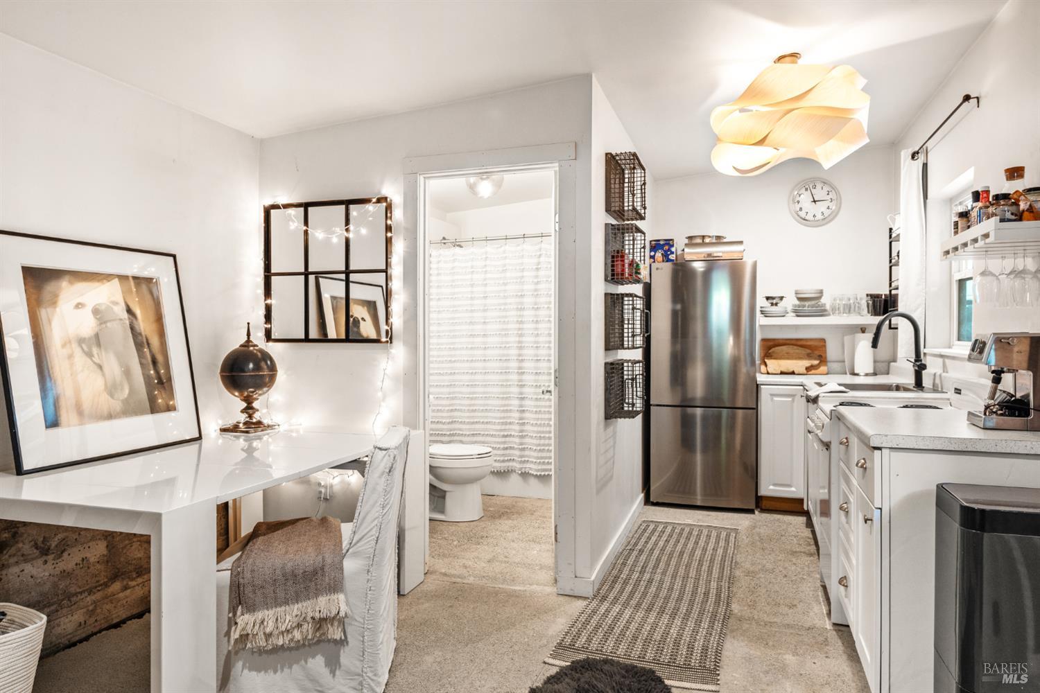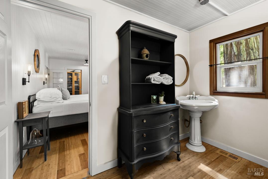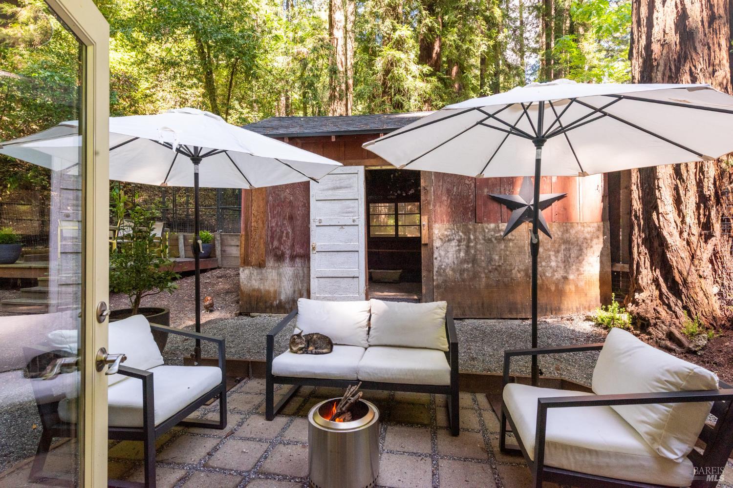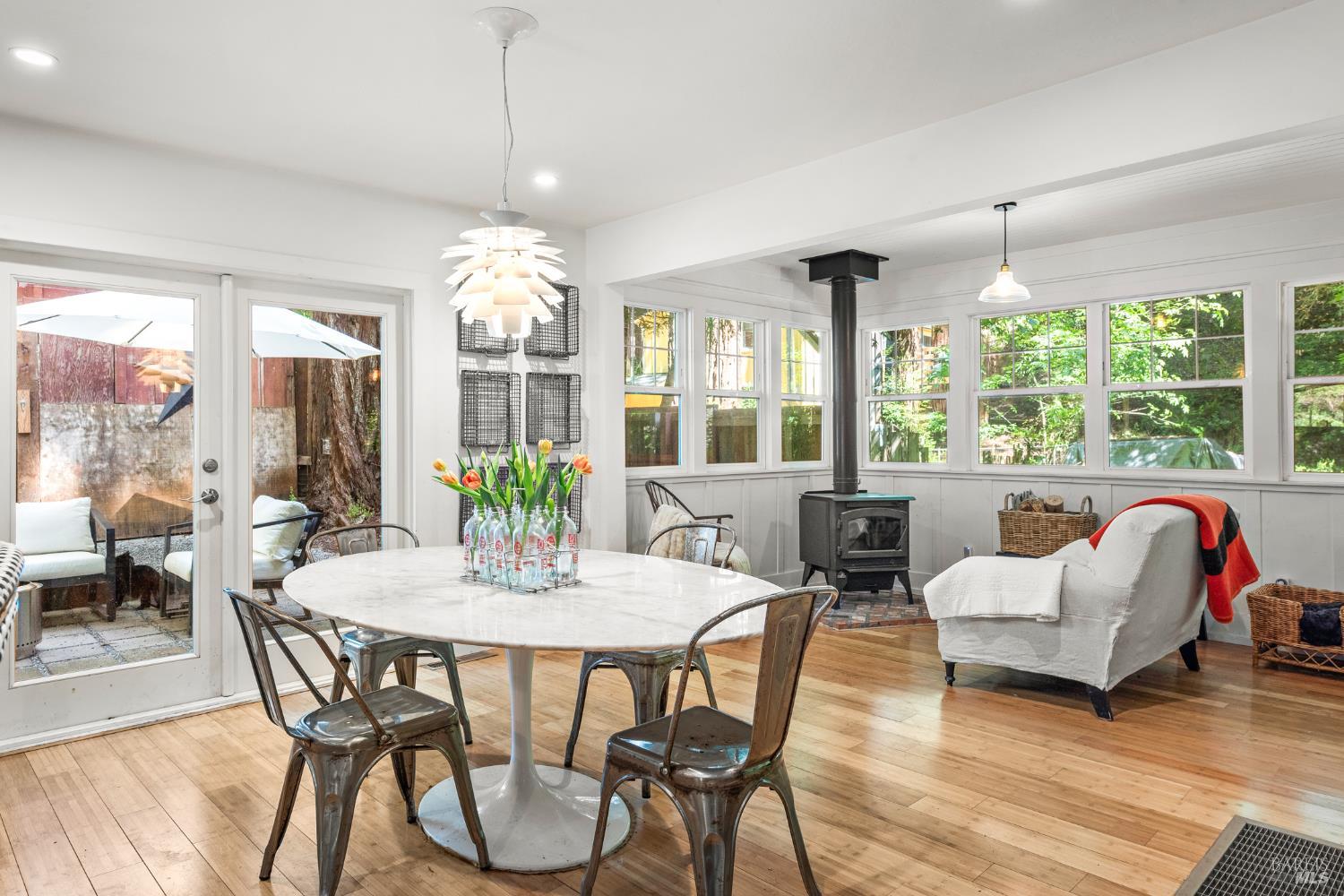 Meet the Grand Dame of Rio Nido - a home with stories to tell. Decades ago, performers from the Rio Nido Roadhouse would wander over after their sets, Jack Benny included. Today, the home has been beautifully refreshed, yet every bit of the original charm still shines through. Life here is peaceful. Step outside and the first thing you'll notice is the quiet, broken only by birds in the trees. Inside, the 2-bed, 2-bath layout feels open and inviting, with engineered wood floors, a newly updated primary ensuite with dramatic views of the redwoods, and a modern kitchen with new appliances and updated bathrooms. This home has been lovingly cared for and has a recent HVAC system, wood stove, insulation, and a newer roof. There's also a fully permitted 333 sq. ft. workshop with power, plenty of parking, and even a 16-foot canoe ready for adventure. A 13x16 shed with new roof & skylights is ready for your hobbies & storage needs. Areas for entertaining abound, and privacy is real on this near 1/3 acre parcel! You're connected to public water and sewer and just a short walk from Riverside Park Beach, the Roadhouse, and the community pool. It's history, comfort, and heart all in one place.