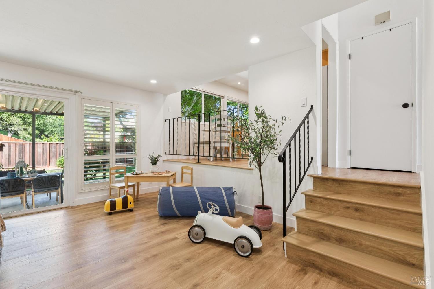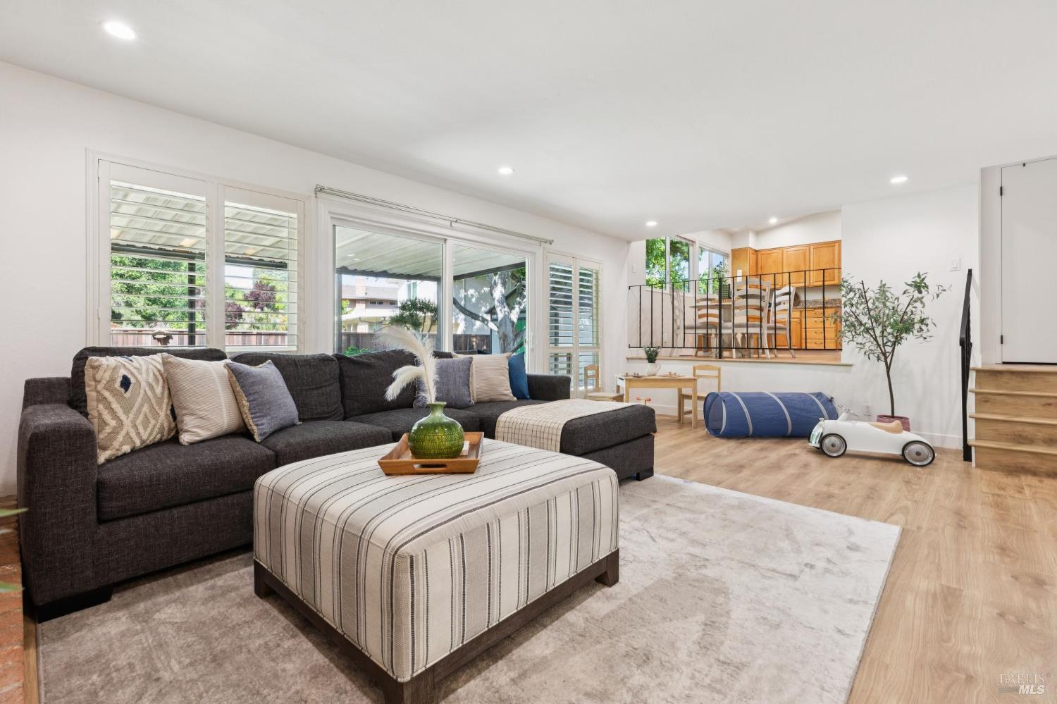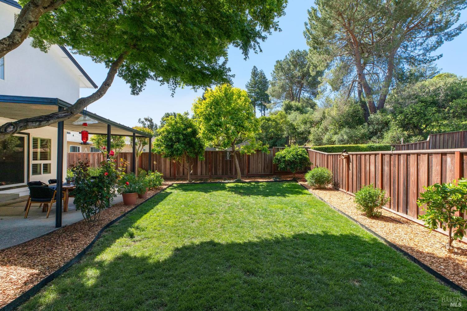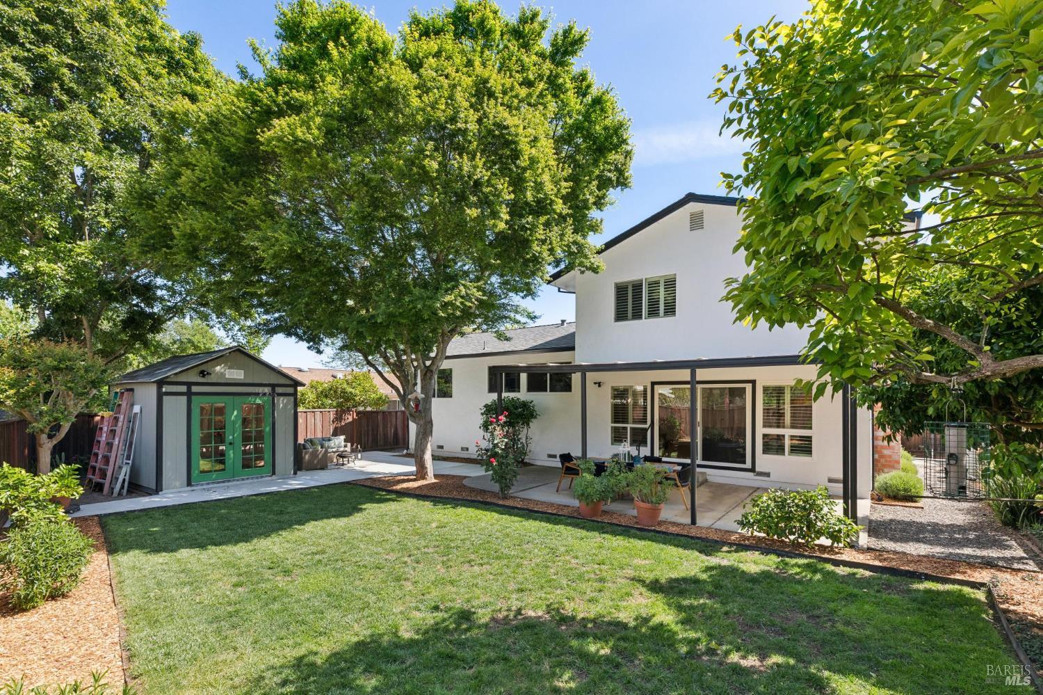 Welcome to this stunning 4-bedroom, 3-bath residence nestled in the highly sought-after Browns Valley neighborhood, where comfort, space, and thoughtful design come together in a beautifully crafted tri-level layout. From the moment you step inside, you're greeted by an inviting formal living room with dramatic cathedral ceilings that fill the space with natural light, creating an airy and elegant first impression. The adjacent formal dining room offers the perfect setting for gatherings, while the separate family room provides a warm and relaxing retreat, complete with a charming wood-burning fireplace insert ideal for cozy evenings at home. Rich, newly installed wood flooring flows seamlessly throughout the home, enhancing its modern appeal while maintaining a sense of warmth and continuity. The kitchen is perfectly positioned to overlook the backyard, making it easy to stay connected whether entertaining guests or enjoying everyday moments. Designed for both comfort and efficiency, the home features central air conditioning and solar battery back up, offering year-round climate control with energy savings in mind. Step outside to discover a private, fully fenced backyard designed for both relaxation and enjoyment. A covered patio creates the perfect space for outdoor dining or lounging, while the spacious lawn invites play and leisure. Mature fruit trees including lemon, persimmon, and orange add charm and provide seasonal harvests right at your fingertips. Adding even more versatility, the updated detached shed offers an ideal space for a home office, fitness studio, or creative work space perfect for today's flexible lifestyle needs. The attached two-car garage is equally impressive, featuring a durable epoxy floor that adds both function and a polished finish. This exceptional home offers a rare combination of style, comfort, and practical living in one of Browns Valley's most desirable settings ready to welcome you home.