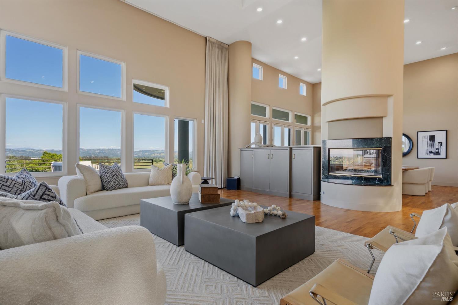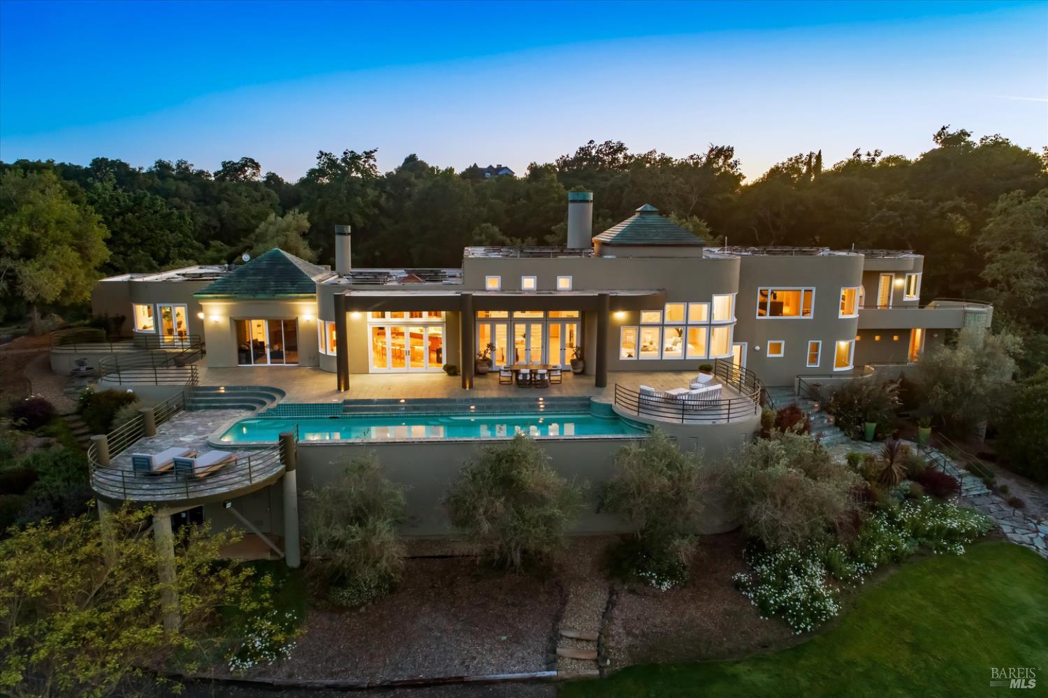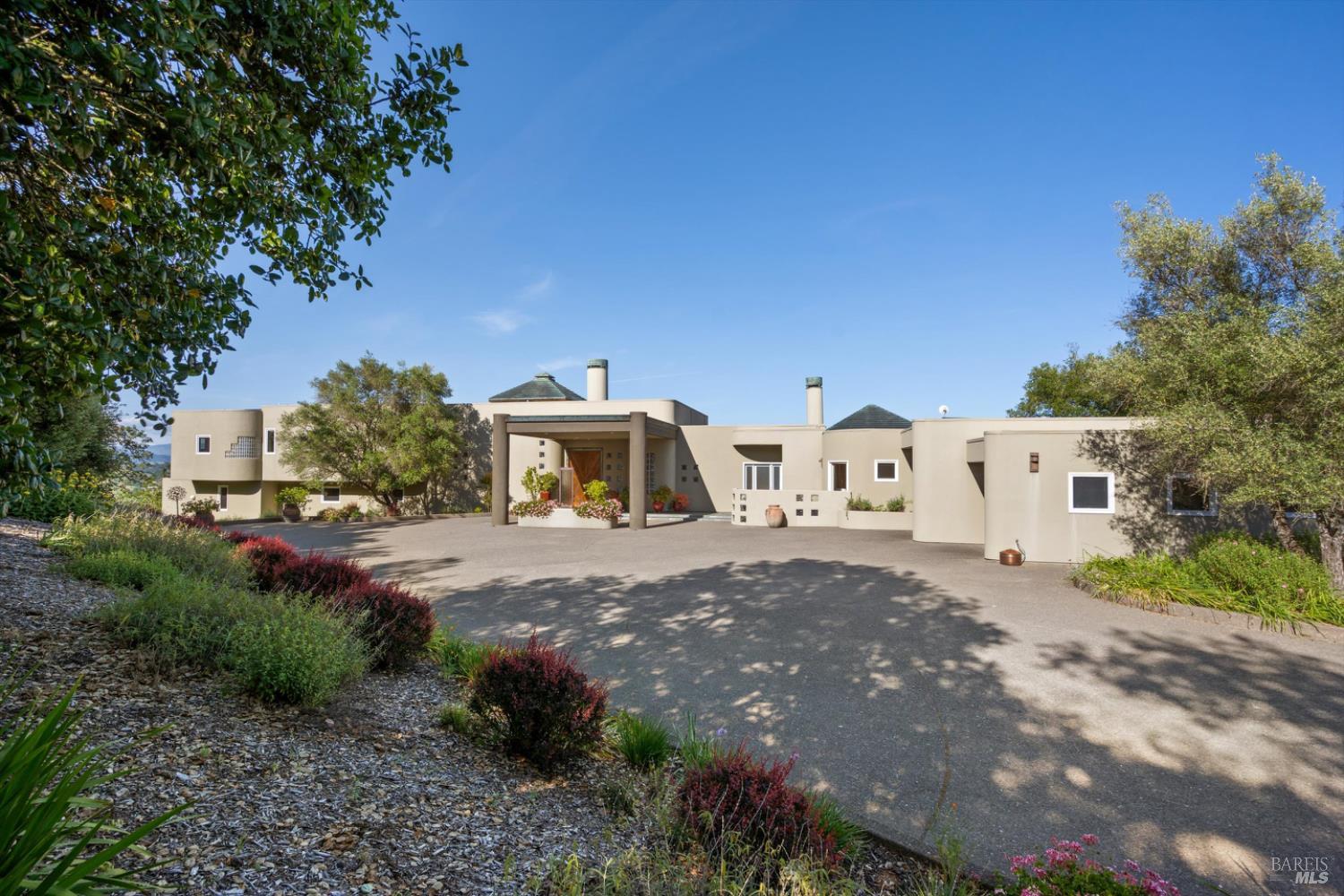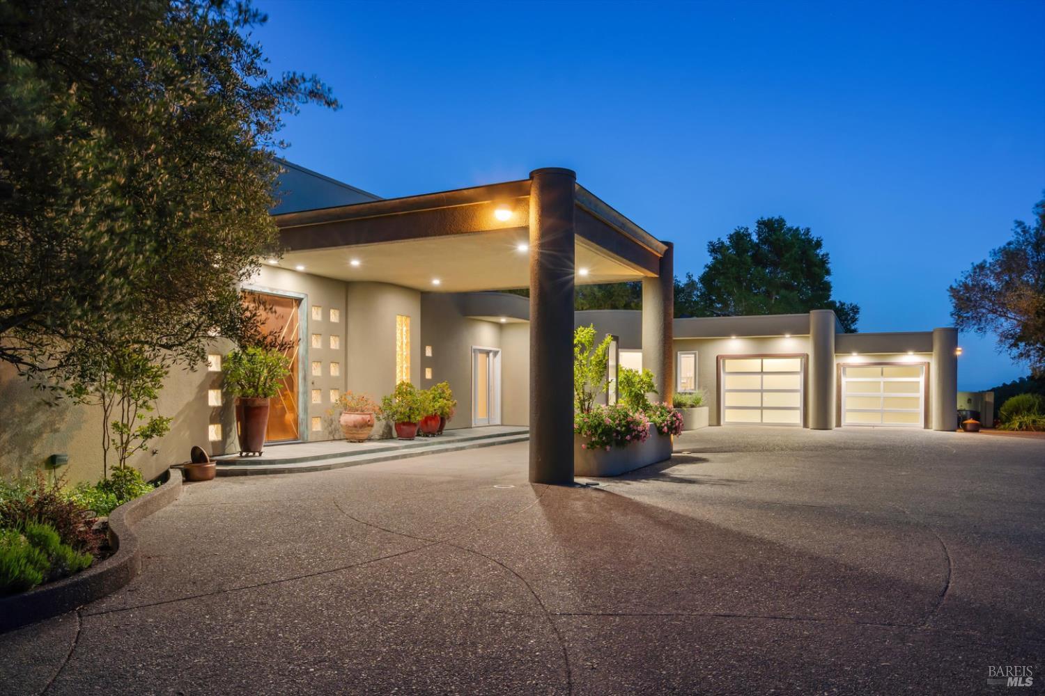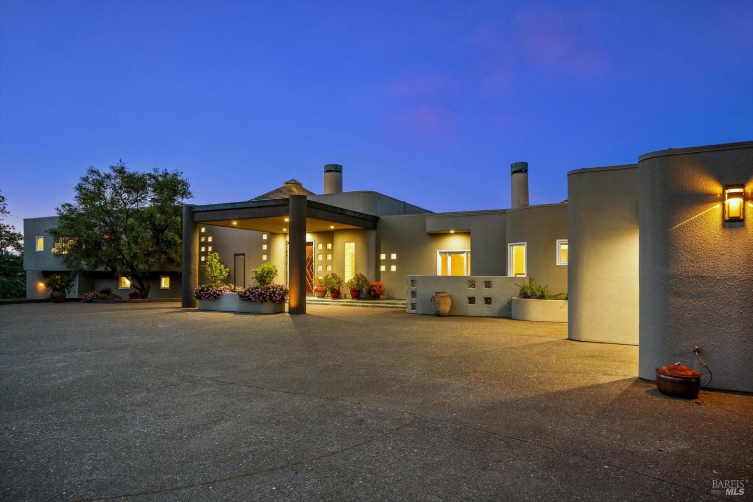 Set behind gates on approximately 26 acres in Northwest Santa Rosa, this private estate unfolds with a sense of scale, serenity, and sweeping beauty that's rare to find so close to town. From its elevated vantage point, panoramic views stretch across Sonoma County, from Geyserville to Rohnert Park, creating a constantly shifting backdrop of vineyards, hills, and open sky. The main residence spans approximately 5,500 square feet, designed to embrace both grand entertaining and relaxed everyday living. Walls of glass, soaring ceilings, and multiple view-facing decks draw the outdoors in, while the home's layout offers flexibility with multiple living spaces, two primary suites, and a dedicated office ideal for working remotely or hosting extended stays. The experience here is centered around lifestyle. Mornings begin with coffee, overlooking rolling hills, afternoons are spent poolside under the Sonoma sun, and evenings transition effortlessly to the spa, sauna, or fireside gatherings. Tucked into the landscape, a private pond offers a quiet, unexpected escape, perfect for a slow paddle, peaceful reflection, or simply unwinding at the water's edge. Whether hosting intimate dinners or larger celebrations, the setting feels both impressive and deeply comfortable. Beyond the main residence, a separate approximately 1,056 sq. ft. home provides additional versatility, ideal for guests, multigenerational living, or income potential. The land itself is equally compelling, gated, private, and thoughtfully maintained, with a sense of openness that allows for a variety of uses, from recreation to agricultural pursuits. Sustainable features, including an extensive solar system, complement the property's long-term livability. Just minutes from Santa Rosa and the airport, yet feeling worlds away, this is a property that delivers both convenience and complete escape, an opportunity to live expansively in the heart of Sonoma County.