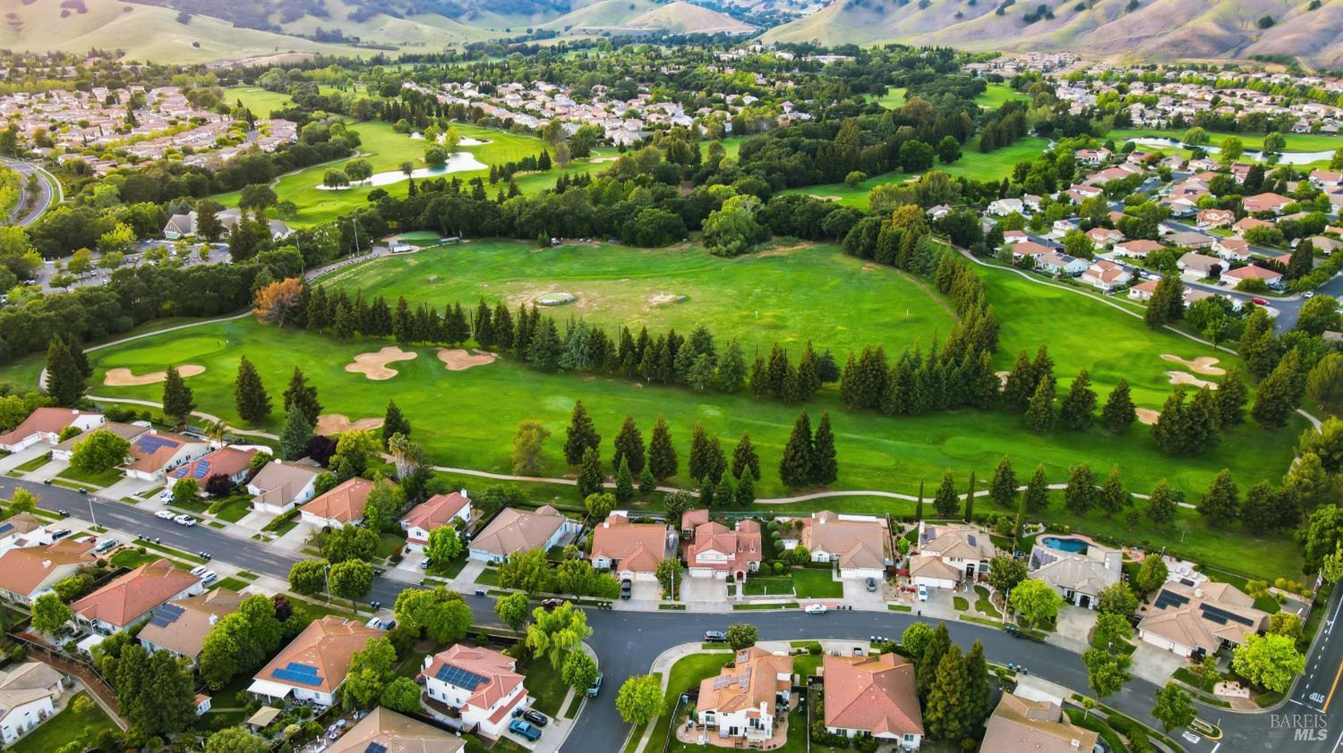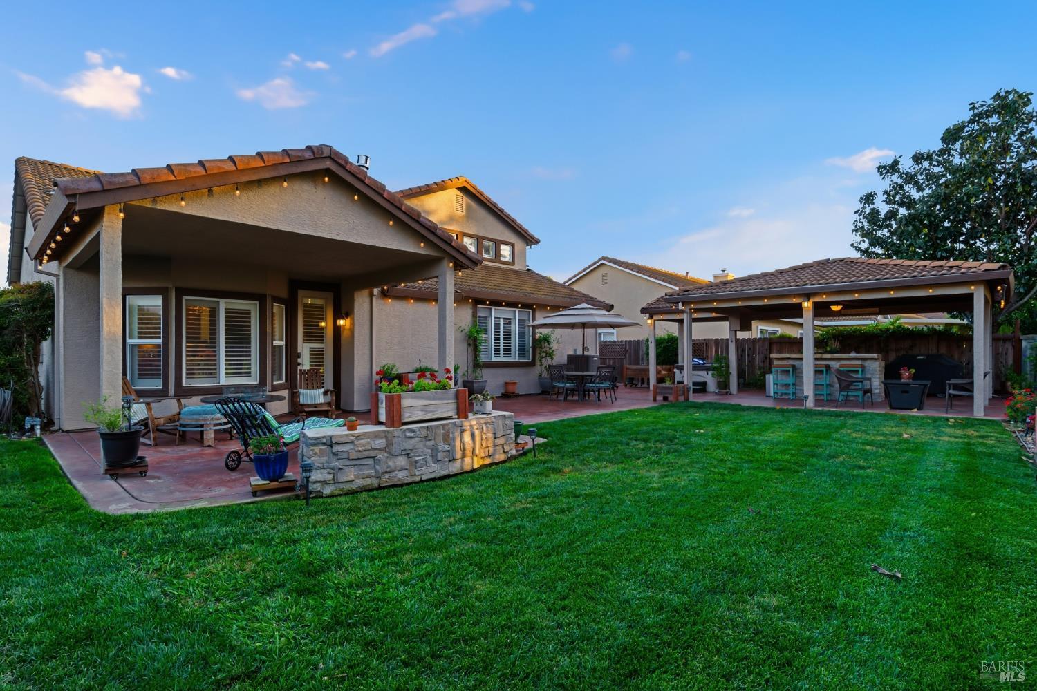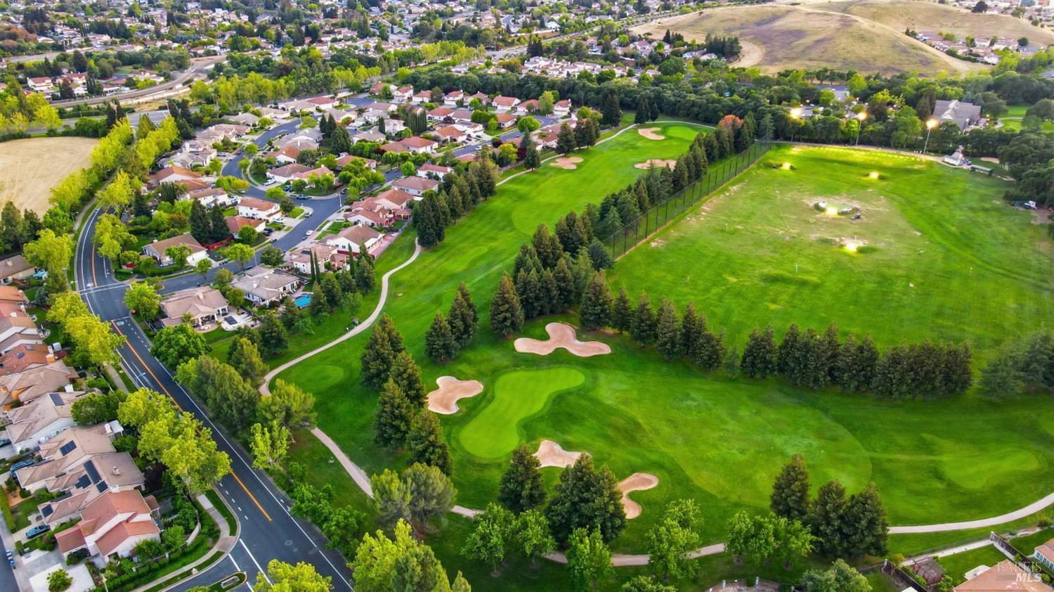 Welcome to resort-style living at its finest in this beautifully appointed home that lives like a single story, ideally situated on the 9th fairway in one of Fairfield's most desirable golf course communities. Designed for both comfort and entertaining, this residence features a spacious and functional layout with the primary bedroom and bathroom conveniently located on the main level. The expansive kitchen is a true centerpiece, complete with a large island, double oven, wine refrigerator, and ample space for gathering with family and friends. Plantation shutters throughout the home add timeless elegance and charm. Step outside to your private backyard retreat, where indoor-outdoor living comes to life. Enjoy a covered outdoor kitchen with party lighting, two new beverage refrigerators, a hot tub, raised planter beds, and both front and back lawn areasperfect for entertaining or relaxing while taking in golf course views. Additional highlights include a 3-car garage, security system, tile roof, and laundry room. HVAC, water heater, garbage disposal, gas fireplace, shutters, indoor paint, wood floors have all been updated in the last 5 years. Residents also enjoy access to community amenities including a pool and tennis courts. This is a rare opportunity to own a thoughtfully designed home that blends everyday convenience with a true resort lifestyle.
