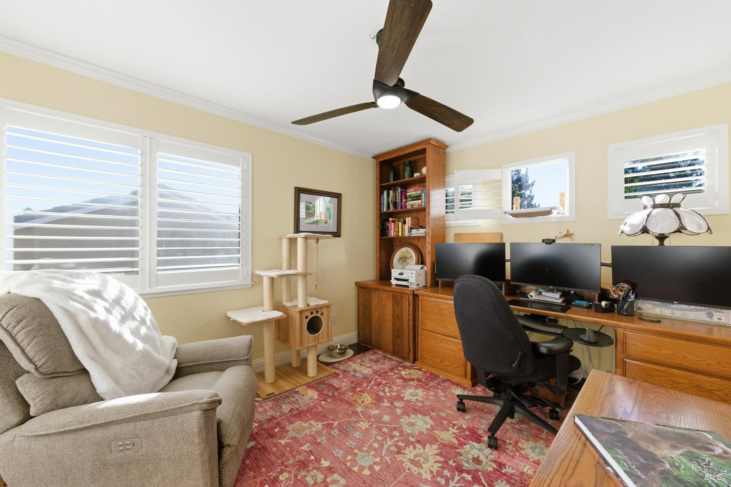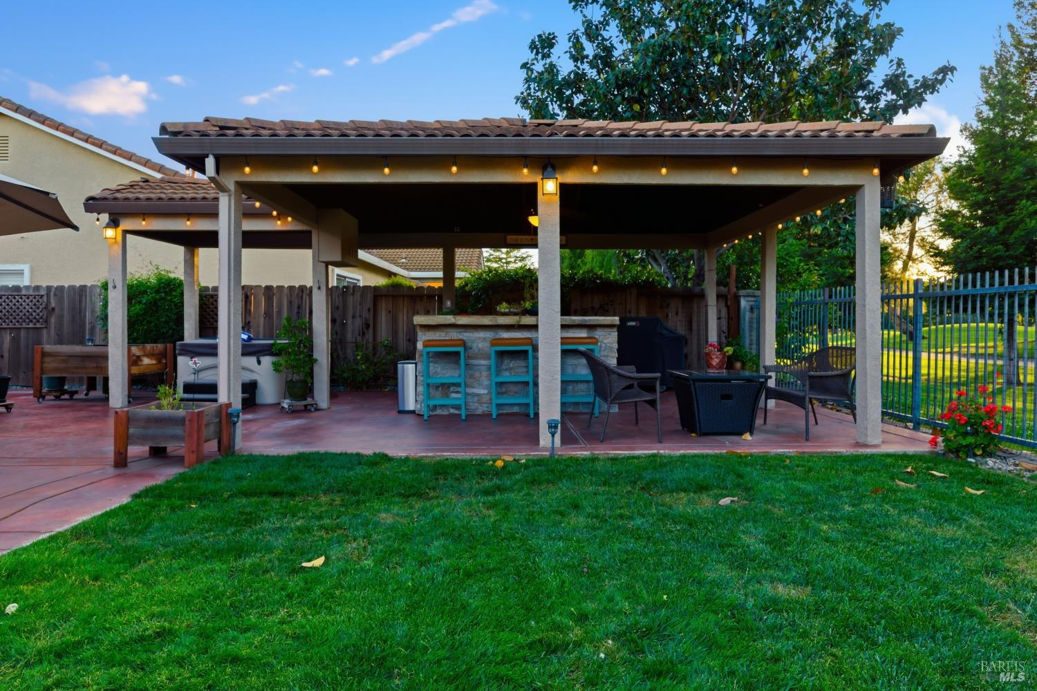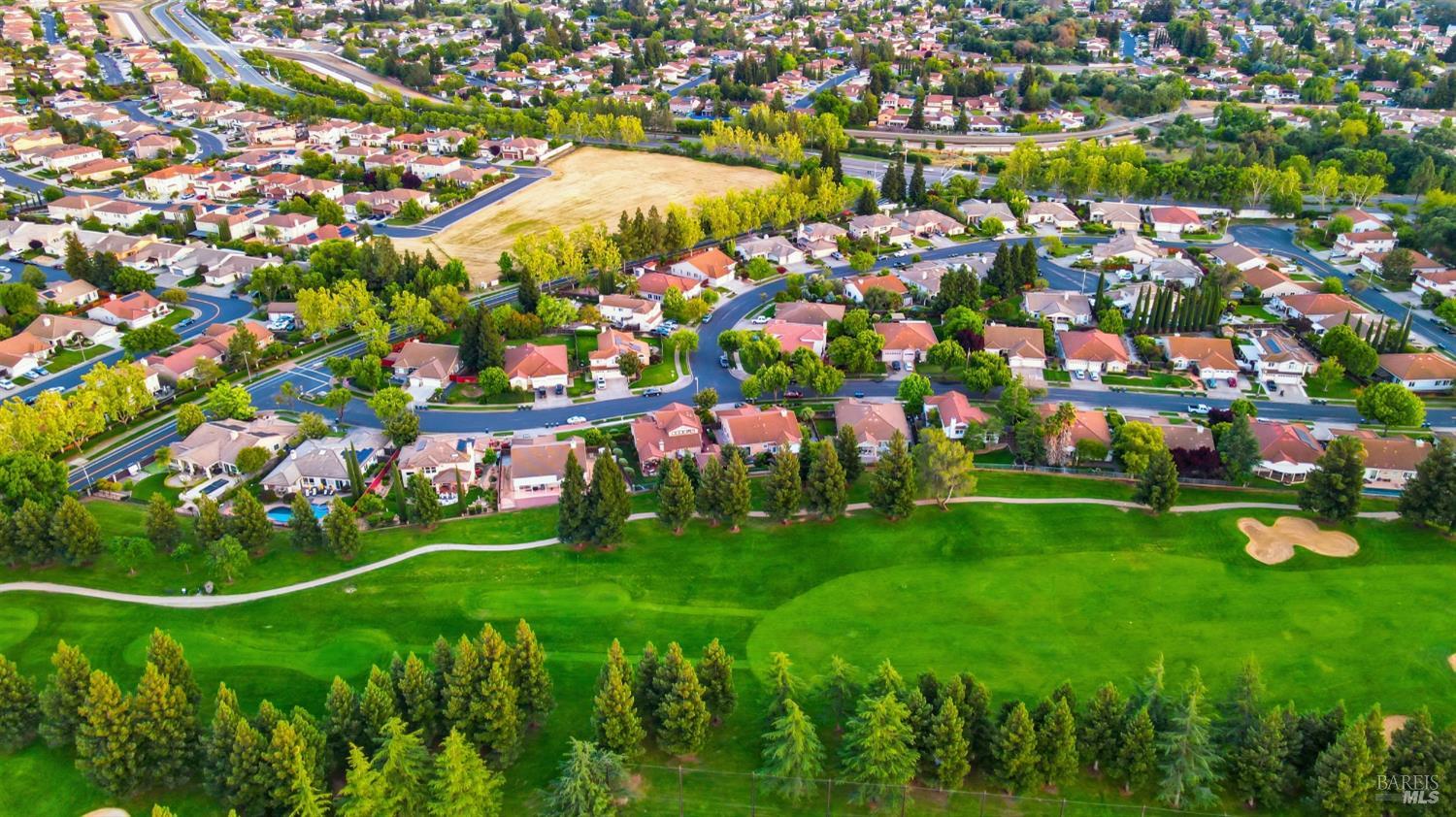 Welcome to resort-style living at its finest in this beautifully appointed home that lives like a single story, ideally situated on the 9th fairway in one of Fairfield's most desirable golf course communities. Designed for both comfort and entertaining, this residence features a spacious and functional layout with the primary bedroom and bathroom conveniently located on the main level. The expansive kitchen is a true centerpiece, complete with a large island, double oven, wine refrigerator, and ample space for gathering with family and friends. Plantation shutters throughout the home add timeless elegance and charm. Step outside to your private backyard retreat, where indoor-outdoor living comes to life. Enjoy a covered outdoor kitchen with party lighting, two new beverage refrigerators, a hot tub, raised planter beds, and both front and back lawn areasperfect for entertaining or relaxing while taking in golf course views. Additional highlights include a 3-car garage, security system, tile roof, and laundry room. HVAC, water heater, garbage disposal, gas fireplace, shutters, indoor paint, wood floors have all been updated in the last 5 years. Residents also enjoy access to community amenities including a pool and tennis courts. This is a rare opportunity to own a thoughtfully designed home that blends everyday convenience with a true resort lifestyle.