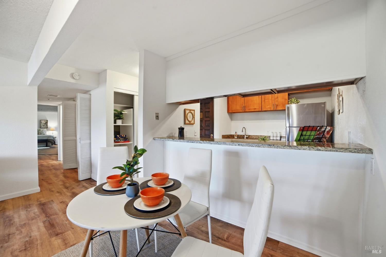 Great opportunity for the first-time homebuyer or Investor who is looking for a move-in ready and recently updated spacious 2 bedroom, 1.5 bath home. This bottom floor unit has easy access from the parking area with a lovely courtyard area and Western views. Upgrades include new appliances not even used, new flooring and fresh paint through- out. Kitchen remodel offers a bar for extra dining options, granite counter tops and walnut cabinets. Half bath offers granite countertop and walnut cabinet with an extra vanity. Primary bedroom is a large space for possible live/work options with a sliding glass door to the patio. This Bennett Valley complex is perfectly located with close proximity for shopping, dining and quick access to Hwy 12 for commuters. Enjoy the pool and landscaped grounds, just in time for summer parties. HOA includes trash, water, exterior insurance and maintenance of common areas, grounds, pool, roof, elevator and parking garage. Don't miss this one!