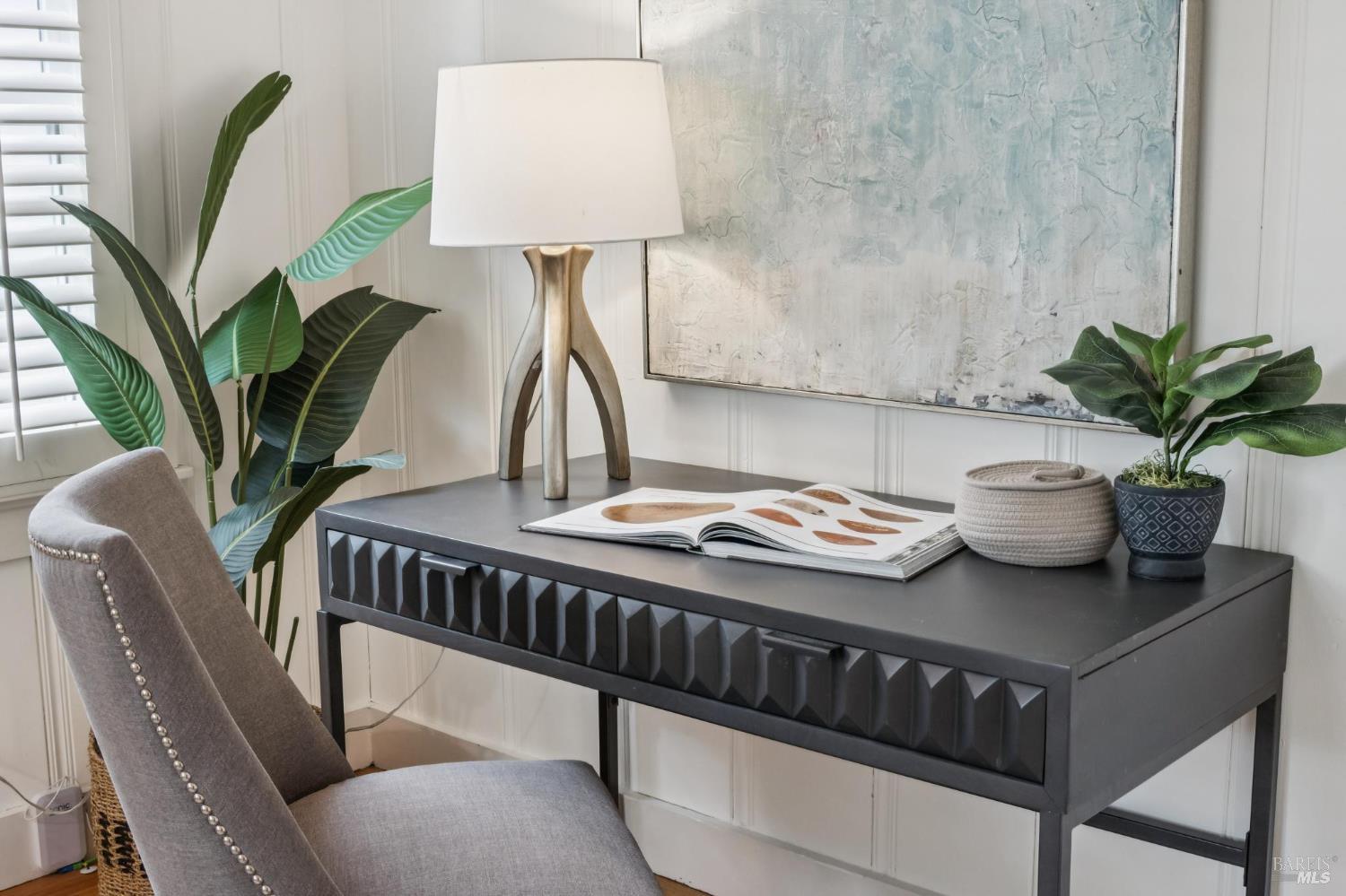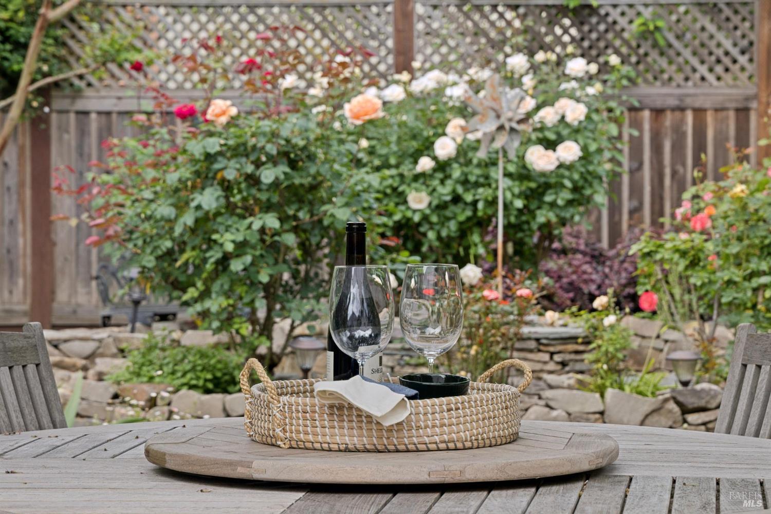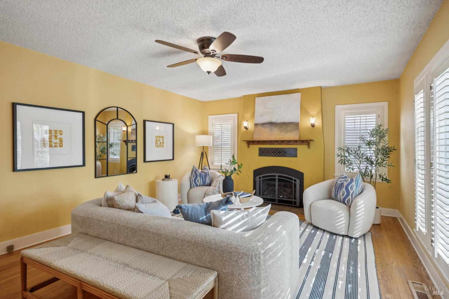 Set in Santa Rosa's beloved JC neighborhood, this 1936 English Tudor Revival has been lovingly kept and tastefully remodeled -- a rare blend of storybook character and modern comfort. A winding path leads through mature landscaping to an iconic arched Tudor door beneath a classic striped awning. A long private driveway runs alongside the home, providing abundant off-street parking and leading through a gate to a private rear sanctuary. Inside, beautiful hardwood floors, wide arched doorways, and a circular floor plan make the home live far larger than its footprint suggests. A gas insert fireplace with wrought iron accents anchors the generous living room, and the formal dining room comfortably seats six. The remodeled island kitchen features custom alder cabinets, stainless appliances, slate floors, an arched sink window, and a separate breakfast room. Two bedrooms plus a dedicated office with closet -- thoughtfully positioned across from the living areas -- offer ideal flexibility for work-from-home. The remodeled bath includes a tiled floor, walk-in shower, and pedestal sink. Updated central heat, a tankless water heater, dual-pane windows, plantation shutters, and in-home laundry add everyday ease. French doors open to a flagstone patio and wisteria-covered pergola with teak dining table -- the heart of a professionally designed garden unfolding across a 7,318 sq ft lot, with raised vegetable beds, a circular rose garden, and a charming potting shed. A detached one-car garage with separate storage room completes the property. Walkable to Town & Country, Coddingtown, Whole Foods, Montgomery Village, schools, and transit -- minutes to downtown Santa Rosa and Sonoma wine country. Truly must be seen to be appreciated. Beautifully staged and easy to show.