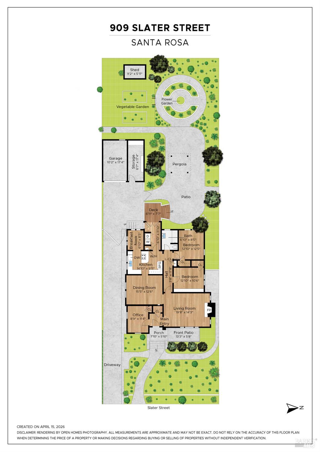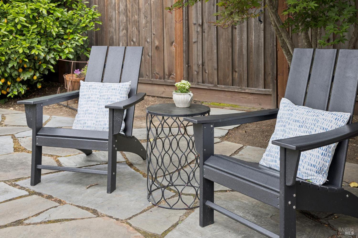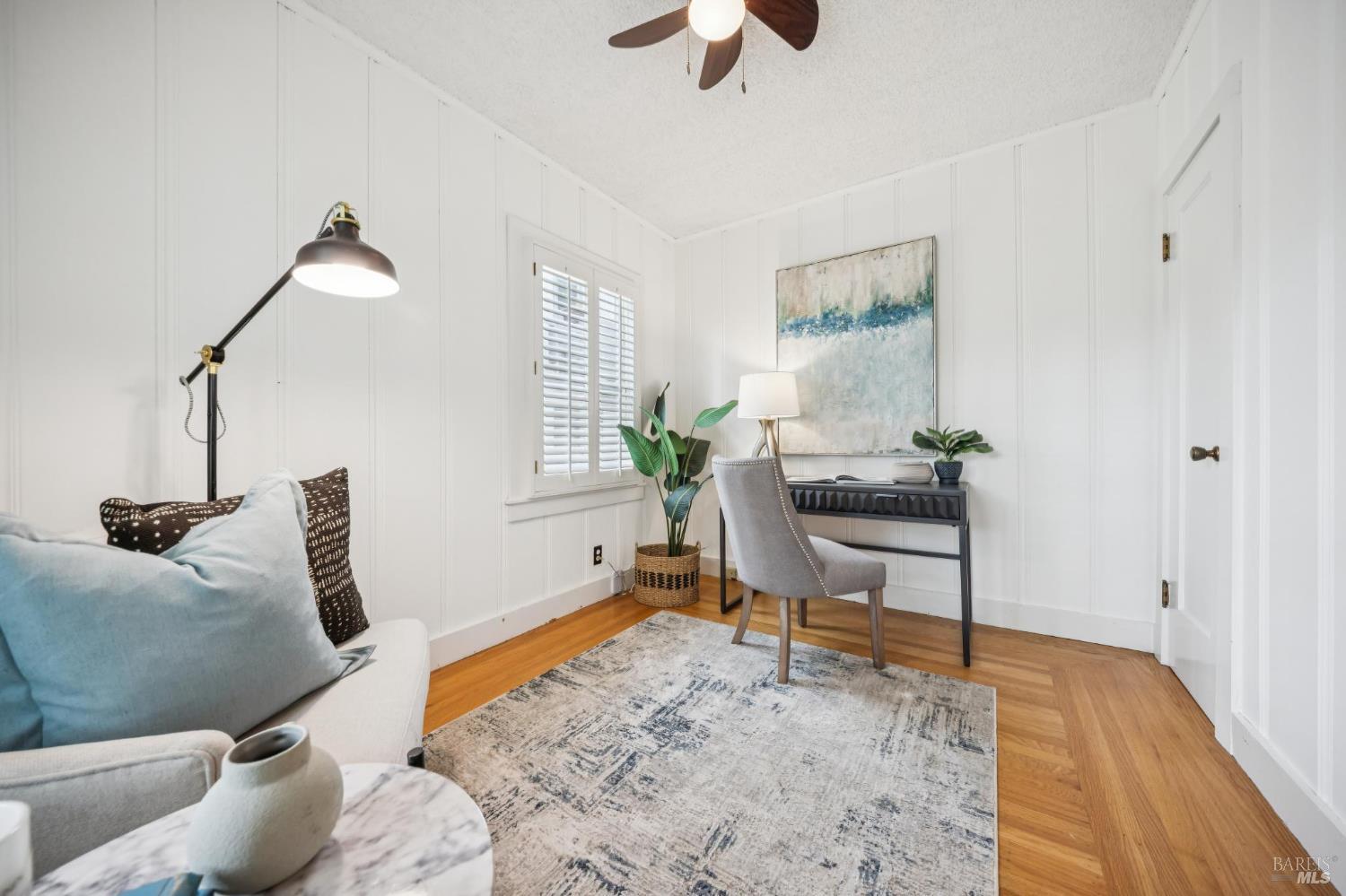 Set in Santa Rosa's beloved JC neighborhood, this 1936 English Tudor Revival has been lovingly kept and tastefully remodeled -- a rare blend of storybook character and modern comfort. A winding path leads through mature landscaping to an iconic arched Tudor door beneath a classic striped awning. A long private driveway runs alongside the home, providing abundant off-street parking and leading through a gate to a private rear sanctuary. Inside, beautiful hardwood floors, wide arched doorways, and a circular floor plan make the home live far larger than its footprint suggests. A gas insert fireplace with wrought iron accents anchors the generous living room, and the formal dining room comfortably seats six. The remodeled island kitchen features custom alder cabinets, stainless appliances, slate floors, an arched sink window, and a separate breakfast room. Two bedrooms plus a dedicated office with closet -- thoughtfully positioned across from the living areas -- offer ideal flexibility for work-from-home. The remodeled bath includes a tiled floor, walk-in shower, and pedestal sink. Updated central heat, a tankless water heater, dual-pane windows, plantation shutters, and in-home laundry add everyday ease. French doors open to a flagstone patio and wisteria-covered pergola with teak dining table -- the heart of a professionally designed garden unfolding across a 7,318 sq ft lot, with raised vegetable beds, a circular rose garden, and a charming potting shed. A detached one-car garage with separate storage room completes the property. Walkable to Town & Country, Coddingtown, Whole Foods, Montgomery Village, schools, and transit -- minutes to downtown Santa Rosa and Sonoma wine country. Truly must be seen to be appreciated. Beautifully staged and easy to show.
