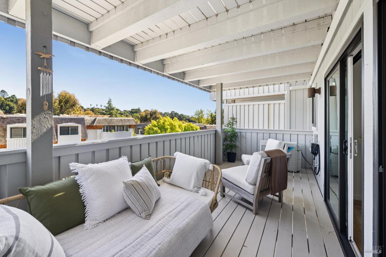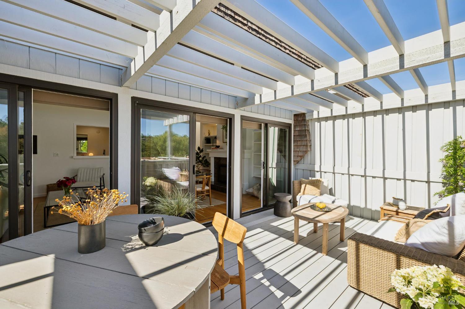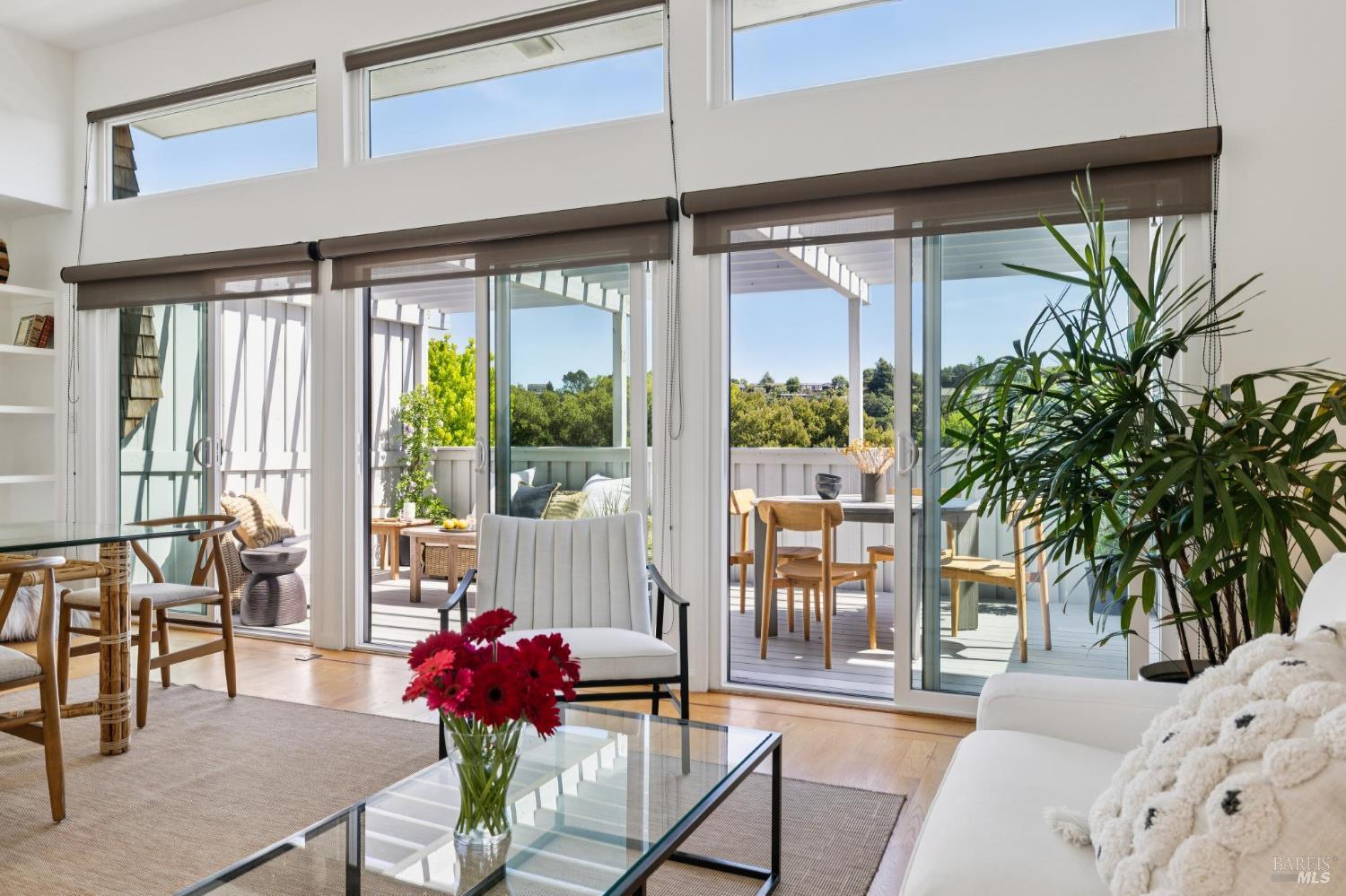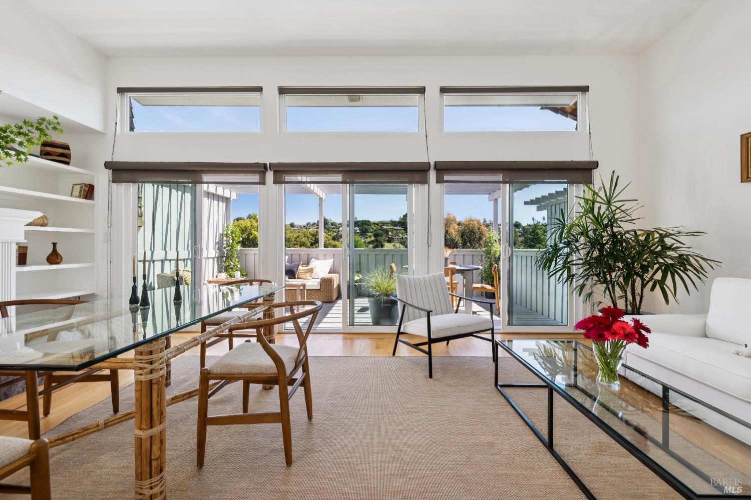 Peacock Gap offers a vacation lifestyle centered around outdoor living and connection to nature, with easy access to Peacock Gap Golf Club, China Camp State Park, McNears Beach Park, and Peacock Park. This 3-bedroom, 2.5-bath townhome offers approximately 1,900 sq ft of living space, including two en-suite bedrooms. The open main level features hardwood floors throughout, generous ceiling height in the living area, and a fireplace. Floor-to-ceiling windows and sliding glass doors throughout bring in natural light and surrounding greenery. The living room opens to a large deck, with a second large deck off the lower-level en-suite providing added privacy. Primary en-suite located on the main level. Kitchen with ample counter space, abundant cabinetry, and skylight. Additional skylight above stairwell. Attached two-car garage with storage. Two walk-in closets.