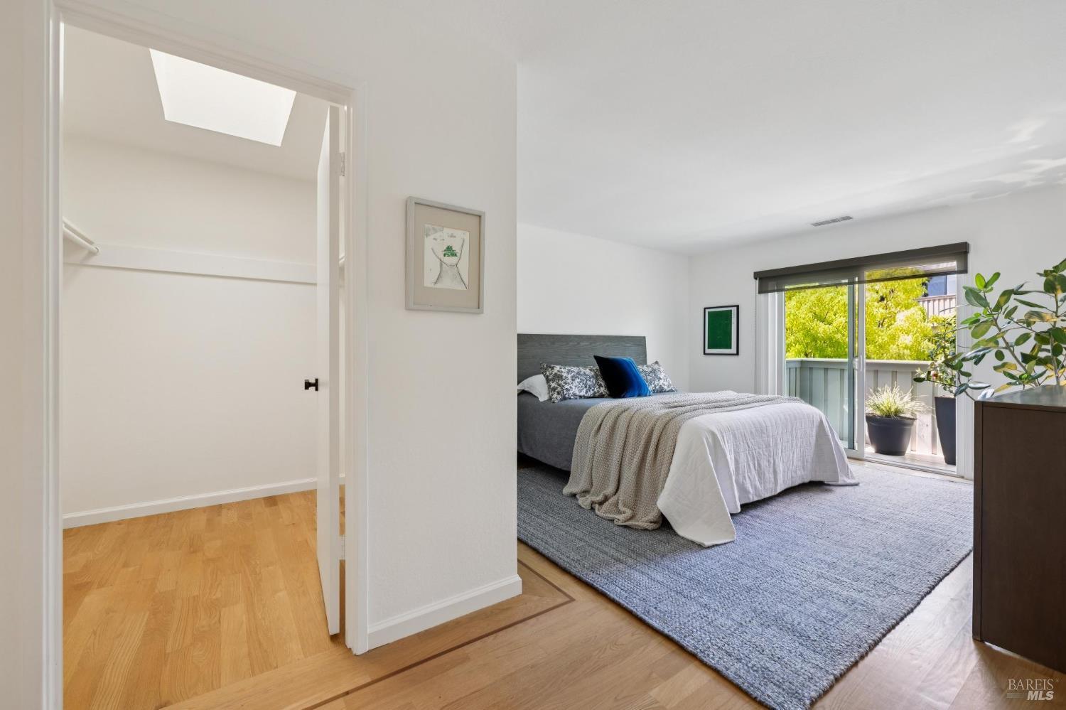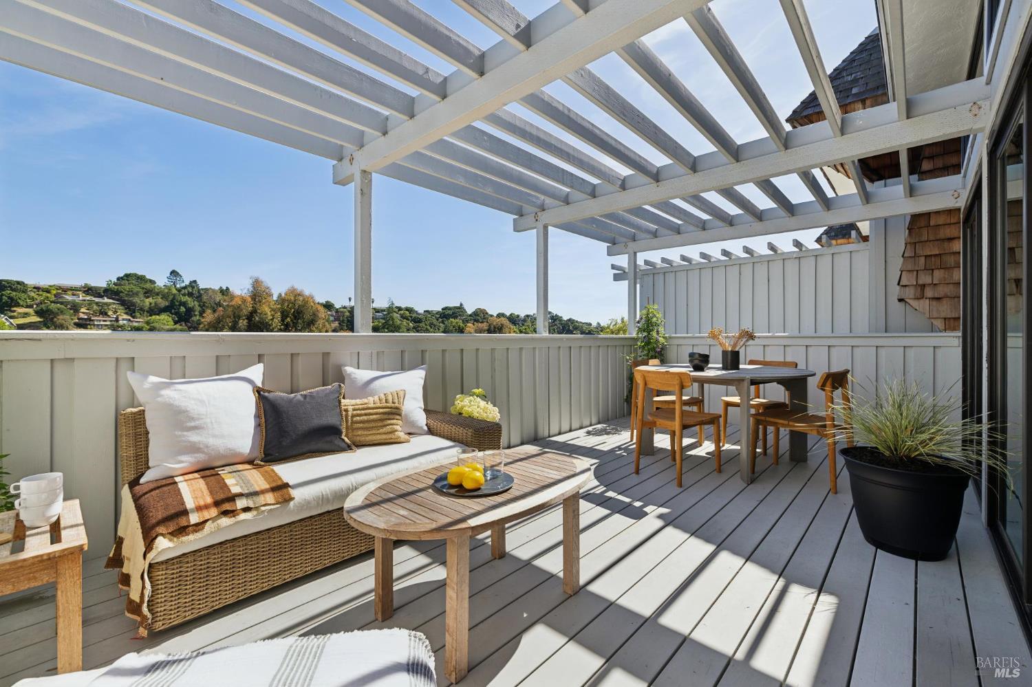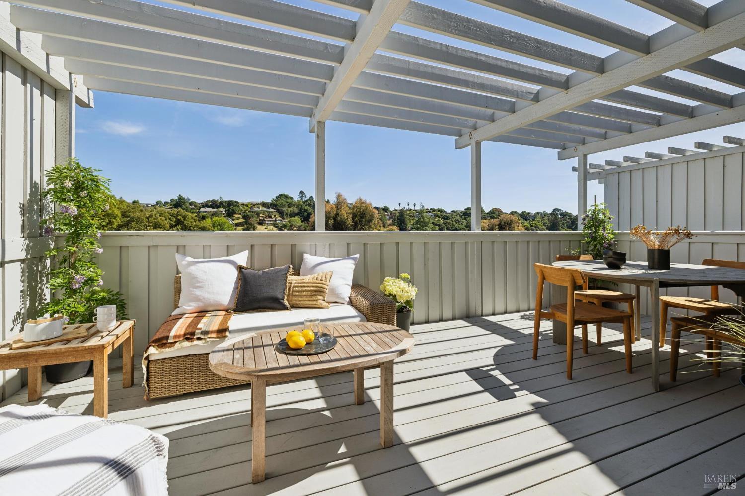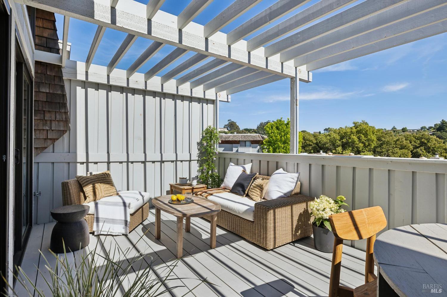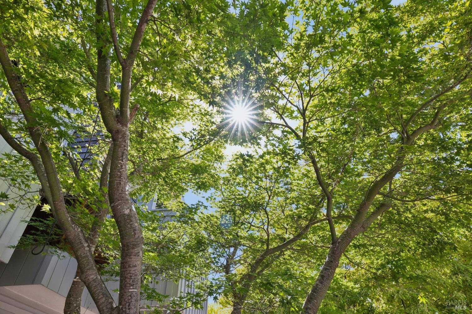 Peacock Gap offers a vacation lifestyle centered around outdoor living and connection to nature, with easy access to Peacock Gap Golf Club, China Camp State Park, McNears Beach Park, and Peacock Park. This 3-bedroom, 2.5-bath townhome offers approximately 1,900 sq ft of living space, including two en-suite bedrooms. The open main level features hardwood floors throughout, generous ceiling height in the living area, and a fireplace. Floor-to-ceiling windows and sliding glass doors throughout bring in natural light and surrounding greenery. The living room opens to a large deck, with a second large deck off the lower-level en-suite providing added privacy. Primary en-suite located on the main level. Kitchen with ample counter space, abundant cabinetry, and skylight. Additional skylight above stairwell. Attached two-car garage with storage. Two walk-in closets.