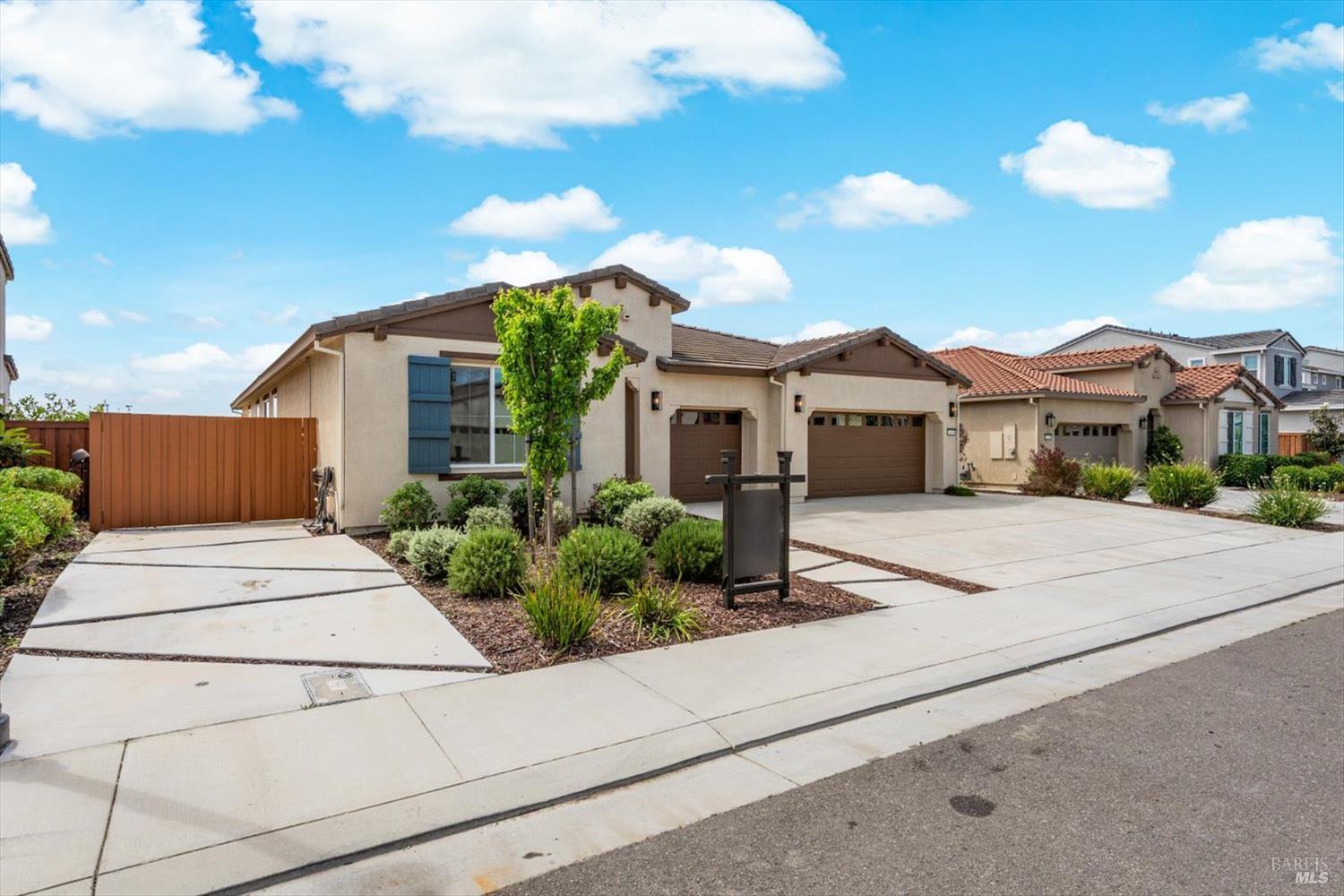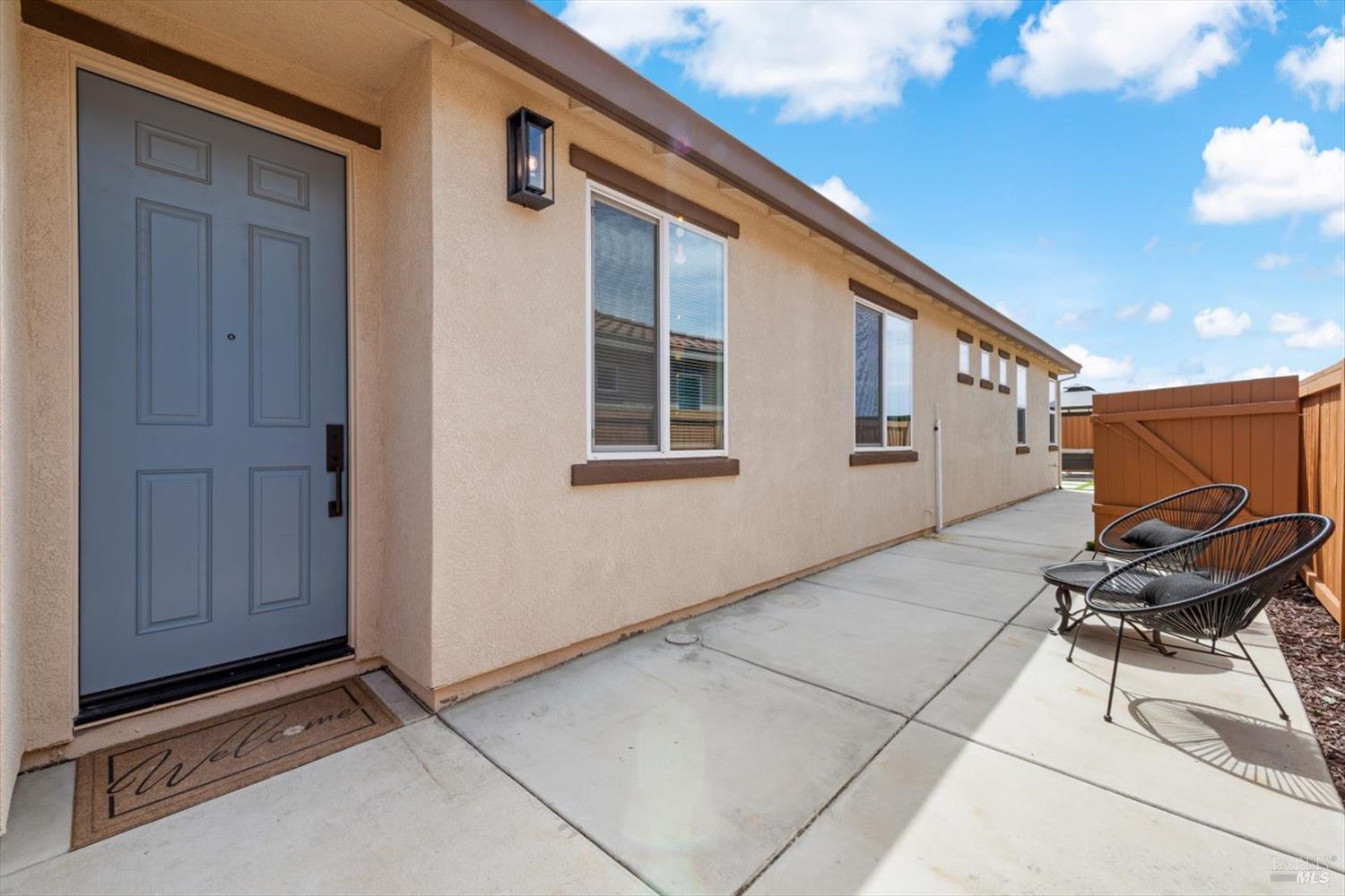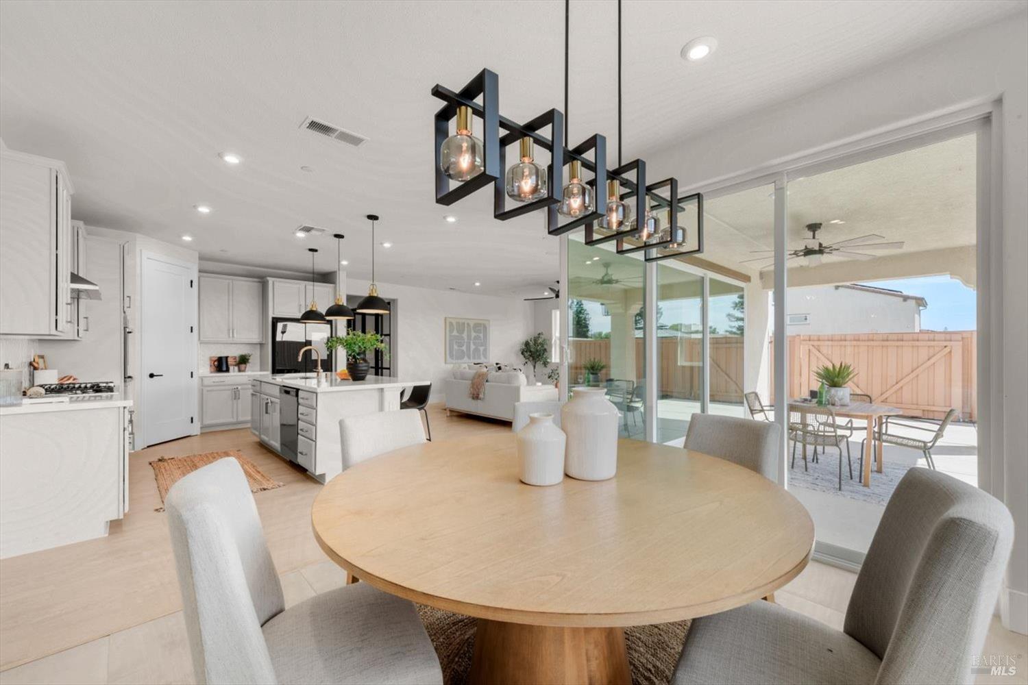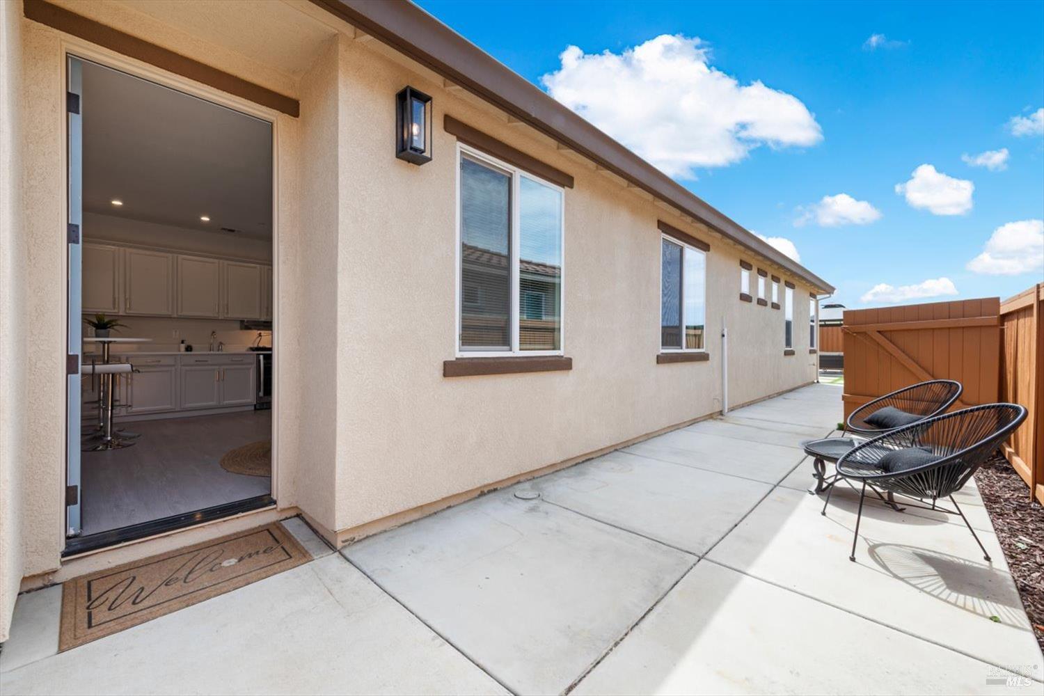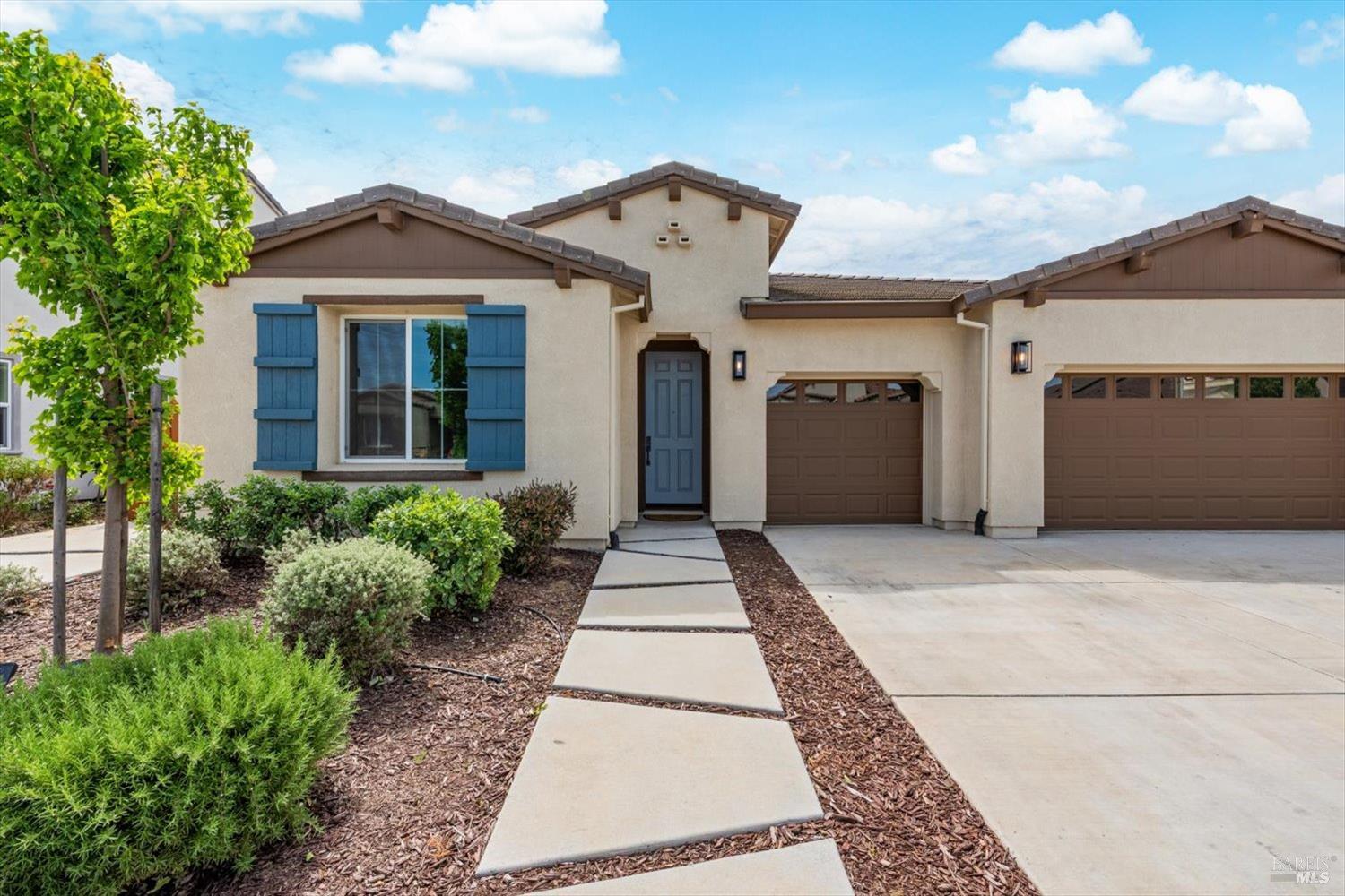 1455 Blossom Way offers nearly 3,000 square feet of single-story living, a 3-car garage, and an attached private, independent living suite. The main home is defined by a floor-to-ceiling, expansive sliding glass door that creates a seamless connection to the outdoors. Built in 2022, this 4-bedroom plus office, 3.5-bathroom home blends modern design with today's living needs. A welcoming entry and elegant hallway lead into the main living space, featuring 9-foot ceilings, where the kitchen, dining, and living areas come together in an open and inviting layout. A striking floor-to-ceiling, sliding glass door spans two walls, creating a seamless connection to the backyard, taking indoor-outdoor living to a whole new level. The kitchen showcases a transitional aesthetic with light gray cabinetry, gold hardware, quartz countertops, a gas cooktop, and a walk-in pantry, blending classic design with current finishes that feel both fresh and timeless. The primary suite offers a spacious retreat with an oversized tiled walk-in shower, dual sinks, and a large walk-in closet with built-in organizers. A dedicated office features a unique interior glass window, creating a connected workspace while still offering separation. Additional highlights include a walk-in laundry room with added storage. Privately positioned, the attached suite includes its own entrance, living room, bedroom, kitchenette, shower stall, walk-in closet, and laundry hookups and private patio. This flexible space works well for extended living, guests, or additional income potential. The backyard provides generous space to gather whether you want to relax or play games on the open turf, all while backing to open space for added privacy. With tall the benefits of newer construction, including energy efficiency, modern systems, plus completed landscaping, this home is move-in ready and conveniently located just minutes from I-80. If you have been searching for true multigenerational living with elevated design, this home delivers.