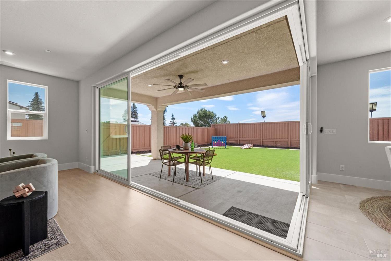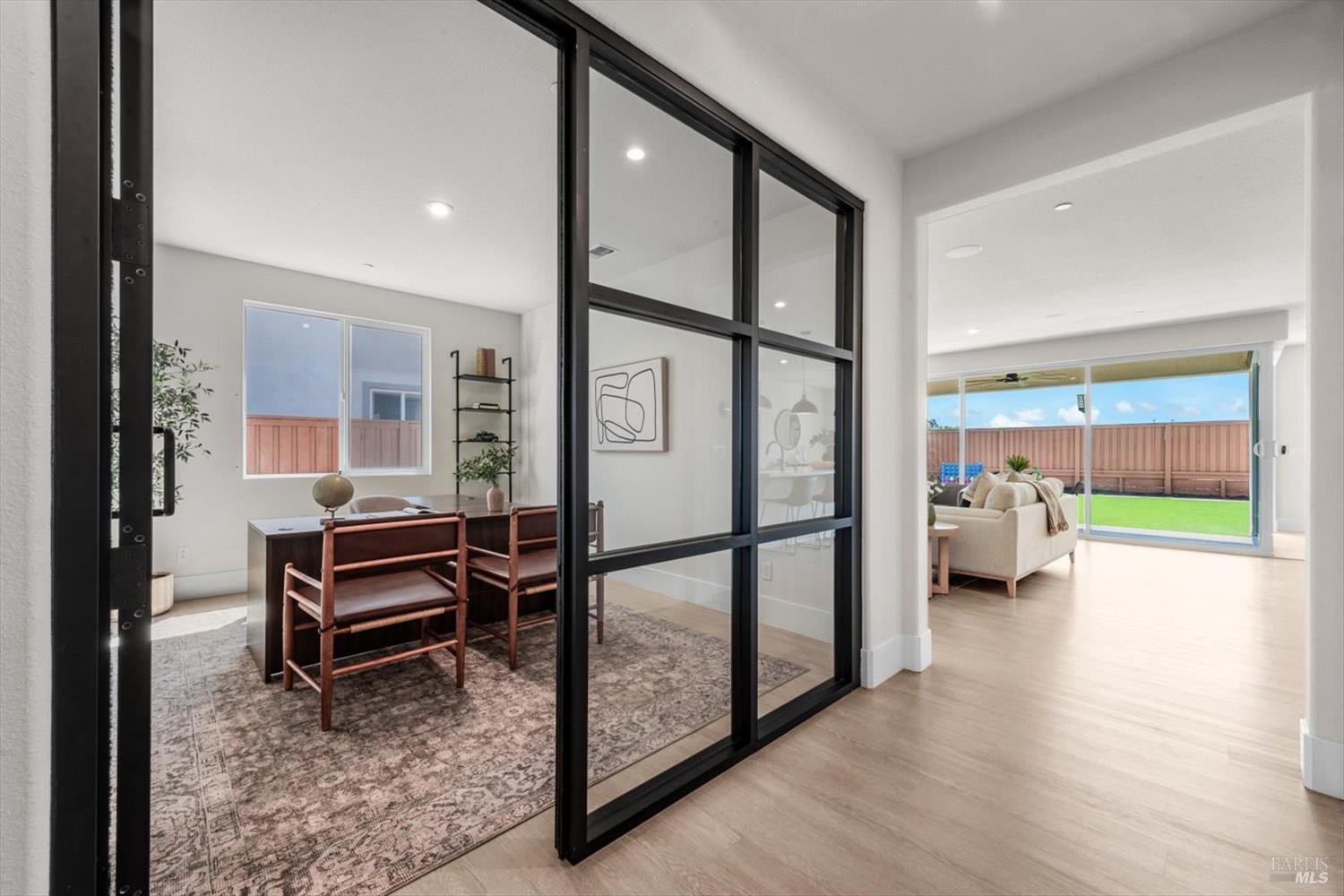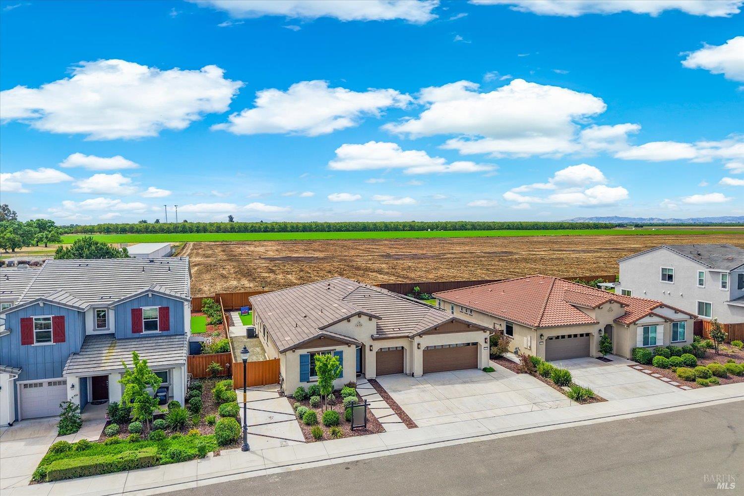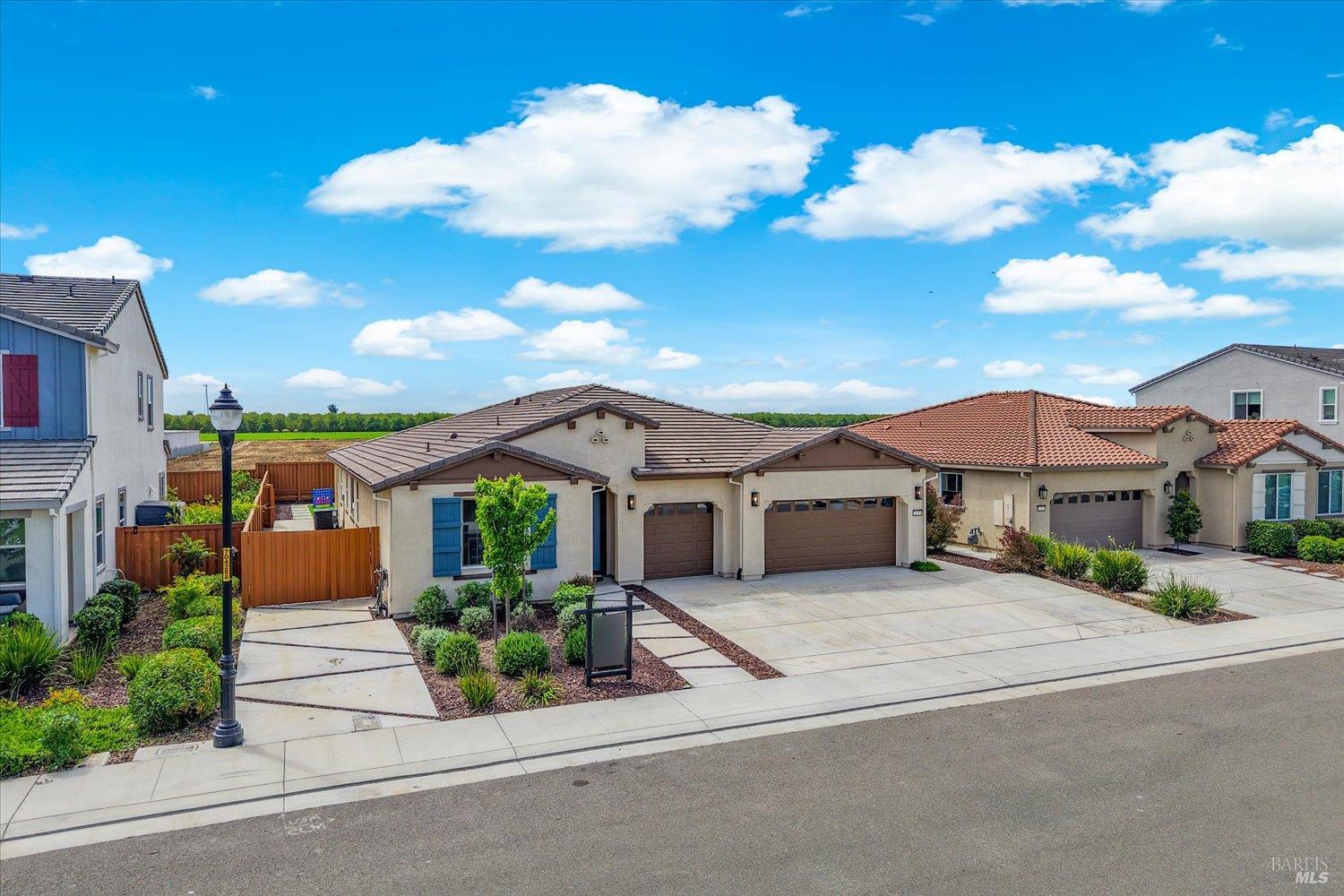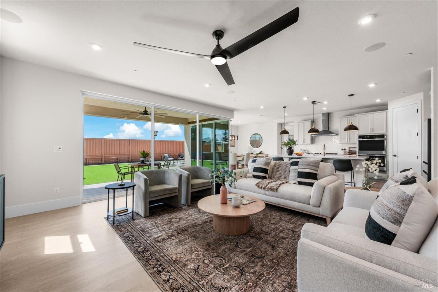 1455 Blossom Way offers nearly 3,000 square feet of single-story living, a 3-car garage, and an attached private, independent living suite. The main home is defined by a floor-to-ceiling, expansive sliding glass door that creates a seamless connection to the outdoors. Built in 2022, this 4-bedroom plus office, 3.5-bathroom home blends modern design with today's living needs. A welcoming entry and elegant hallway lead into the main living space, featuring 9-foot ceilings, where the kitchen, dining, and living areas come together in an open and inviting layout. A striking floor-to-ceiling, sliding glass door spans two walls, creating a seamless connection to the backyard, taking indoor-outdoor living to a whole new level. The kitchen showcases a transitional aesthetic with light gray cabinetry, gold hardware, quartz countertops, a gas cooktop, and a walk-in pantry, blending classic design with current finishes that feel both fresh and timeless. The primary suite offers a spacious retreat with an oversized tiled walk-in shower, dual sinks, and a large walk-in closet with built-in organizers. A dedicated office features a unique interior glass window, creating a connected workspace while still offering separation. Additional highlights include a walk-in laundry room with added storage. Privately positioned, the attached suite includes its own entrance, living room, bedroom, kitchenette, shower stall, walk-in closet, and laundry hookups and private patio. This flexible space works well for extended living, guests, or additional income potential. The backyard provides generous space to gather whether you want to relax or play games on the open turf, all while backing to open space for added privacy. With tall the benefits of newer construction, including energy efficiency, modern systems, plus completed landscaping, this home is move-in ready and conveniently located just minutes from I-80. If you have been searching for true multigenerational living with elevated design, this home delivers.