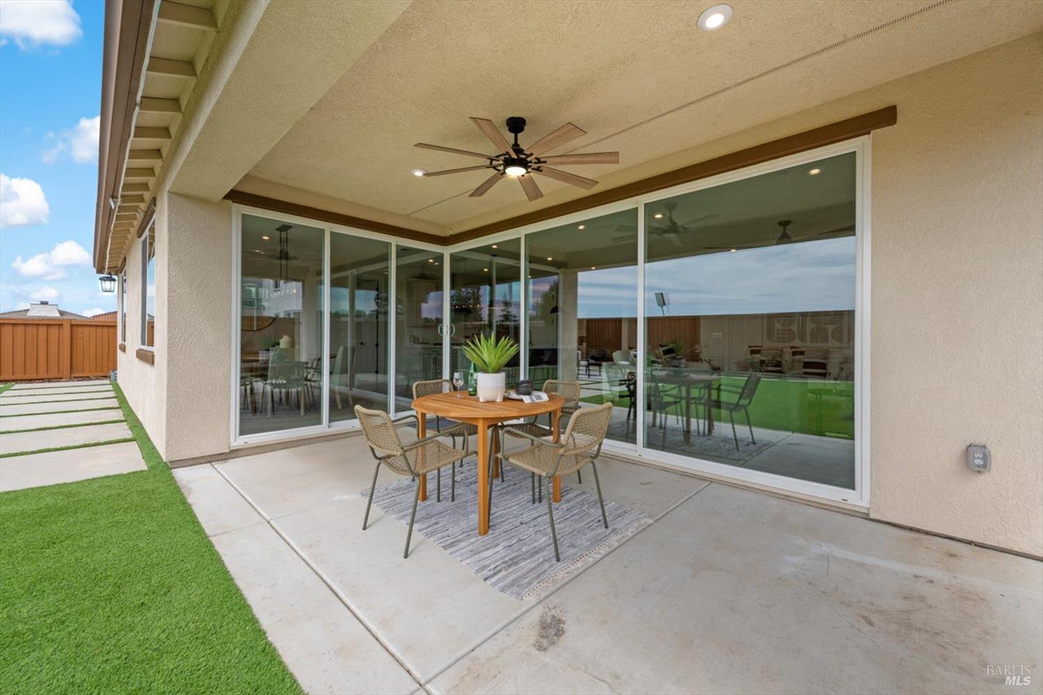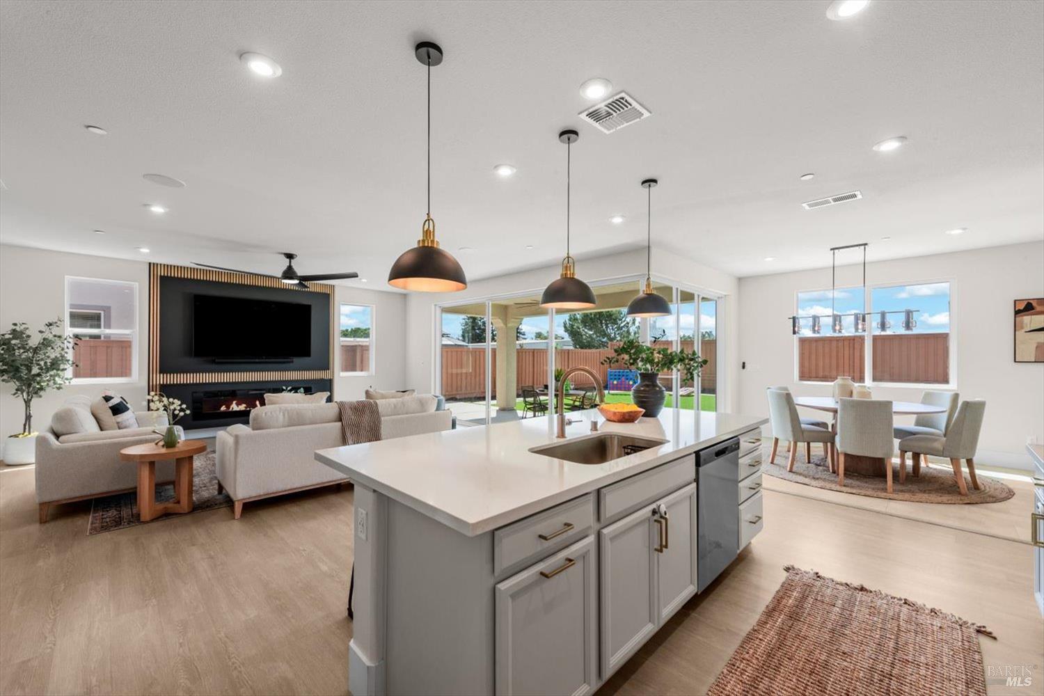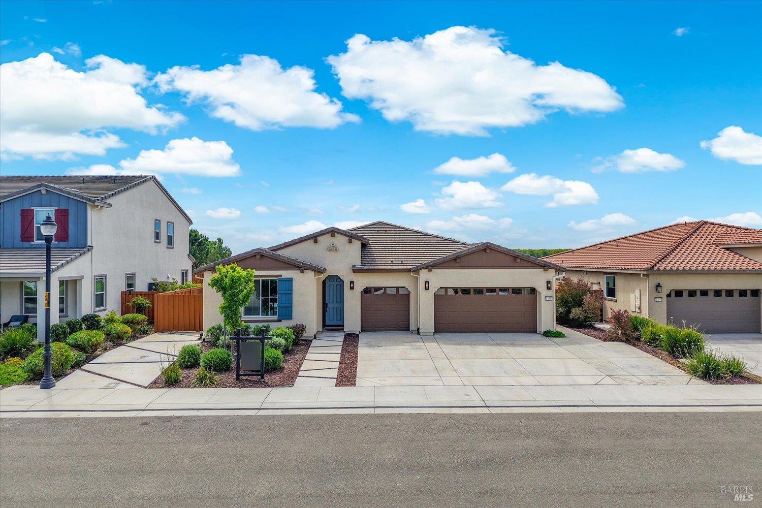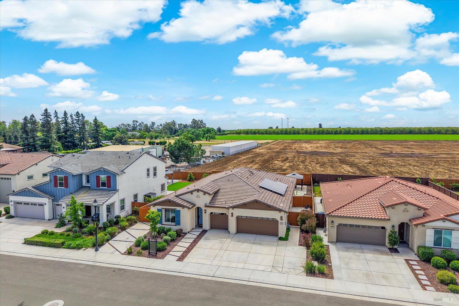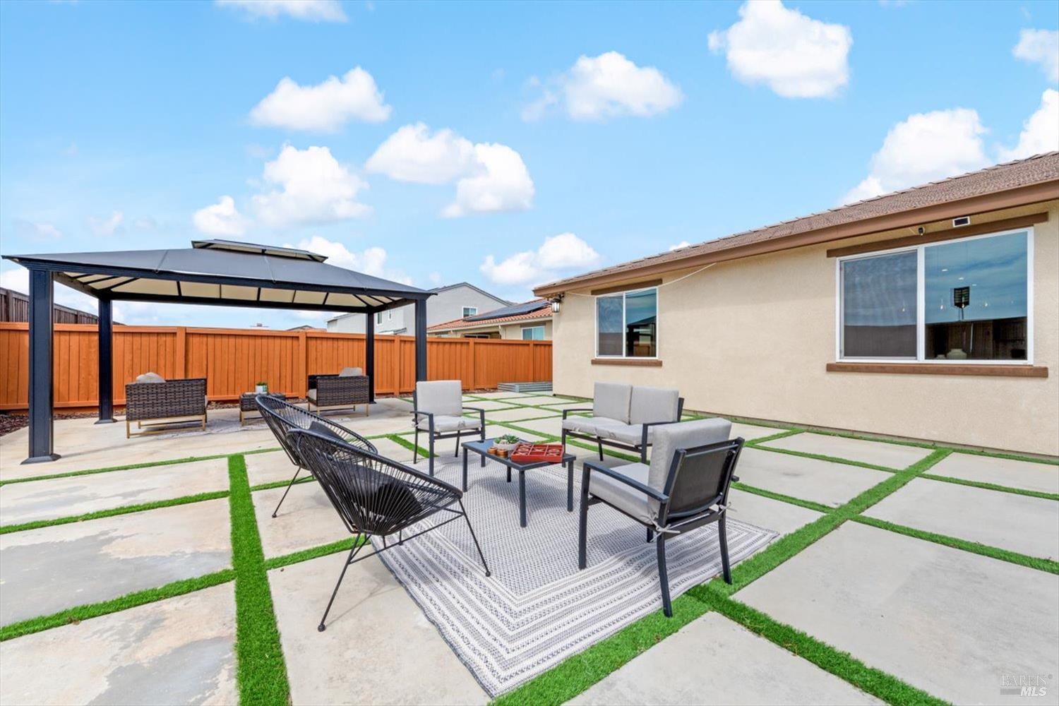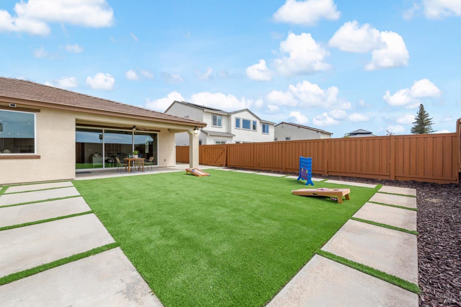 1455 Blossom Way offers nearly 3,000 square feet of single-story living, a 3-car garage, and an attached private, independent living suite. The main home is defined by a floor-to-ceiling, expansive sliding glass door that creates a seamless connection to the outdoors. Built in 2022, this 4-bedroom plus office, 3.5-bathroom home blends modern design with today's living needs. A welcoming entry and elegant hallway lead into the main living space, featuring 9-foot ceilings, where the kitchen, dining, and living areas come together in an open and inviting layout. A striking floor-to-ceiling, sliding glass door spans two walls, creating a seamless connection to the backyard, taking indoor-outdoor living to a whole new level. The kitchen showcases a transitional aesthetic with light gray cabinetry, gold hardware, quartz countertops, a gas cooktop, and a walk-in pantry, blending classic design with current finishes that feel both fresh and timeless. The primary suite offers a spacious retreat with an oversized tiled walk-in shower, dual sinks, and a large walk-in closet with built-in organizers. A dedicated office features a unique interior glass window, creating a connected workspace while still offering separation. Additional highlights include a walk-in laundry room with added storage. Privately positioned, the attached suite includes its own entrance, living room, bedroom, kitchenette, shower stall, walk-in closet, and laundry hookups and private patio. This flexible space works well for extended living, guests, or additional income potential. The backyard provides generous space to gather whether you want to relax or play games on the open turf, all while backing to open space for added privacy. With tall the benefits of newer construction, including energy efficiency, modern systems, plus completed landscaping, this home is move-in ready and conveniently located just minutes from I-80. If you have been searching for true multigenerational living with elevated design, this home delivers.