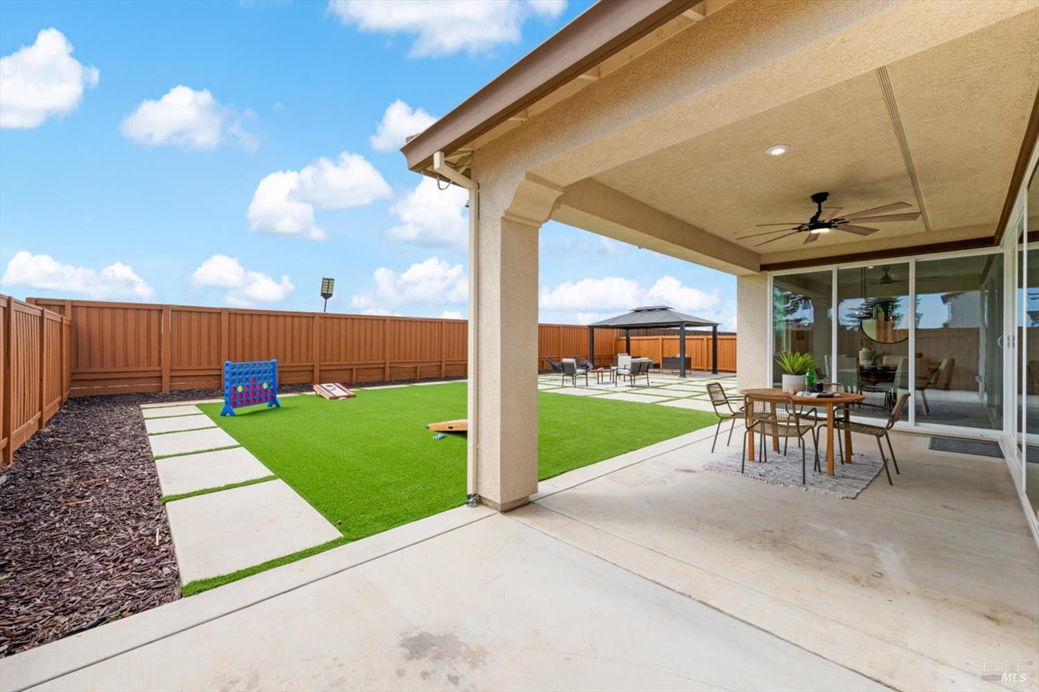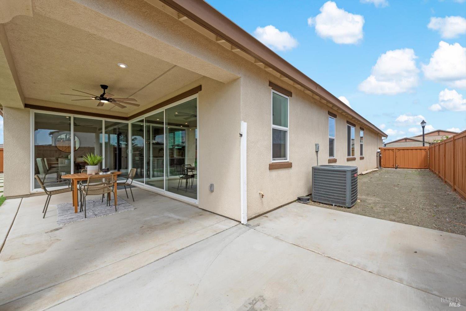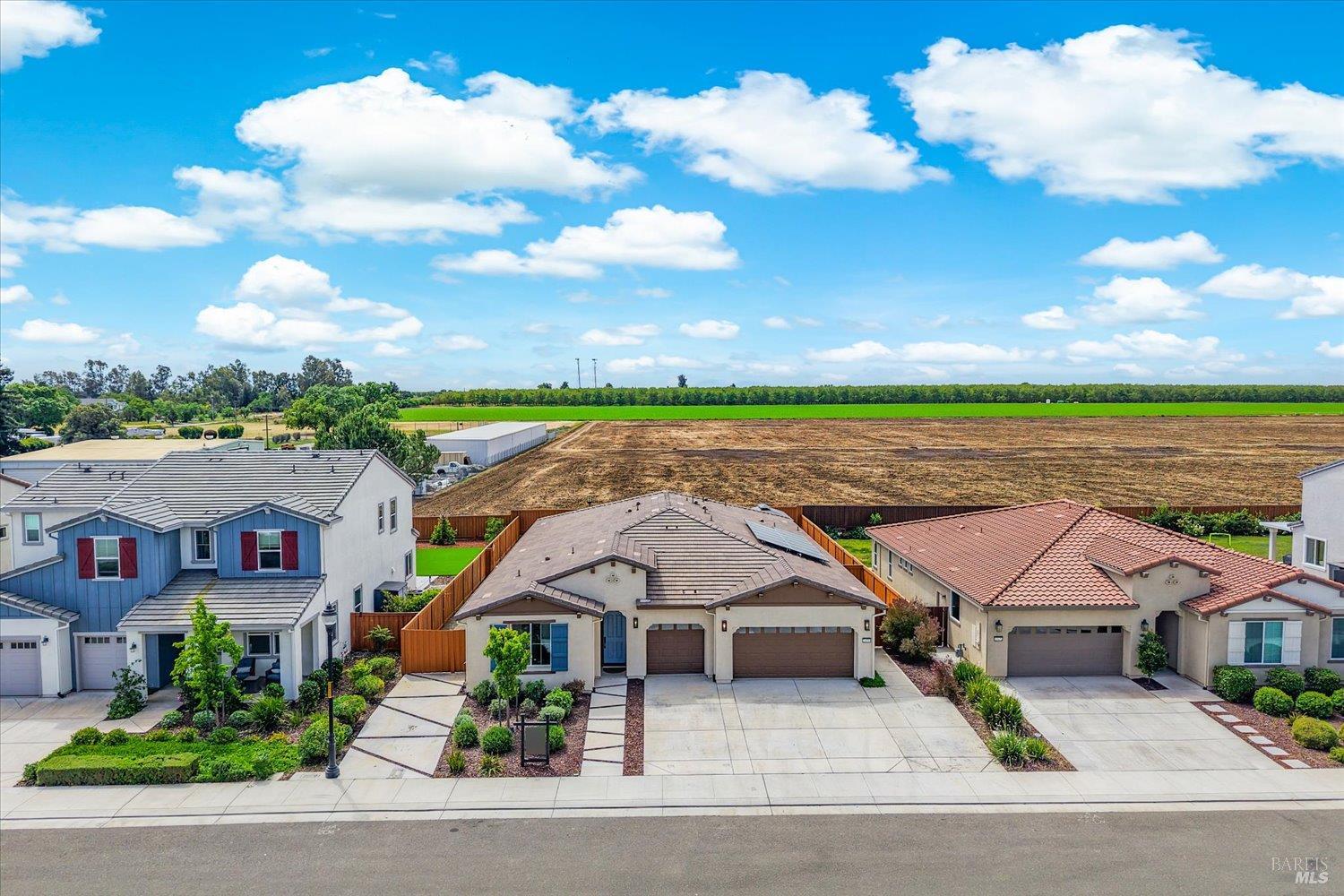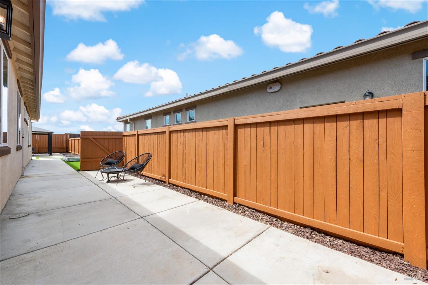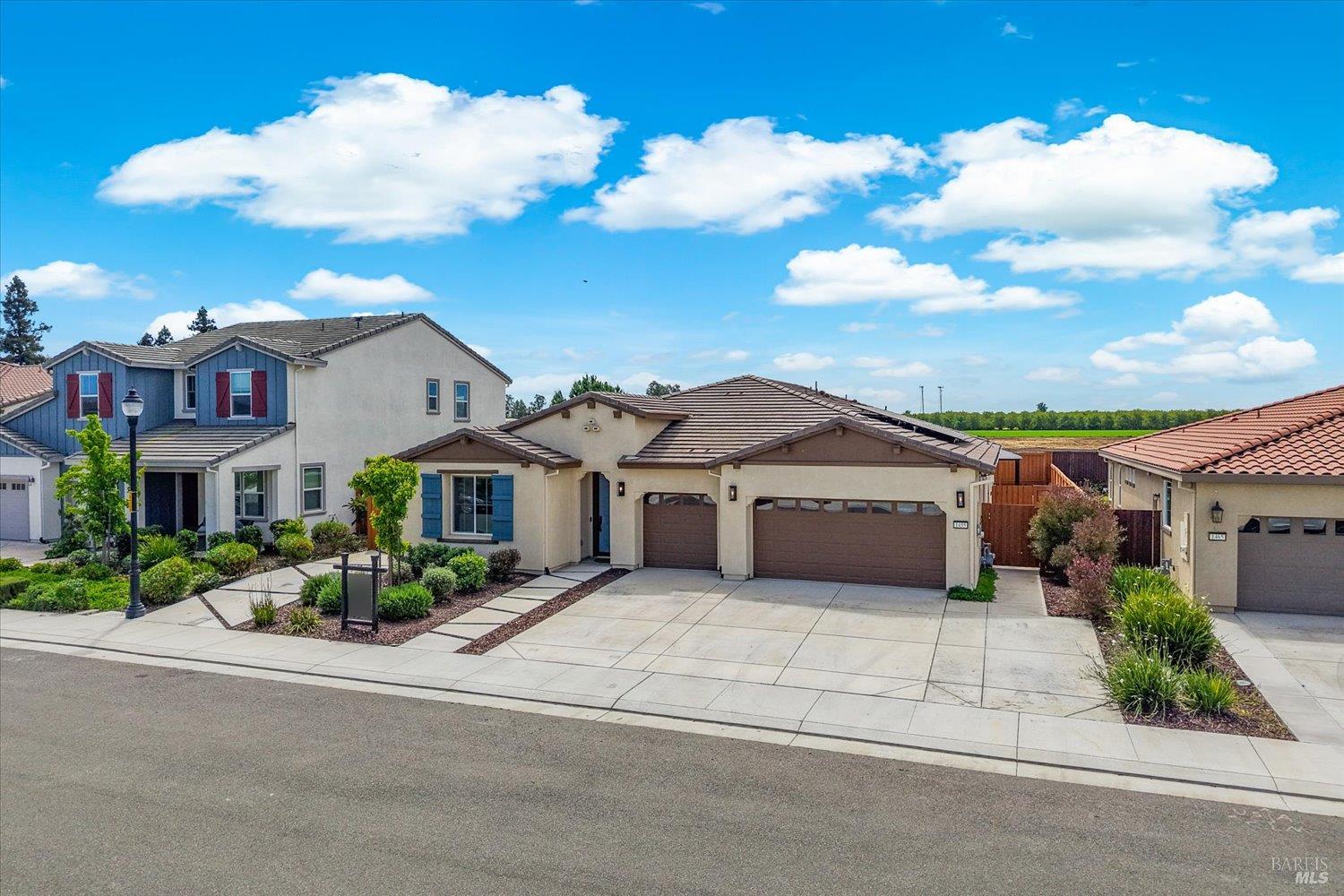 1455 Blossom Way offers nearly 3,000 square feet of single-story living, a 3-car garage, and an attached private, independent living suite. The main home is defined by a floor-to-ceiling, expansive sliding glass door that creates a seamless connection to the outdoors. Built in 2022, this 4-bedroom plus office, 3.5-bathroom home blends modern design with today's living needs. A welcoming entry and elegant hallway lead into the main living space, featuring 9-foot ceilings, where the kitchen, dining, and living areas come together in an open and inviting layout. A striking floor-to-ceiling, sliding glass door spans two walls, creating a seamless connection to the backyard, taking indoor-outdoor living to a whole new level. The kitchen showcases a transitional aesthetic with light gray cabinetry, gold hardware, quartz countertops, a gas cooktop, and a walk-in pantry, blending classic design with current finishes that feel both fresh and timeless. The primary suite offers a spacious retreat with an oversized tiled walk-in shower, dual sinks, and a large walk-in closet with built-in organizers. A dedicated office features a unique interior glass window, creating a connected workspace while still offering separation. Additional highlights include a walk-in laundry room with added storage. Privately positioned, the attached suite includes its own entrance, living room, bedroom, kitchenette, shower stall, walk-in closet, and laundry hookups and private patio. This flexible space works well for extended living, guests, or additional income potential. The backyard provides generous space to gather whether you want to relax or play games on the open turf, all while backing to open space for added privacy. With tall the benefits of newer construction, including energy efficiency, modern systems, plus completed landscaping, this home is move-in ready and conveniently located just minutes from I-80. If you have been searching for true multigenerational living with elevated design, this home delivers.