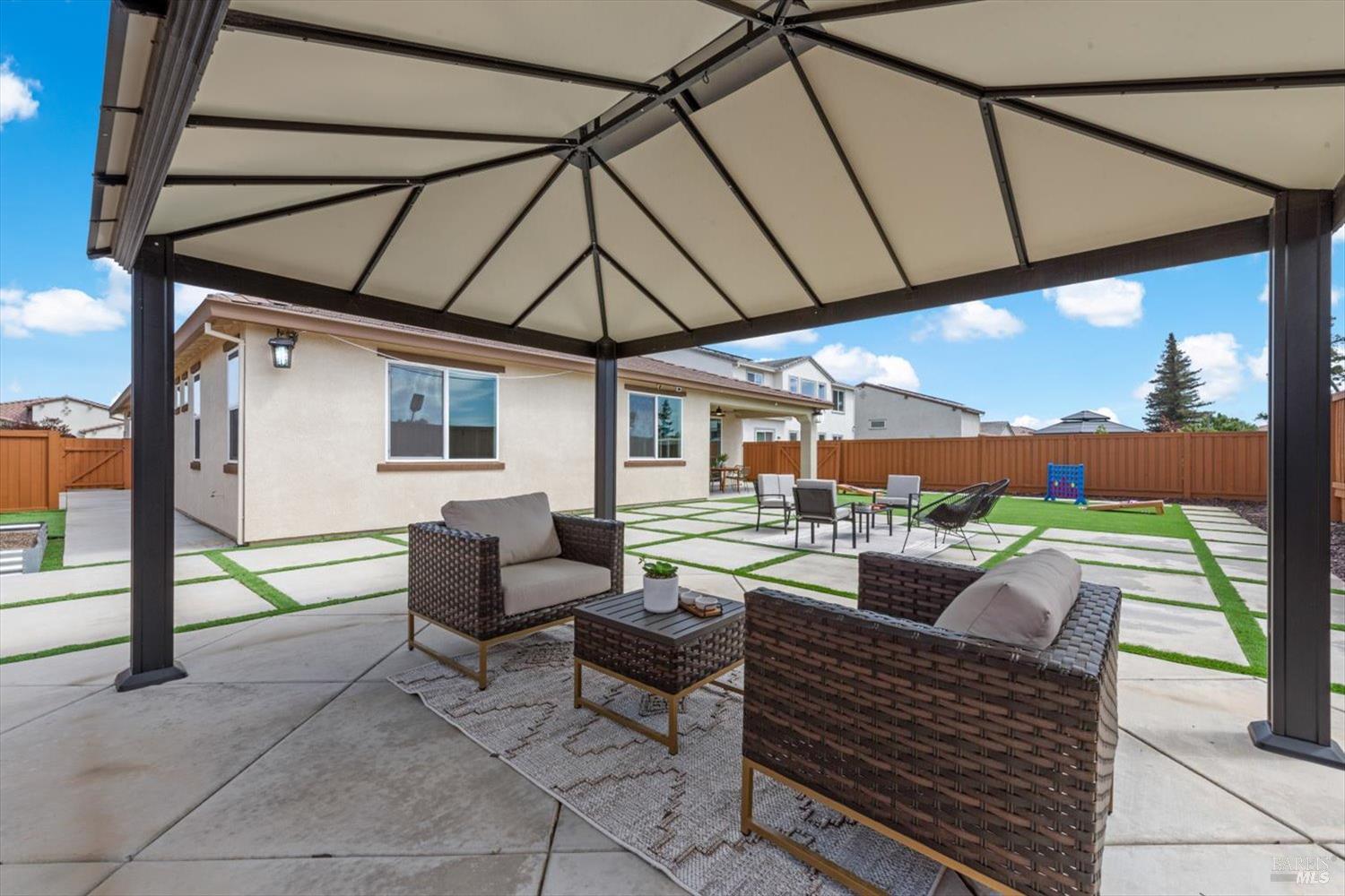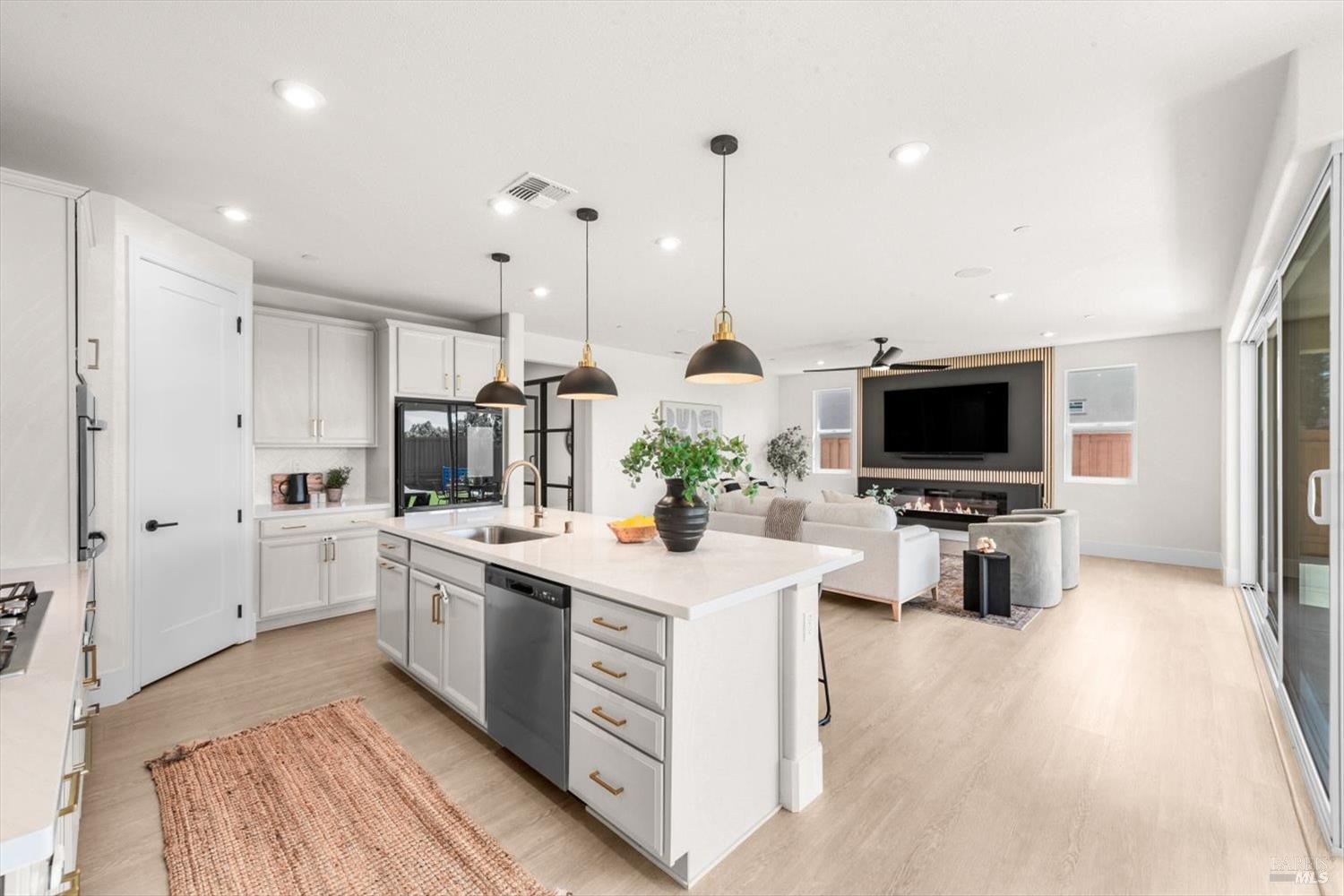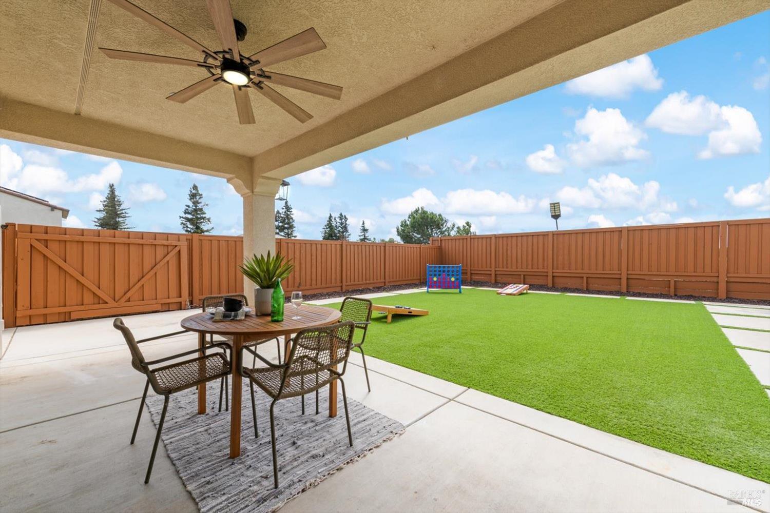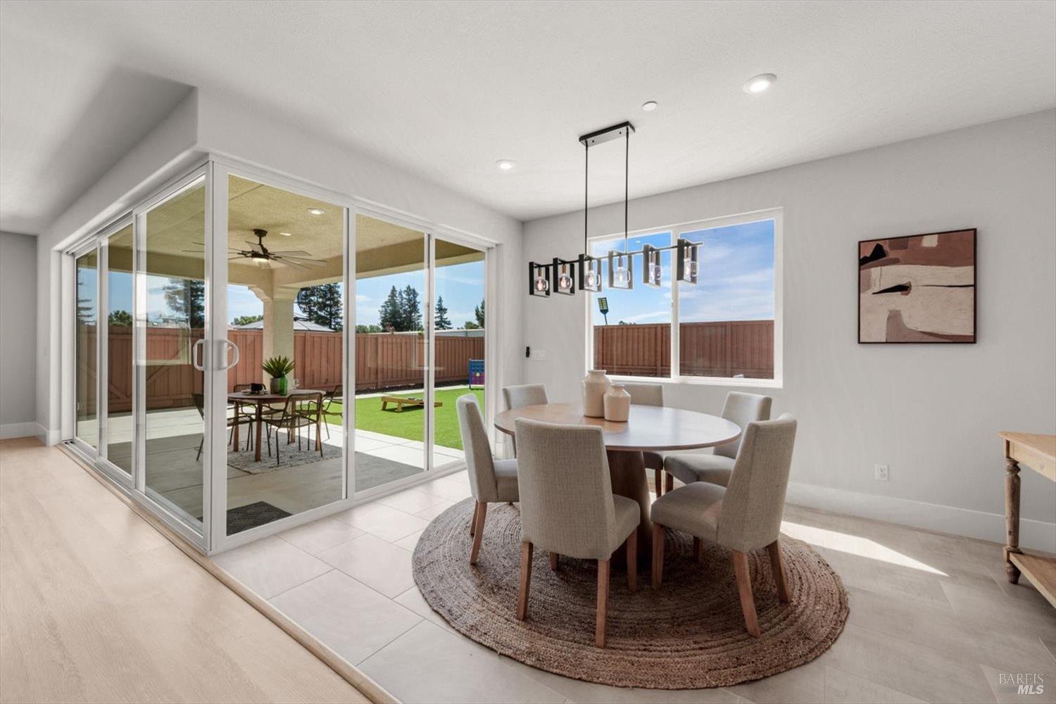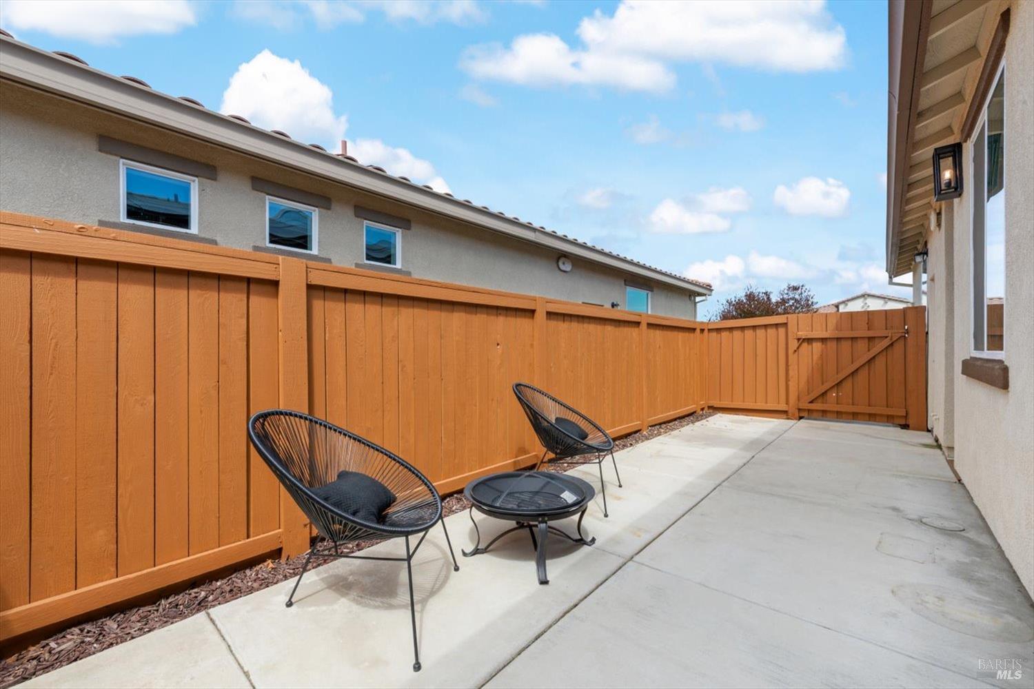 1455 Blossom Way offers nearly 3,000 square feet of single-story living, a 3-car garage, and an attached private, independent living suite. The main home is defined by a floor-to-ceiling, expansive sliding glass door that creates a seamless connection to the outdoors. Built in 2022, this 4-bedroom plus office, 3.5-bathroom home blends modern design with today's living needs. A welcoming entry and elegant hallway lead into the main living space, featuring 9-foot ceilings, where the kitchen, dining, and living areas come together in an open and inviting layout. A striking floor-to-ceiling, sliding glass door spans two walls, creating a seamless connection to the backyard, taking indoor-outdoor living to a whole new level. The kitchen showcases a transitional aesthetic with light gray cabinetry, gold hardware, quartz countertops, a gas cooktop, and a walk-in pantry, blending classic design with current finishes that feel both fresh and timeless. The primary suite offers a spacious retreat with an oversized tiled walk-in shower, dual sinks, and a large walk-in closet with built-in organizers. A dedicated office features a unique interior glass window, creating a connected workspace while still offering separation. Additional highlights include a walk-in laundry room with added storage. Privately positioned, the attached suite includes its own entrance, living room, bedroom, kitchenette, shower stall, walk-in closet, and laundry hookups and private patio. This flexible space works well for extended living, guests, or additional income potential. The backyard provides generous space to gather whether you want to relax or play games on the open turf, all while backing to open space for added privacy. With tall the benefits of newer construction, including energy efficiency, modern systems, plus completed landscaping, this home is move-in ready and conveniently located just minutes from I-80. If you have been searching for true multigenerational living with elevated design, this home delivers.