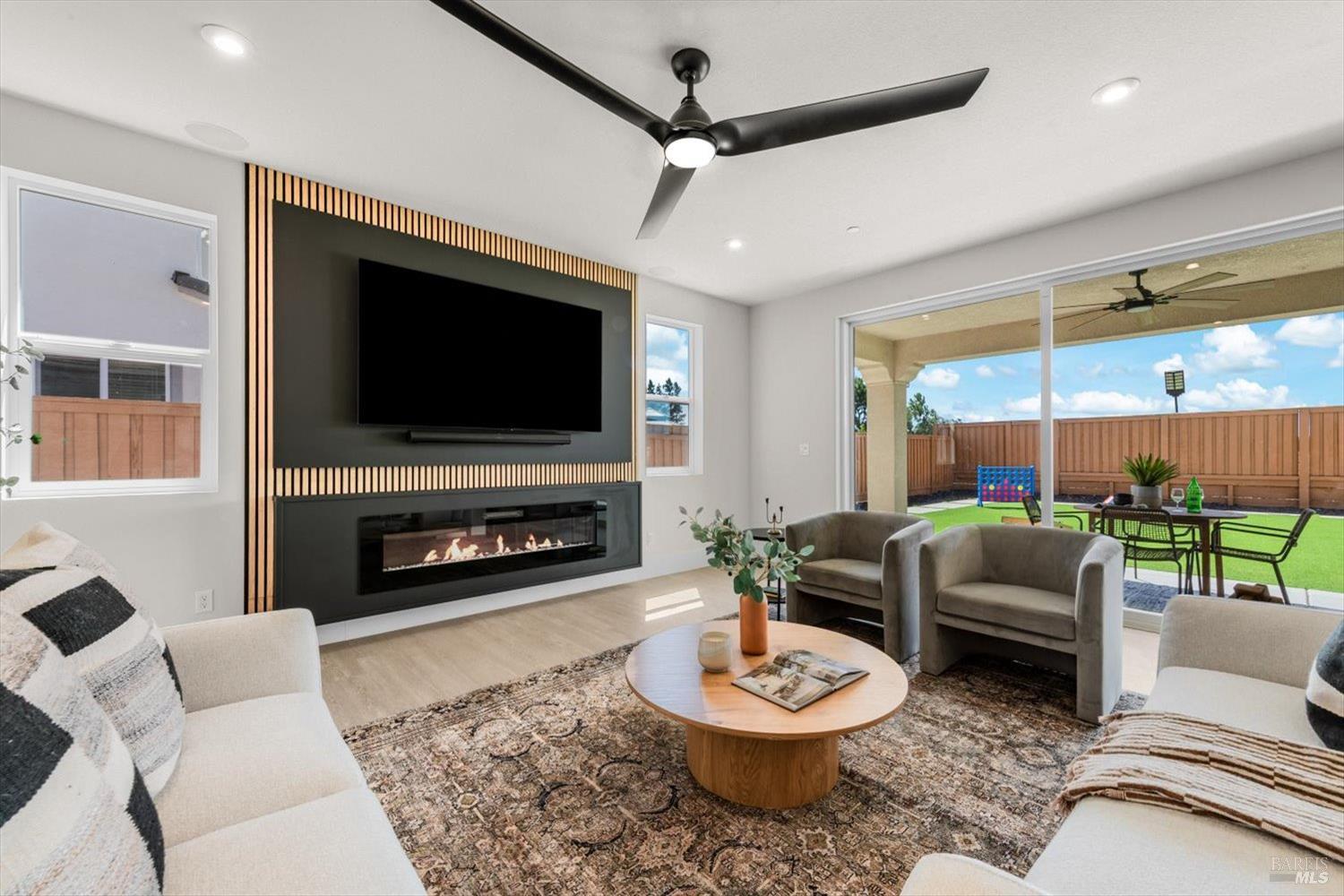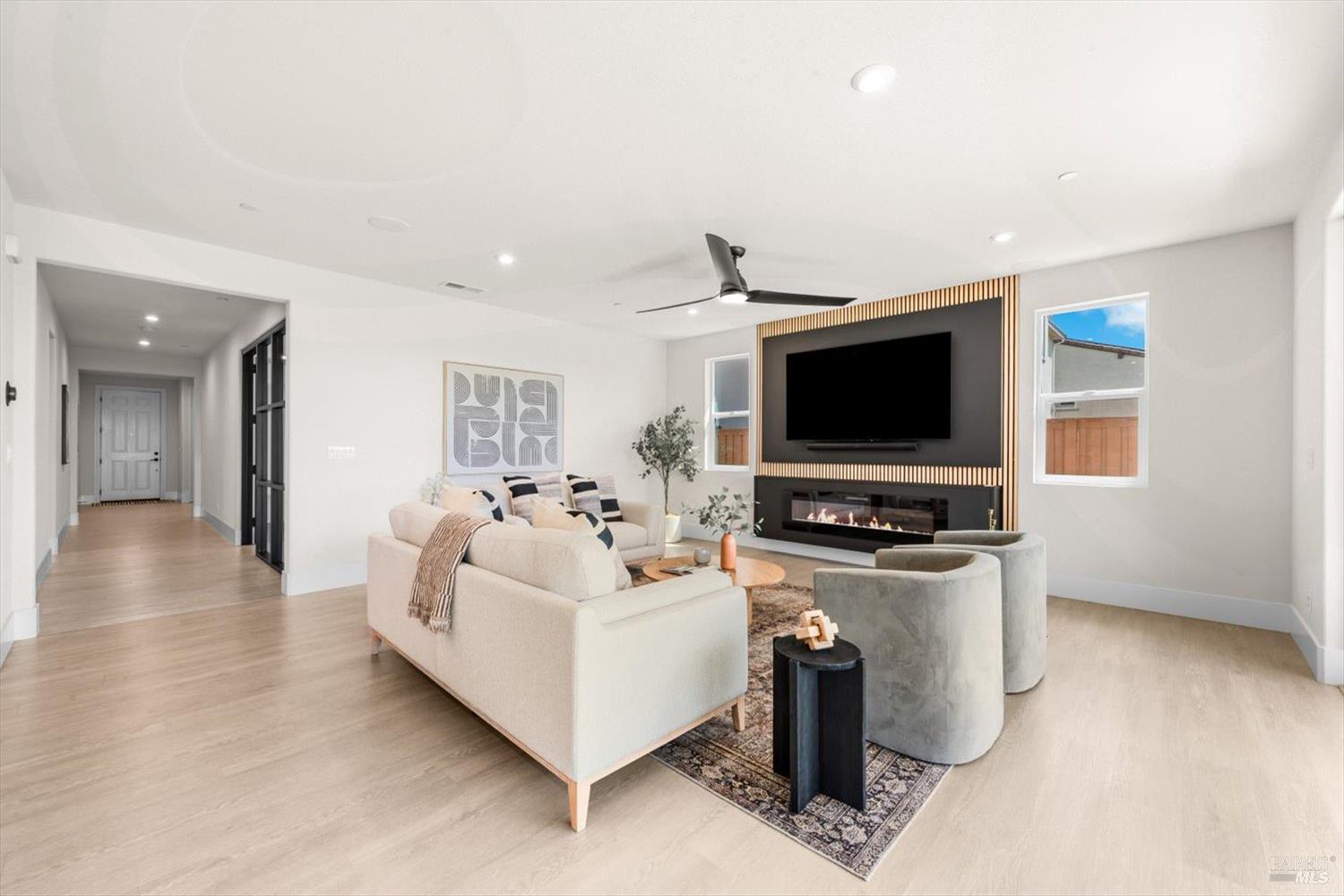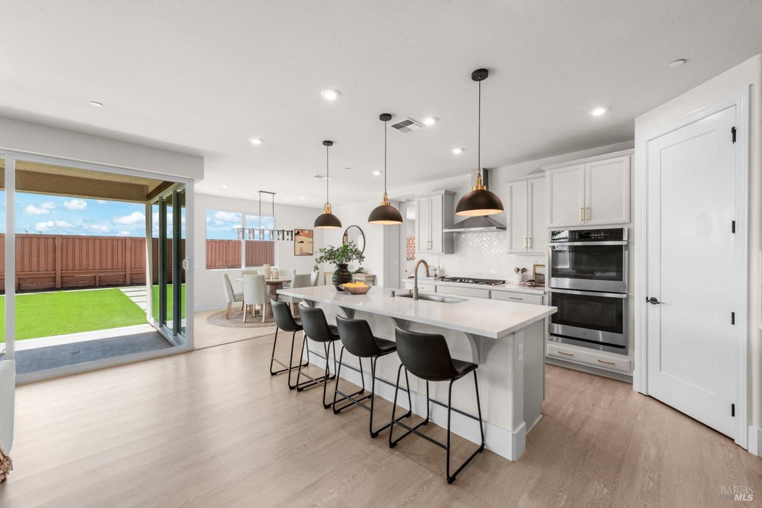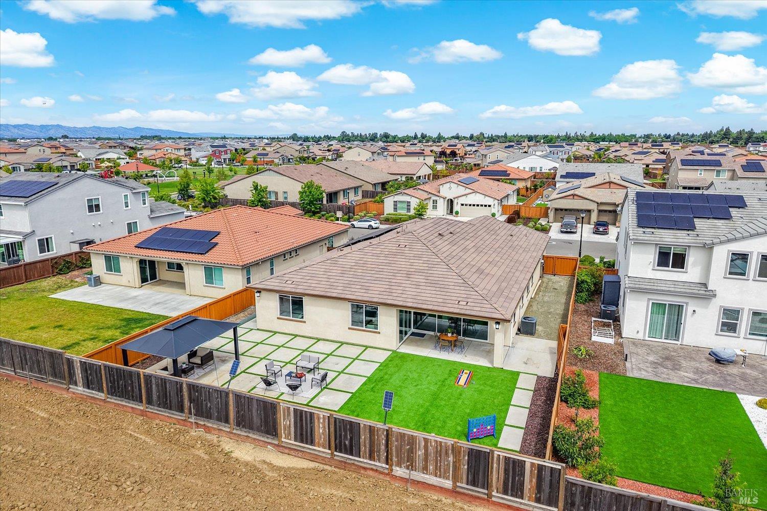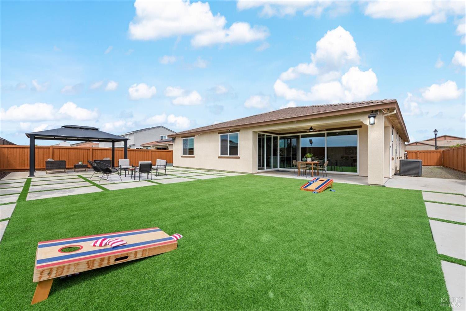 1455 Blossom Way offers nearly 3,000 square feet of single-story living, a 3-car garage, and an attached private, independent living suite. The main home is defined by a floor-to-ceiling, expansive sliding glass door that creates a seamless connection to the outdoors. Built in 2022, this 4-bedroom plus office, 3.5-bathroom home blends modern design with today's living needs. A welcoming entry and elegant hallway lead into the main living space, featuring 9-foot ceilings, where the kitchen, dining, and living areas come together in an open and inviting layout. A striking floor-to-ceiling, sliding glass door spans two walls, creating a seamless connection to the backyard, taking indoor-outdoor living to a whole new level. The kitchen showcases a transitional aesthetic with light gray cabinetry, gold hardware, quartz countertops, a gas cooktop, and a walk-in pantry, blending classic design with current finishes that feel both fresh and timeless. The primary suite offers a spacious retreat with an oversized tiled walk-in shower, dual sinks, and a large walk-in closet with built-in organizers. A dedicated office features a unique interior glass window, creating a connected workspace while still offering separation. Additional highlights include a walk-in laundry room with added storage. Privately positioned, the attached suite includes its own entrance, living room, bedroom, kitchenette, shower stall, walk-in closet, and laundry hookups and private patio. This flexible space works well for extended living, guests, or additional income potential. The backyard provides generous space to gather whether you want to relax or play games on the open turf, all while backing to open space for added privacy. With tall the benefits of newer construction, including energy efficiency, modern systems, plus completed landscaping, this home is move-in ready and conveniently located just minutes from I-80. If you have been searching for true multigenerational living with elevated design, this home delivers.