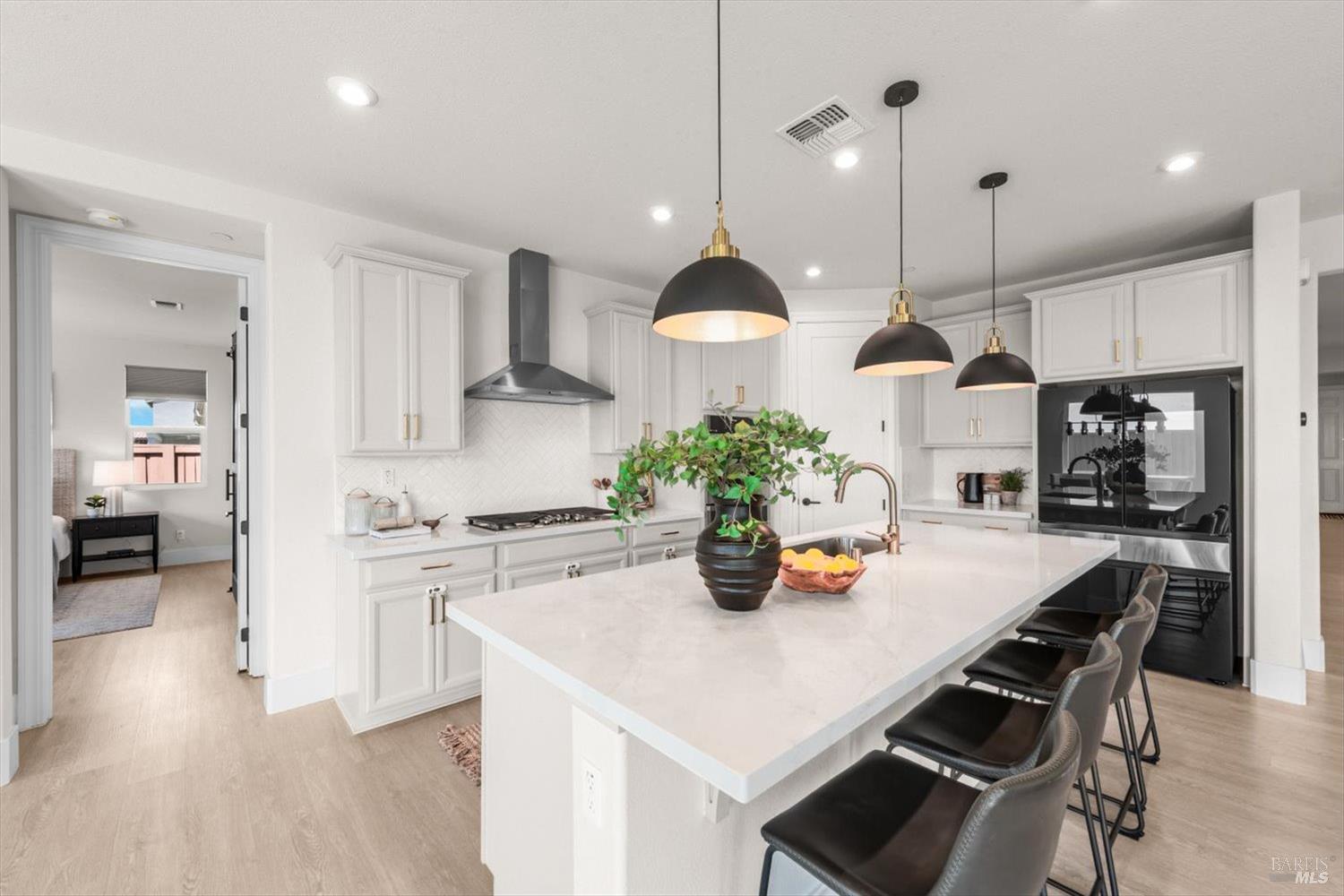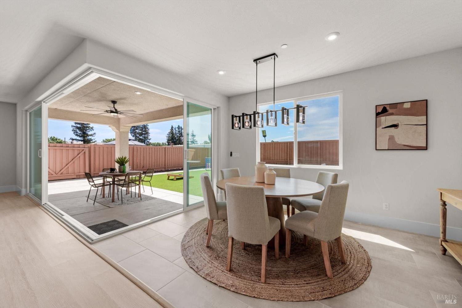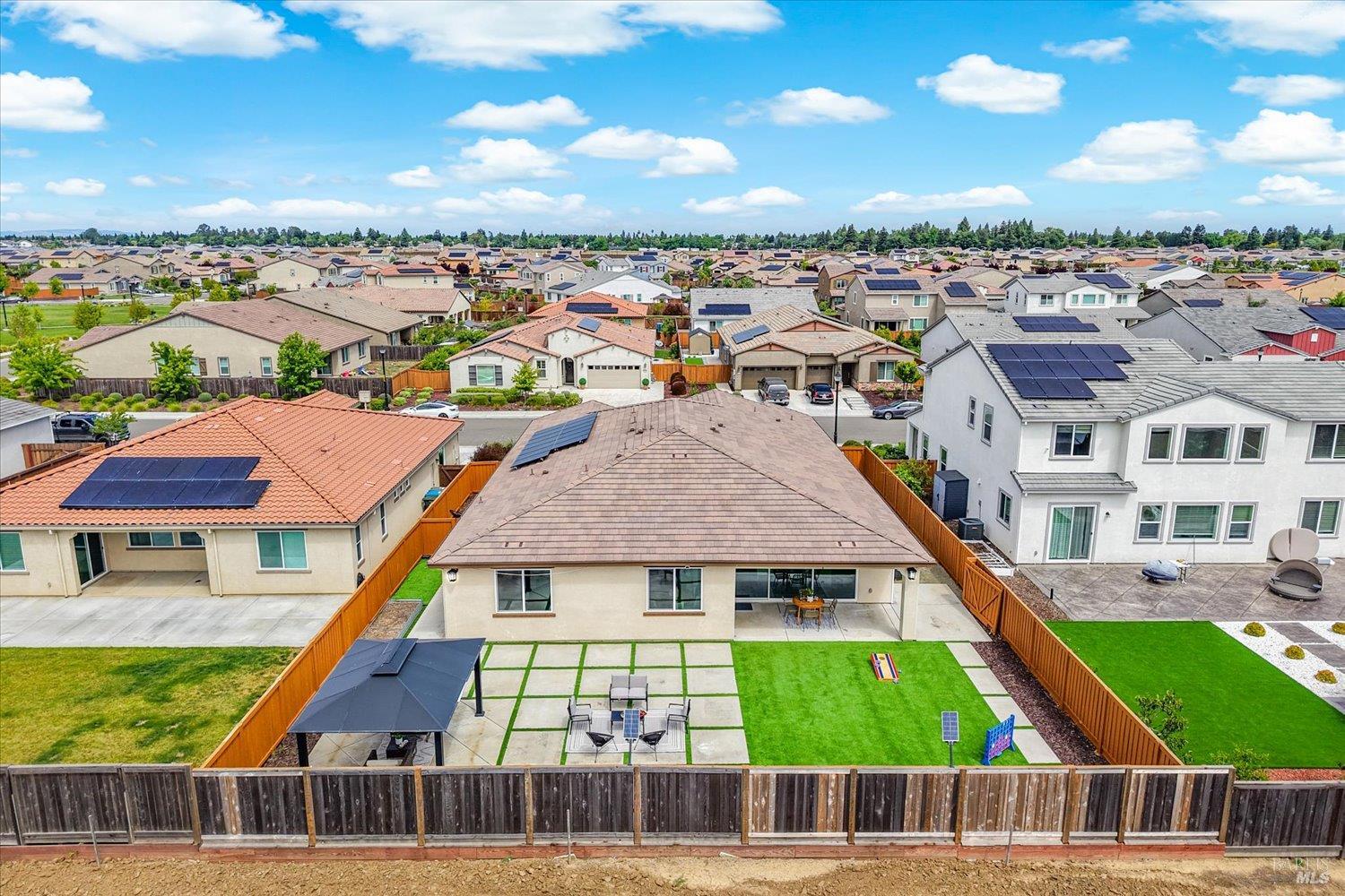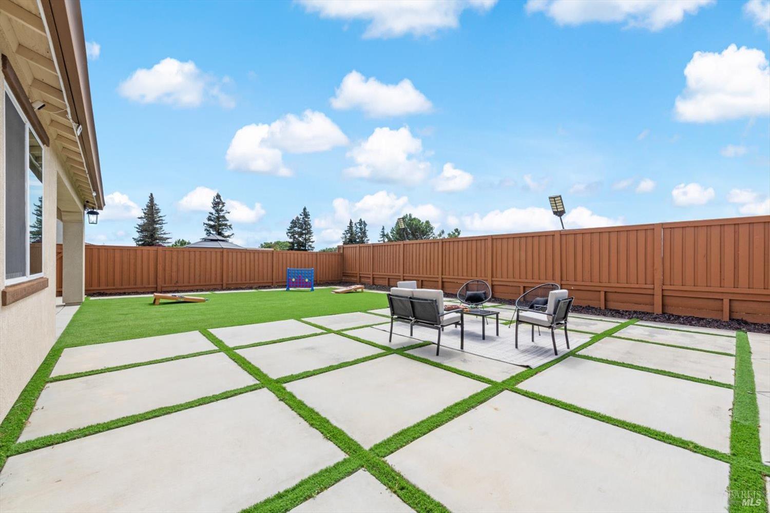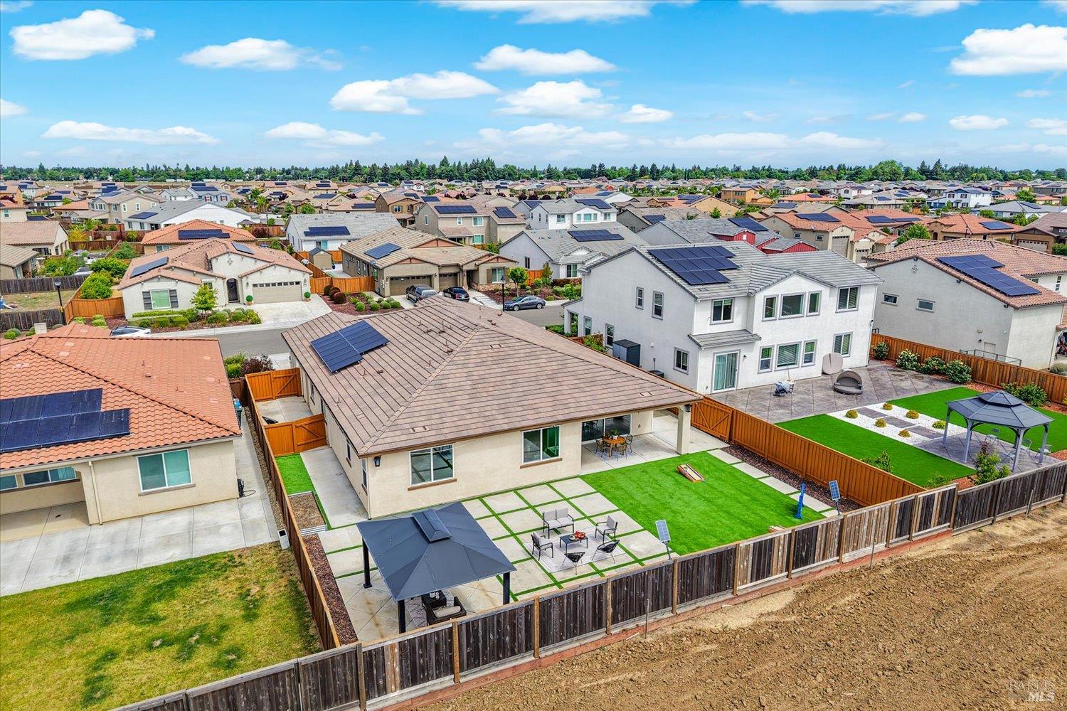 1455 Blossom Way offers nearly 3,000 square feet of single-story living, a 3-car garage, and an attached private, independent living suite. The main home is defined by a floor-to-ceiling, expansive sliding glass door that creates a seamless connection to the outdoors. Built in 2022, this 4-bedroom plus office, 3.5-bathroom home blends modern design with today's living needs. A welcoming entry and elegant hallway lead into the main living space, featuring 9-foot ceilings, where the kitchen, dining, and living areas come together in an open and inviting layout. A striking floor-to-ceiling, sliding glass door spans two walls, creating a seamless connection to the backyard, taking indoor-outdoor living to a whole new level. The kitchen showcases a transitional aesthetic with light gray cabinetry, gold hardware, quartz countertops, a gas cooktop, and a walk-in pantry, blending classic design with current finishes that feel both fresh and timeless. The primary suite offers a spacious retreat with an oversized tiled walk-in shower, dual sinks, and a large walk-in closet with built-in organizers. A dedicated office features a unique interior glass window, creating a connected workspace while still offering separation. Additional highlights include a walk-in laundry room with added storage. Privately positioned, the attached suite includes its own entrance, living room, bedroom, kitchenette, shower stall, walk-in closet, and laundry hookups and private patio. This flexible space works well for extended living, guests, or additional income potential. The backyard provides generous space to gather whether you want to relax or play games on the open turf, all while backing to open space for added privacy. With tall the benefits of newer construction, including energy efficiency, modern systems, plus completed landscaping, this home is move-in ready and conveniently located just minutes from I-80. If you have been searching for true multigenerational living with elevated design, this home delivers.