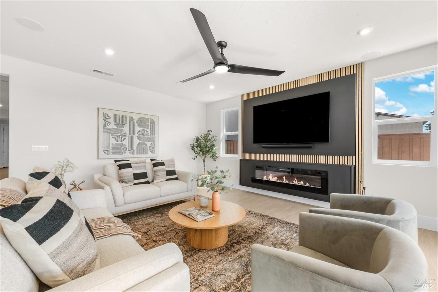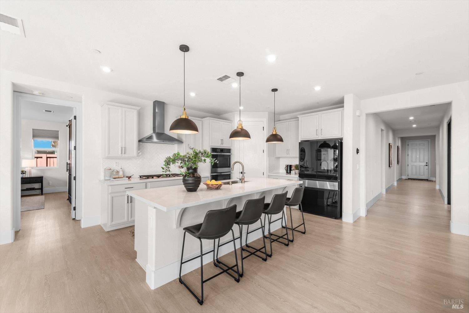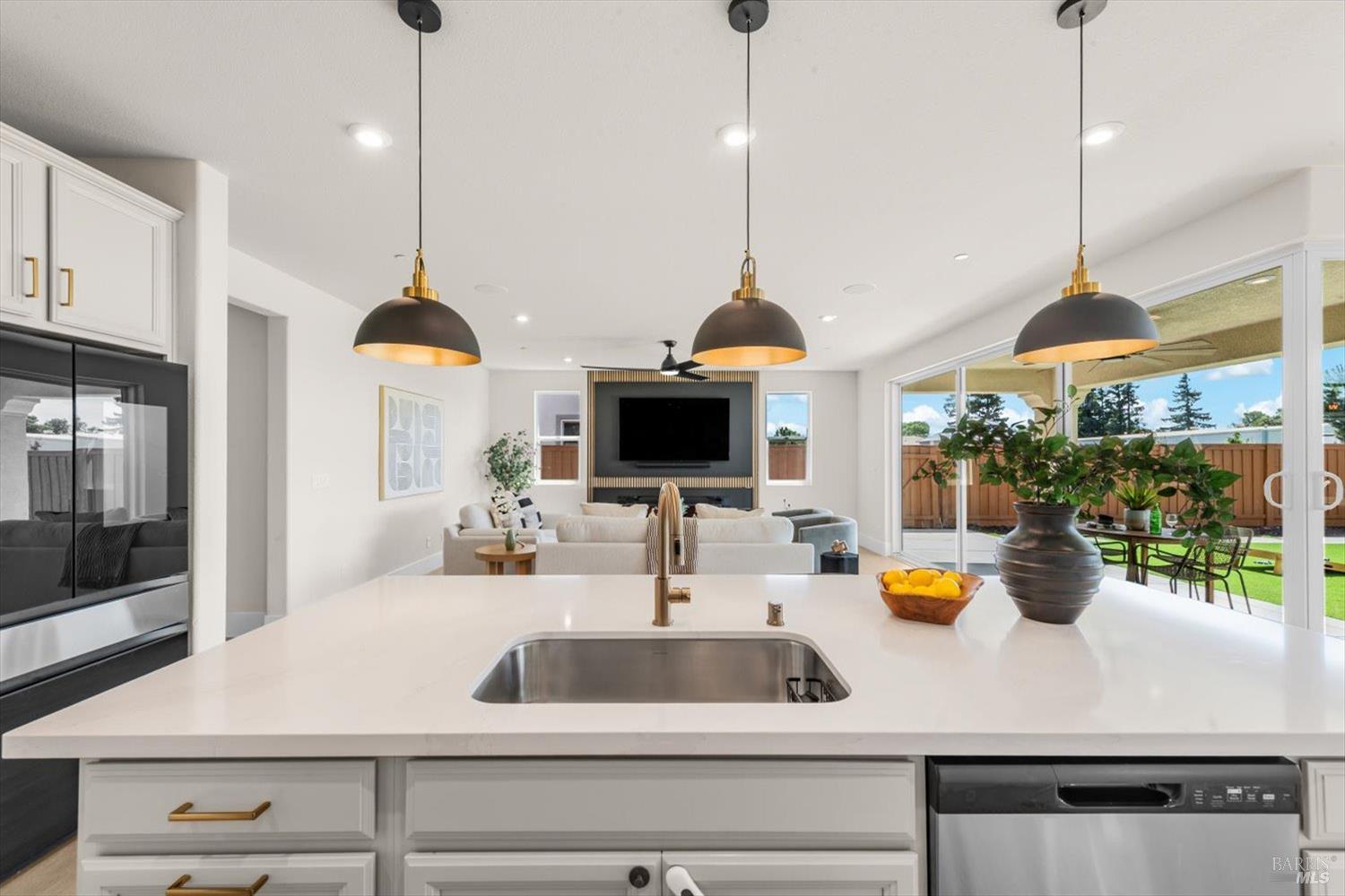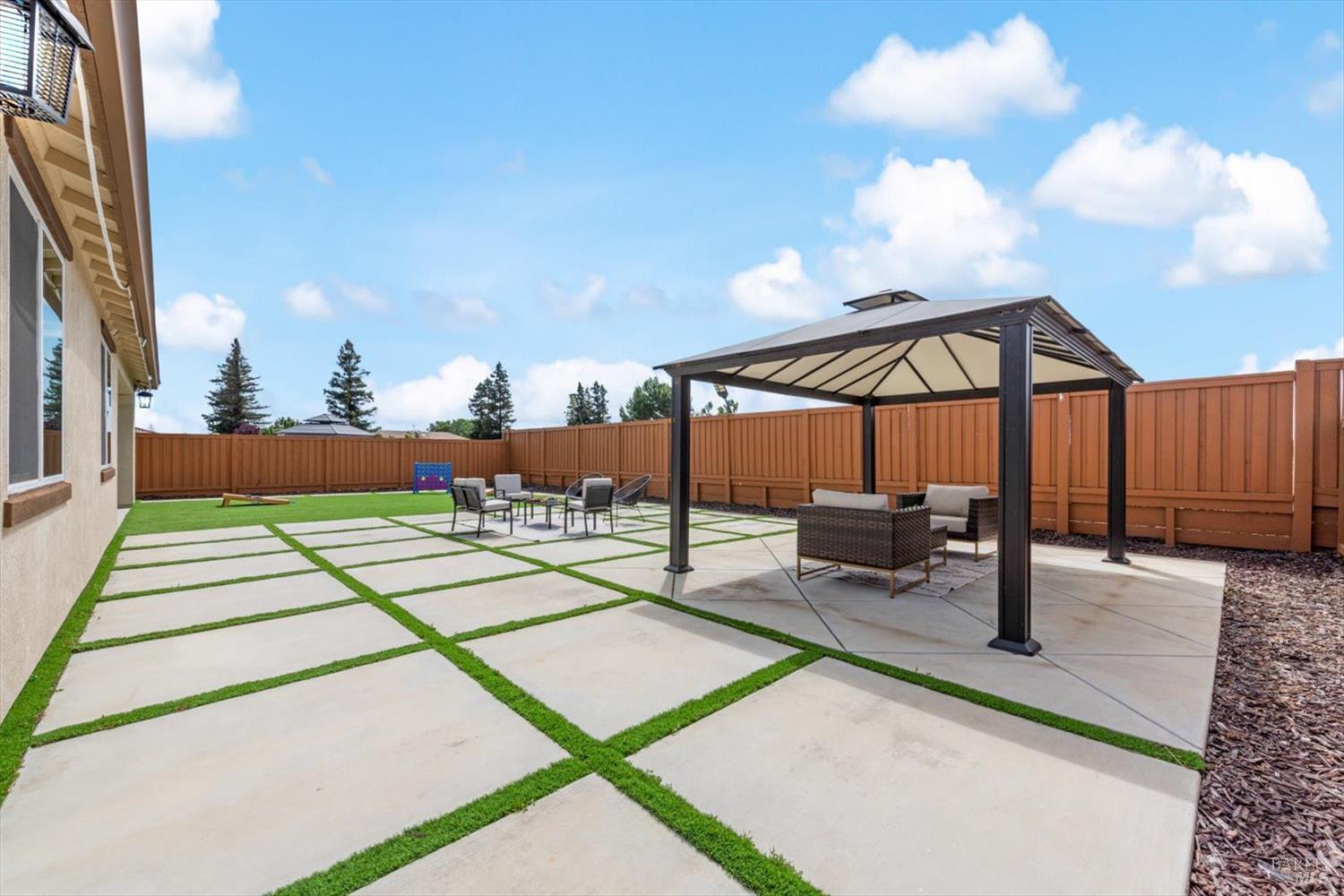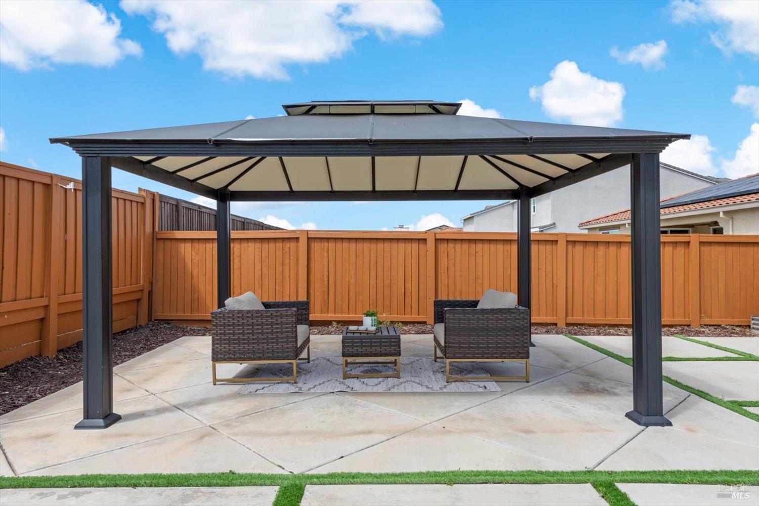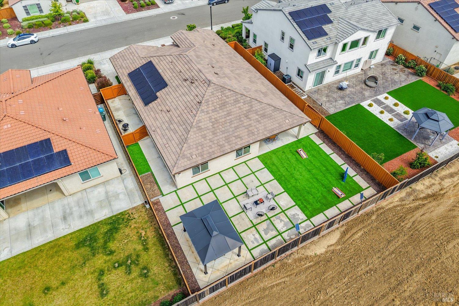 1455 Blossom Way offers nearly 3,000 square feet of single-story living, a 3-car garage, and an attached private, independent living suite. The main home is defined by a floor-to-ceiling, expansive sliding glass door that creates a seamless connection to the outdoors. Built in 2022, this 4-bedroom plus office, 3.5-bathroom home blends modern design with today's living needs. A welcoming entry and elegant hallway lead into the main living space, featuring 9-foot ceilings, where the kitchen, dining, and living areas come together in an open and inviting layout. A striking floor-to-ceiling, sliding glass door spans two walls, creating a seamless connection to the backyard, taking indoor-outdoor living to a whole new level. The kitchen showcases a transitional aesthetic with light gray cabinetry, gold hardware, quartz countertops, a gas cooktop, and a walk-in pantry, blending classic design with current finishes that feel both fresh and timeless. The primary suite offers a spacious retreat with an oversized tiled walk-in shower, dual sinks, and a large walk-in closet with built-in organizers. A dedicated office features a unique interior glass window, creating a connected workspace while still offering separation. Additional highlights include a walk-in laundry room with added storage. Privately positioned, the attached suite includes its own entrance, living room, bedroom, kitchenette, shower stall, walk-in closet, and laundry hookups and private patio. This flexible space works well for extended living, guests, or additional income potential. The backyard provides generous space to gather whether you want to relax or play games on the open turf, all while backing to open space for added privacy. With tall the benefits of newer construction, including energy efficiency, modern systems, plus completed landscaping, this home is move-in ready and conveniently located just minutes from I-80. If you have been searching for true multigenerational living with elevated design, this home delivers.
