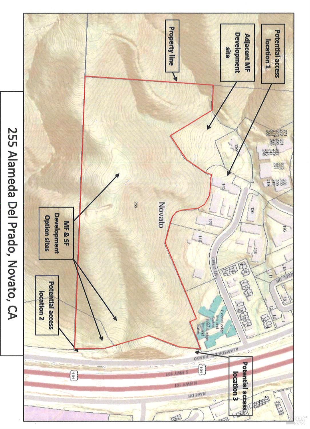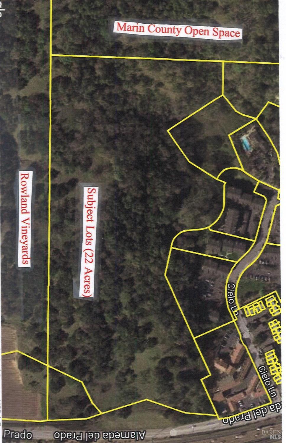 Major Price Reduction. Development Opportunity or build out per current configuration. Prime 22+/- Acres priced by estate for fast sale. Develop 2 existing lots with potentials for homes + ADU's, business, commercial, MF + more...(some uses may require rezone) or process subdivision land entitlements for higher densities and realize significant land value increase! Xlnt Southern Novato Location adjacent to Pacheco Ranch Vineyards and backs to Marin County Open Space. Private tree covered land with numerous possible building sites & breathtaking bay views. City utilities at site. Flexible PD and R1 Zoning allow for numerous development options + numerous land uses including homes, guest house, ADU's, home business, group home, B&B, day care, religious, school, livestock, horses, kennel, + much more, subject to City verification. (See attached tables). Significant information is available including reports & disclosures. A full Master Plan and entitlement submittal for 76 lots was made in 1992, Las Lomas Master Plan, and subsequent reports conducted thereafter. No current applications pending. Buyer to determine desired future development proposals. Existing access is from Alameda Del Prado. Future access along top via Cielo Ln is not allowed. For viewing access, park along Alameda Del Prado just North from Pacheco Ranch Vineyards. Viewing maps are available at site, or per attachments. Probable future development scenarios (tbd) would be sited and accessed along the lower portions of site off Alameda Del Prado which might include SFR or Condo, or commercial or higher density MF subject to Rezone. Adjacent and nearby properties along Alameda Del Prado include Pacheco Ranch Vineyards, Marinwood Inn and Suites, Perry's Restaurant, and Best Western Plus Hotel and various additional residential developments. Property has excellent privacy and separation from adjacent properties. Property is adjacent to Marin County Open Space along the top plus connections to a number of additional public and private Open Space preserves spanning for miles!