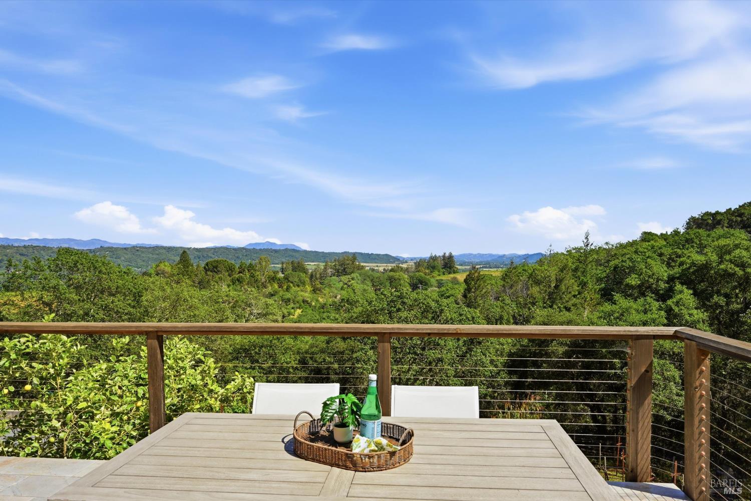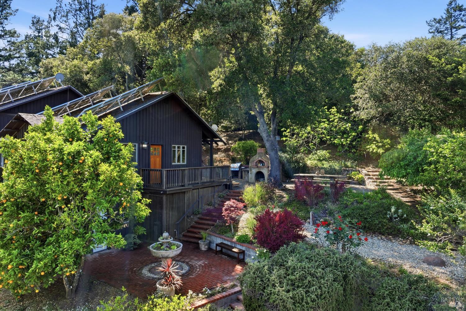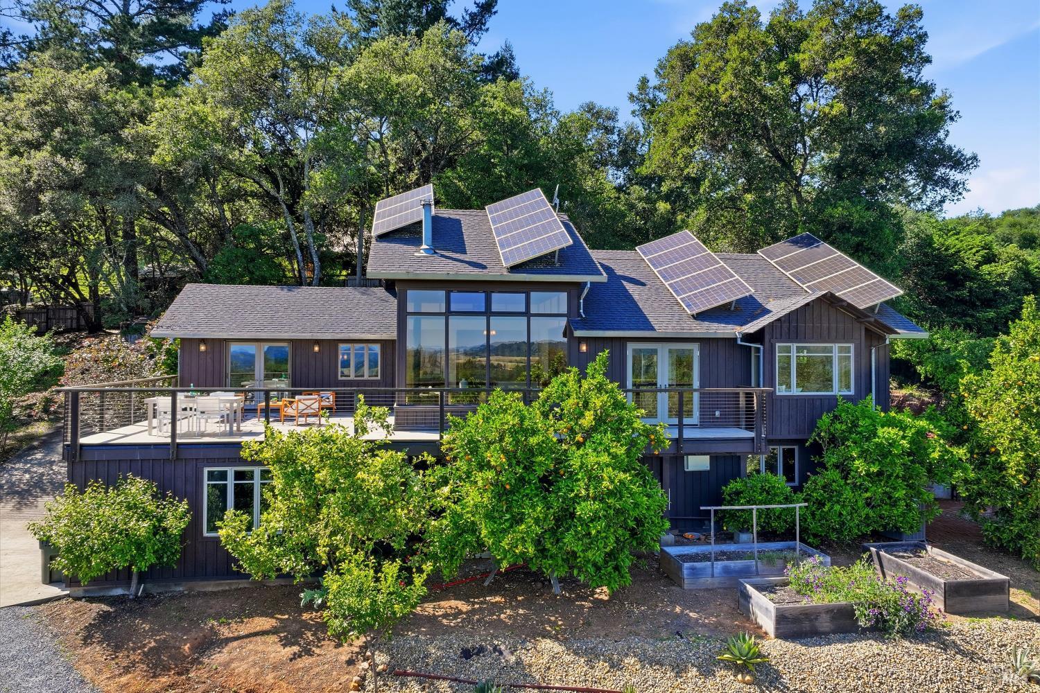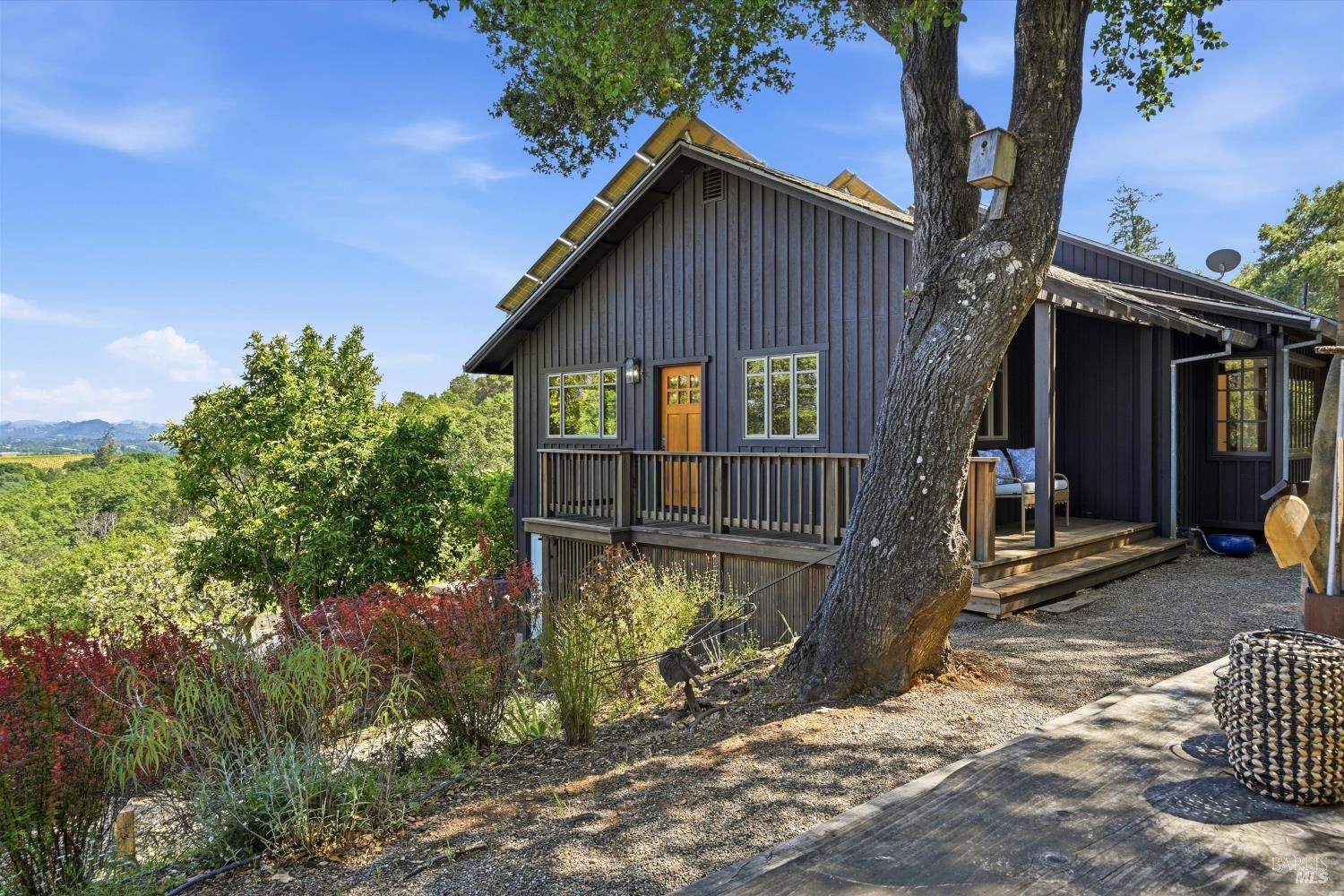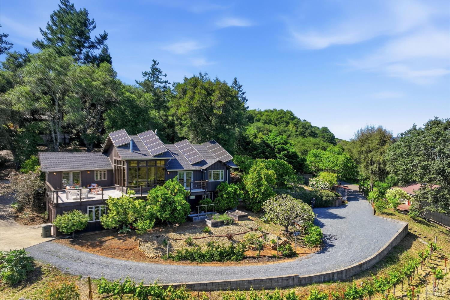 Experience the pinnacle of Wine Country living on this nearly 2-acre retreat, perfectly situated to capture breathtaking views of Sonoma County's Dry Creek Valley. Tucked at the end of a private road with no neighbors in sight, this property features a 3-bed, 2-bath mid-century modern main home and a 1-bed, 1-bath detached cottage. Surrounded by tiered gardens, a hobby vineyard, and tranquil oak woodlands, it offers a seamless blend of nature and sophistication. The main home boasts floor-to-ceiling windows, warm wood finishes, and an expansive deck with panoramic valley views, including Mt. St. Helena. The open living, kitchen, and dining areas flow effortlessly, while the private primary suite features a spa-like bath, walk-in closet, and private deck. Two additional bedrooms share a full bath, and the versatile lower level includes a flex space, laundry, wine cellar, and two-car garage with a workbench. Designed for outdoor entertaining, the property includes an alfresco kitchen with a BBQ, wood-fired pizza oven, and live-edge dining table. Winding paths lead through enchanting gardens, an orchard with citrus, plums,figs, apples, olives plus a ⅓-acre hobby vineyard planted with Zinfandel and Carignan. A seasonal creek, chicken coop, and storage shed add to the charm. The detached unit offers a private haven with a covered porch, tiered deck, vaulted ceilings, and stunning valley views. Its bright living room, open kitchen, cozy bedroom, and full bath make it ideal for guests, multi-generational living, or rental income. Located just 10 minutes from the Dry Creek General Store, 15 minutes from Highway 101, and 20 minutes from Healdsburg Plaza, this property combines luxury, privacy, and convenience, a true Wine Country paradise.