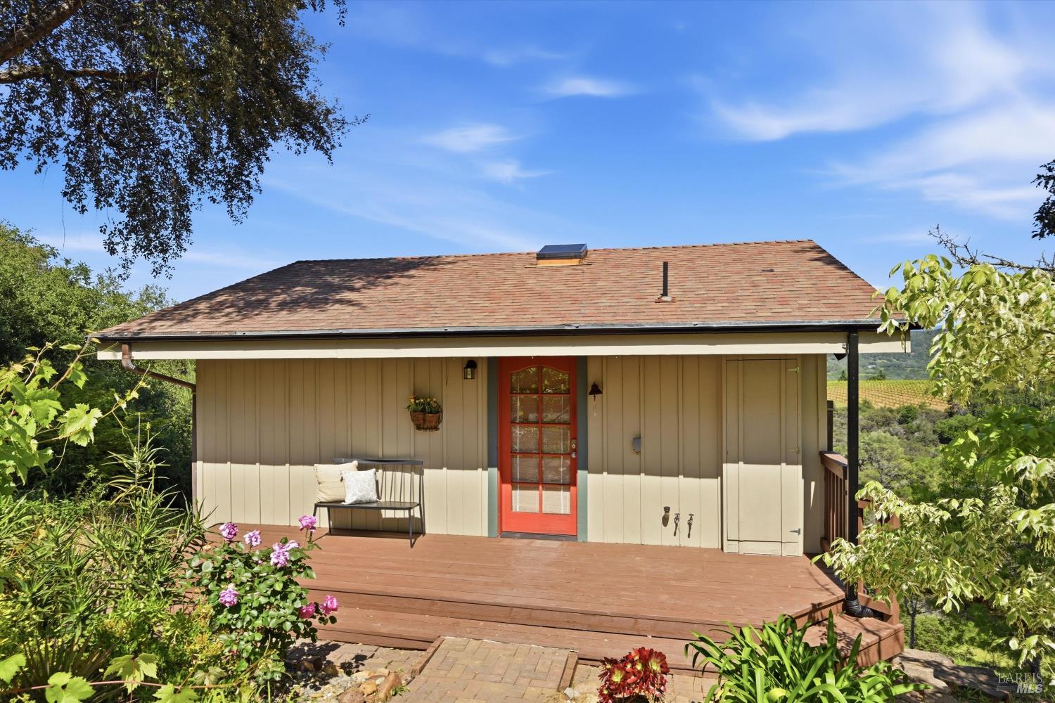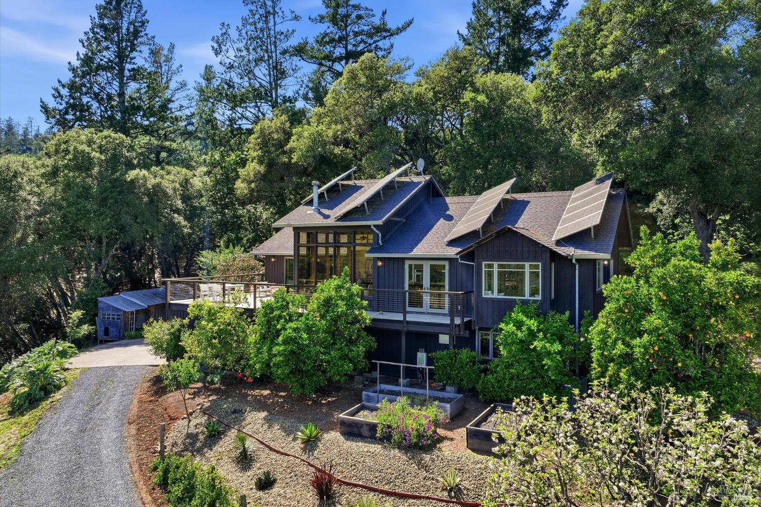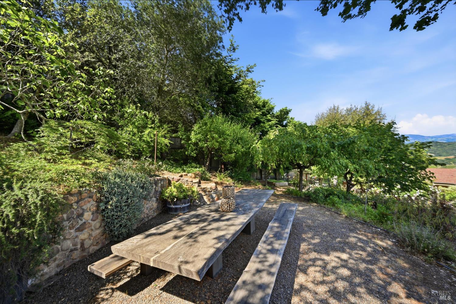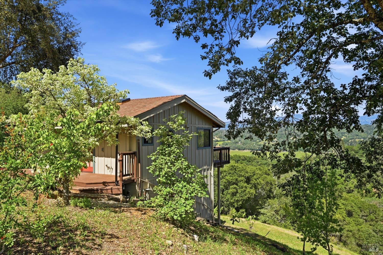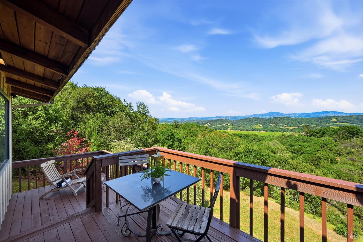 Experience the pinnacle of Wine Country living on this nearly 2-acre retreat, perfectly situated to capture breathtaking views of Sonoma County's Dry Creek Valley. Tucked at the end of a private road with no neighbors in sight, this property features a 3-bed, 2-bath mid-century modern main home and a 1-bed, 1-bath detached cottage. Surrounded by tiered gardens, a hobby vineyard, and tranquil oak woodlands, it offers a seamless blend of nature and sophistication. The main home boasts floor-to-ceiling windows, warm wood finishes, and an expansive deck with panoramic valley views, including Mt. St. Helena. The open living, kitchen, and dining areas flow effortlessly, while the private primary suite features a spa-like bath, walk-in closet, and private deck. Two additional bedrooms share a full bath, and the versatile lower level includes a flex space, laundry, wine cellar, and two-car garage with a workbench. Designed for outdoor entertaining, the property includes an alfresco kitchen with a BBQ, wood-fired pizza oven, and live-edge dining table. Winding paths lead through enchanting gardens, an orchard with citrus, plums,figs, apples, olives plus a ⅓-acre hobby vineyard planted with Zinfandel and Carignan. A seasonal creek, chicken coop, and storage shed add to the charm. The detached unit offers a private haven with a covered porch, tiered deck, vaulted ceilings, and stunning valley views. Its bright living room, open kitchen, cozy bedroom, and full bath make it ideal for guests, multi-generational living, or rental income. Located just 10 minutes from the Dry Creek General Store, 15 minutes from Highway 101, and 20 minutes from Healdsburg Plaza, this property combines luxury, privacy, and convenience, a true Wine Country paradise.