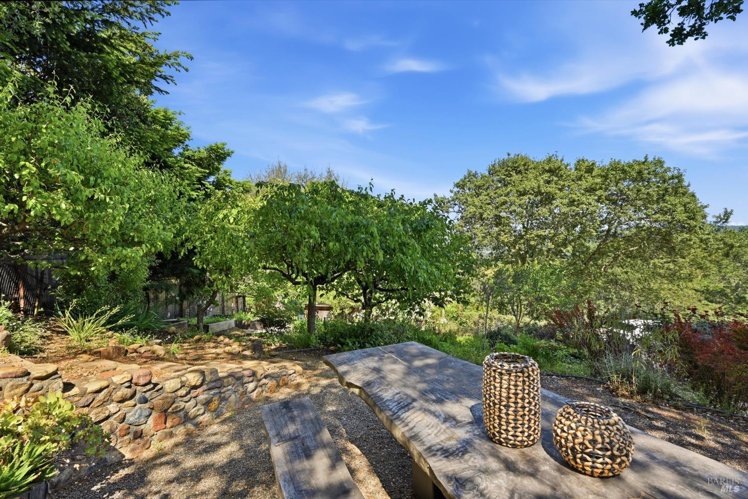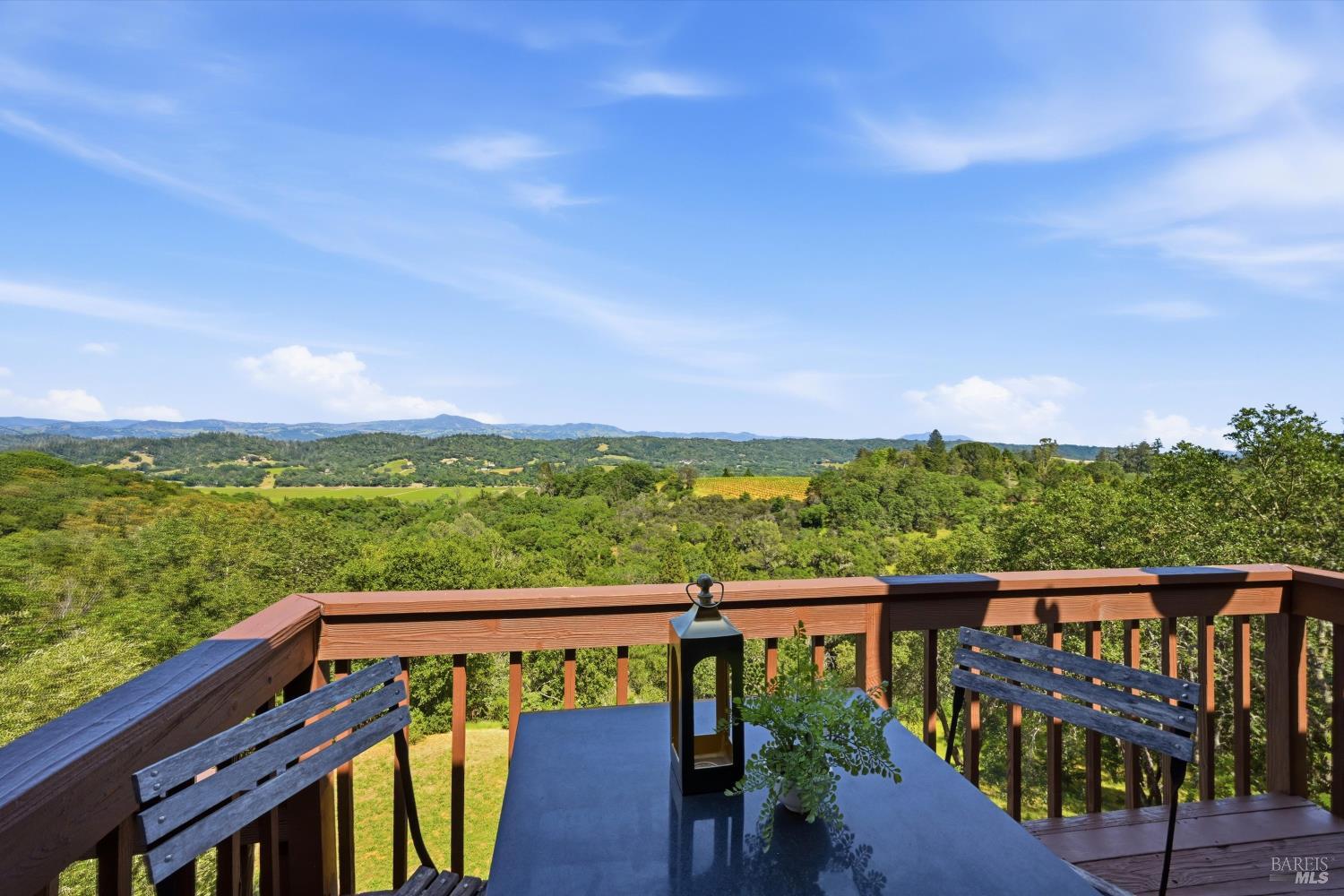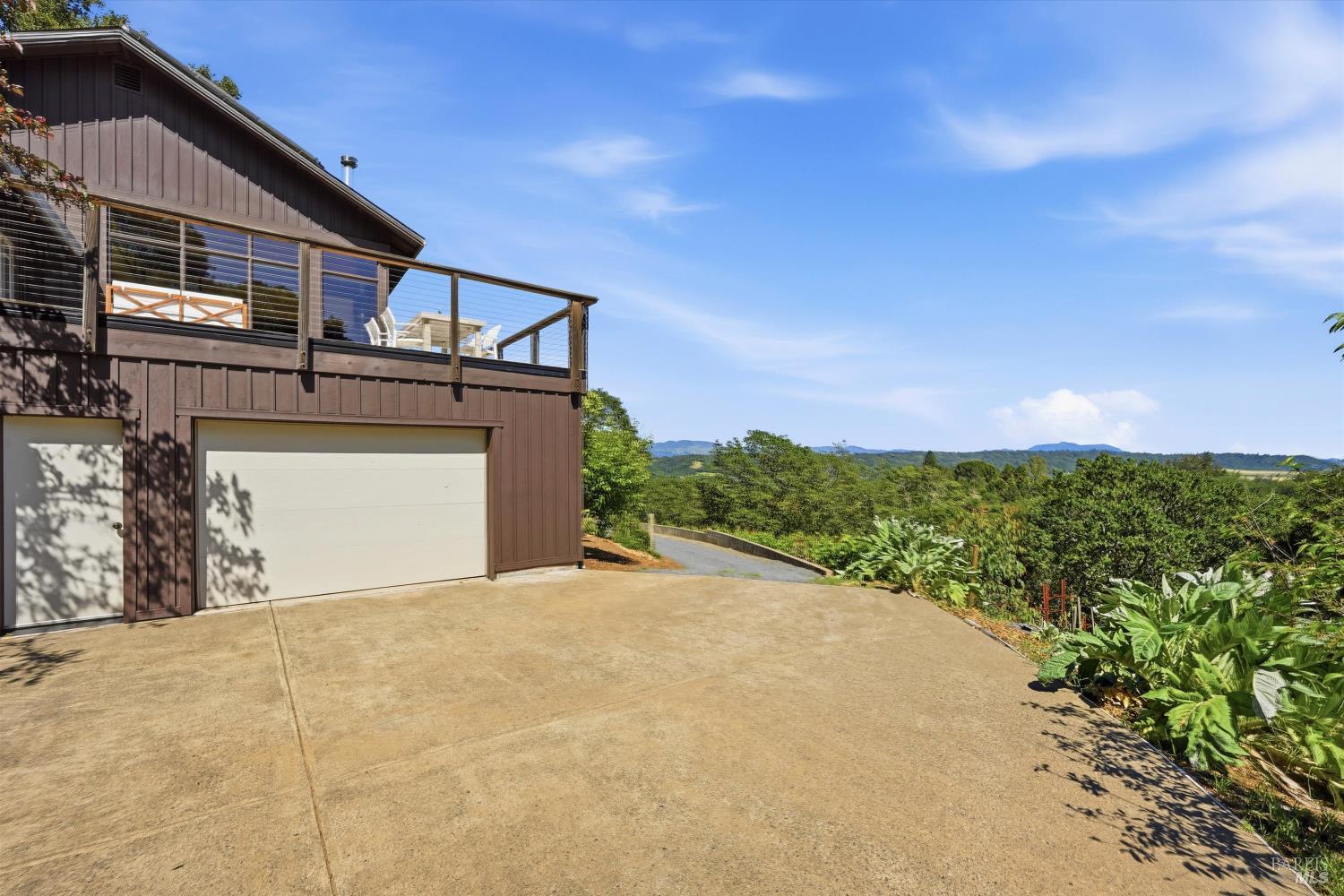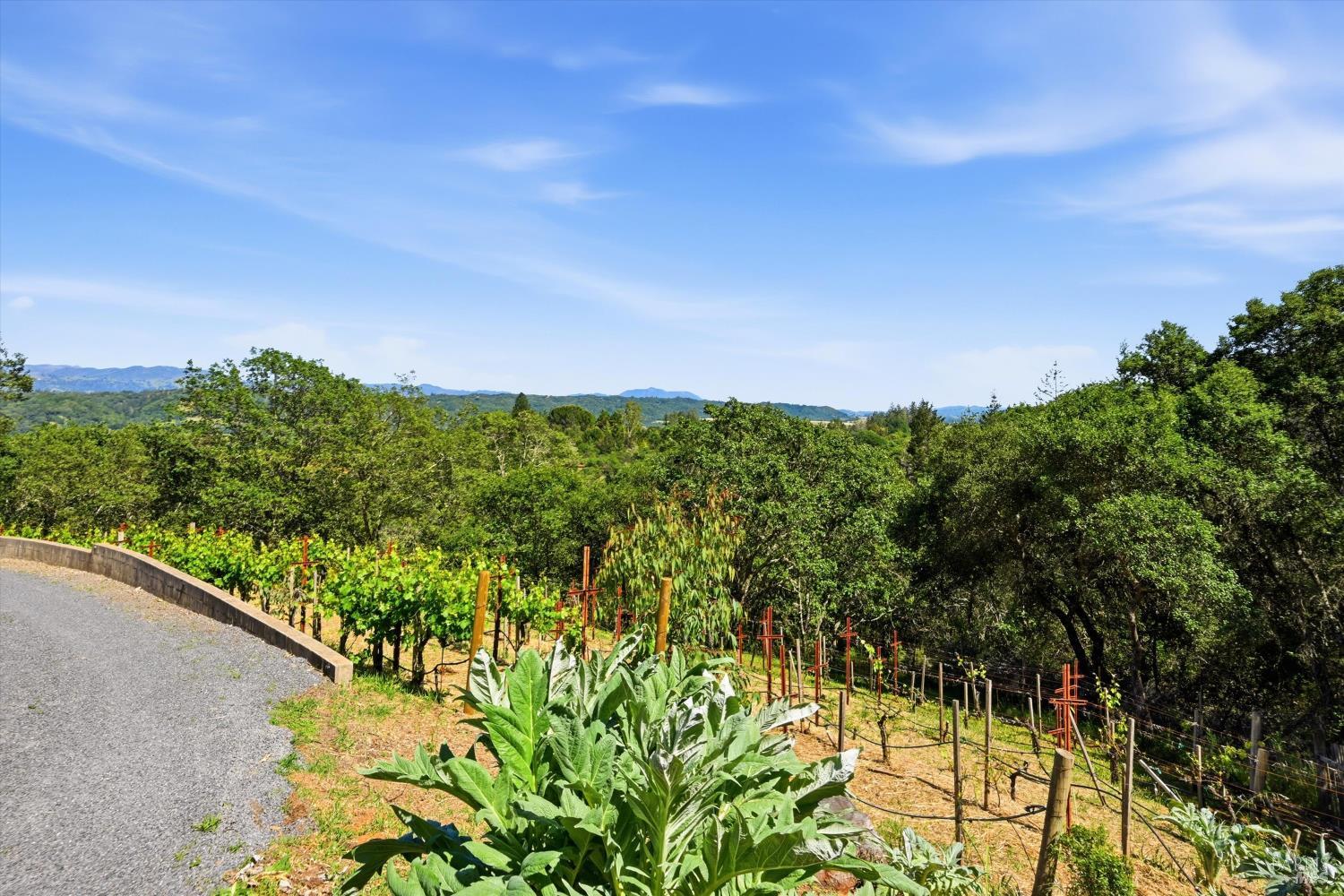 Experience the pinnacle of Wine Country living on this nearly 2-acre retreat, perfectly situated to capture breathtaking views of Sonoma County's Dry Creek Valley. Tucked at the end of a private road with no neighbors in sight, this property features a 3-bed, 2-bath mid-century modern main home and a 1-bed, 1-bath detached cottage. Surrounded by tiered gardens, a hobby vineyard, and tranquil oak woodlands, it offers a seamless blend of nature and sophistication. The main home boasts floor-to-ceiling windows, warm wood finishes, and an expansive deck with panoramic valley views, including Mt. St. Helena. The open living, kitchen, and dining areas flow effortlessly, while the private primary suite features a spa-like bath, walk-in closet, and private deck. Two additional bedrooms share a full bath, and the versatile lower level includes a flex space, laundry, wine cellar, and two-car garage with a workbench. Designed for outdoor entertaining, the property includes an alfresco kitchen with a BBQ, wood-fired pizza oven, and live-edge dining table. Winding paths lead through enchanting gardens, an orchard with citrus, plums,figs, apples, olives plus a ⅓-acre hobby vineyard planted with Zinfandel and Carignan. A seasonal creek, chicken coop, and storage shed add to the charm. The detached unit offers a private haven with a covered porch, tiered deck, vaulted ceilings, and stunning valley views. Its bright living room, open kitchen, cozy bedroom, and full bath make it ideal for guests, multi-generational living, or rental income. Located just 10 minutes from the Dry Creek General Store, 15 minutes from Highway 101, and 20 minutes from Healdsburg Plaza, this property combines luxury, privacy, and convenience, a true Wine Country paradise.