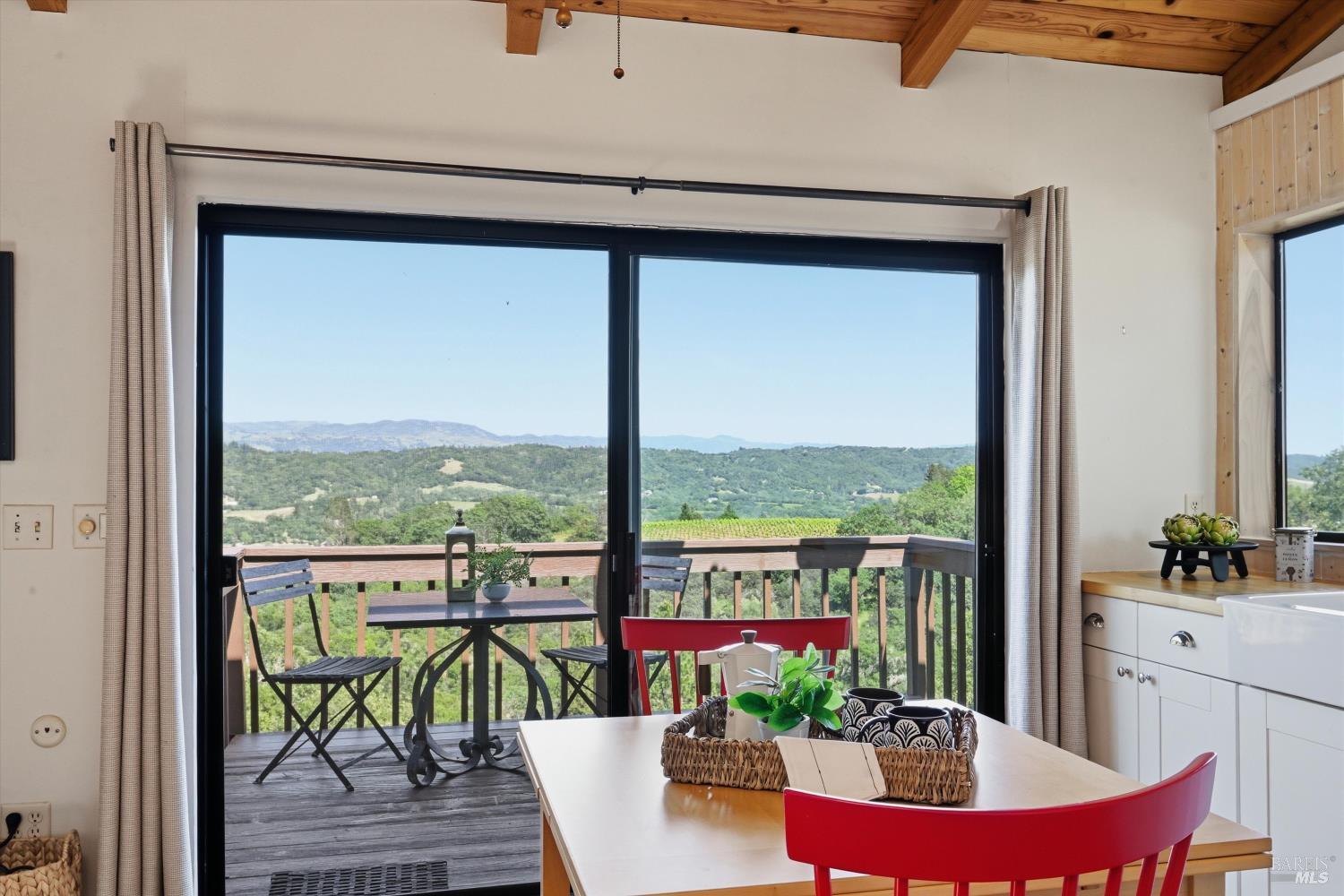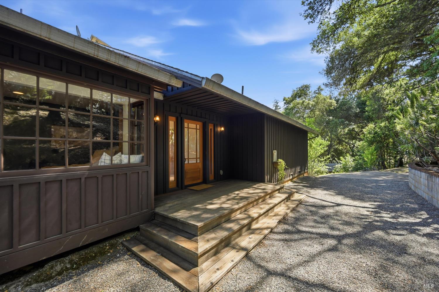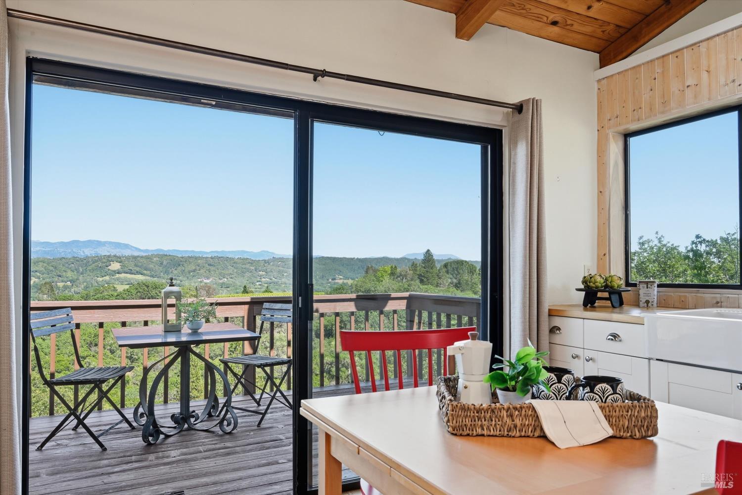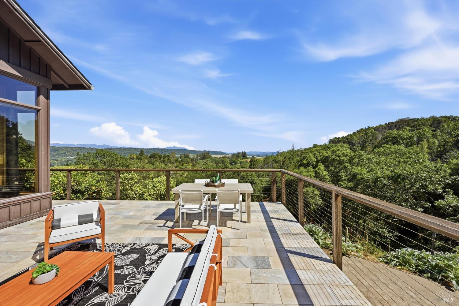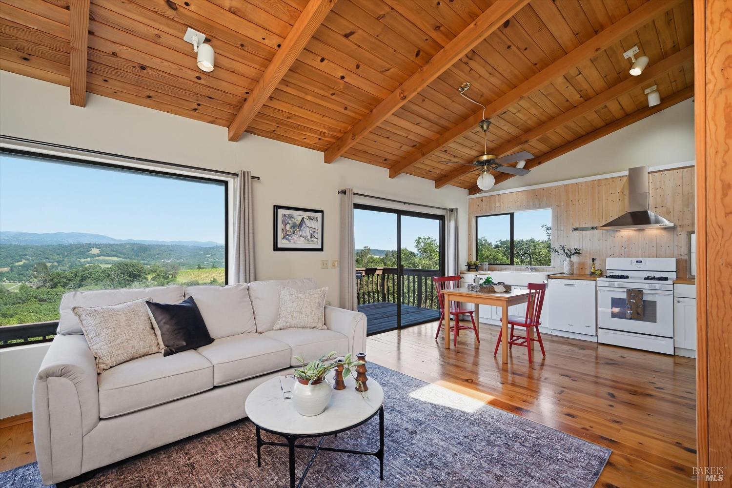 Experience the pinnacle of Wine Country living on this nearly 2-acre retreat, perfectly situated to capture breathtaking views of Sonoma County's Dry Creek Valley. Tucked at the end of a private road with no neighbors in sight, this property features a 3-bed, 2-bath mid-century modern main home and a 1-bed, 1-bath detached cottage. Surrounded by tiered gardens, a hobby vineyard, and tranquil oak woodlands, it offers a seamless blend of nature and sophistication. The main home boasts floor-to-ceiling windows, warm wood finishes, and an expansive deck with panoramic valley views, including Mt. St. Helena. The open living, kitchen, and dining areas flow effortlessly, while the private primary suite features a spa-like bath, walk-in closet, and private deck. Two additional bedrooms share a full bath, and the versatile lower level includes a flex space, laundry, wine cellar, and two-car garage with a workbench. Designed for outdoor entertaining, the property includes an alfresco kitchen with a BBQ, wood-fired pizza oven, and live-edge dining table. Winding paths lead through enchanting gardens, an orchard with citrus, plums,figs, apples, olives plus a ⅓-acre hobby vineyard planted with Zinfandel and Carignan. A seasonal creek, chicken coop, and storage shed add to the charm. The detached unit offers a private haven with a covered porch, tiered deck, vaulted ceilings, and stunning valley views. Its bright living room, open kitchen, cozy bedroom, and full bath make it ideal for guests, multi-generational living, or rental income. Located just 10 minutes from the Dry Creek General Store, 15 minutes from Highway 101, and 20 minutes from Healdsburg Plaza, this property combines luxury, privacy, and convenience, a true Wine Country paradise.