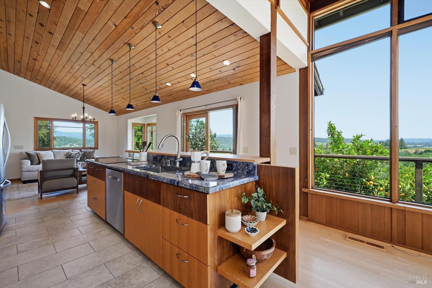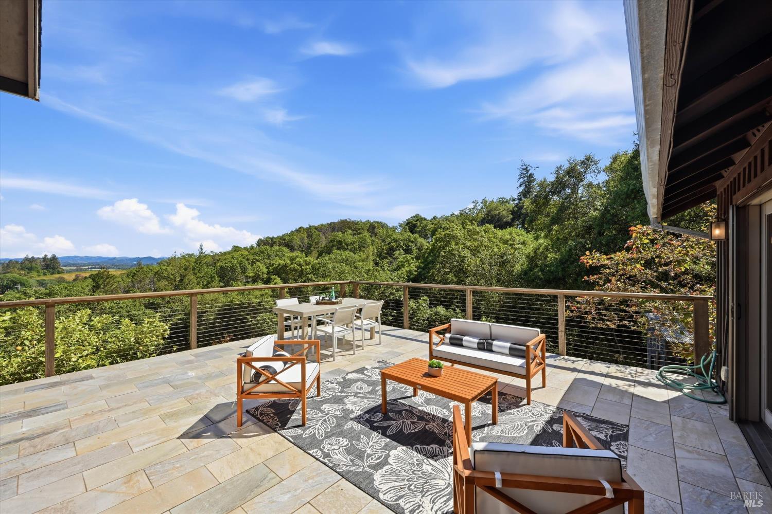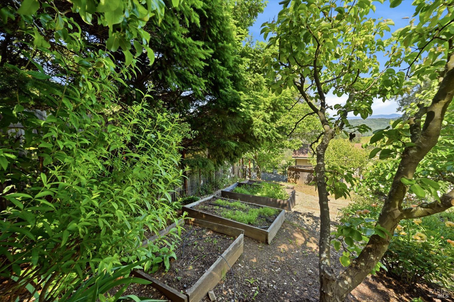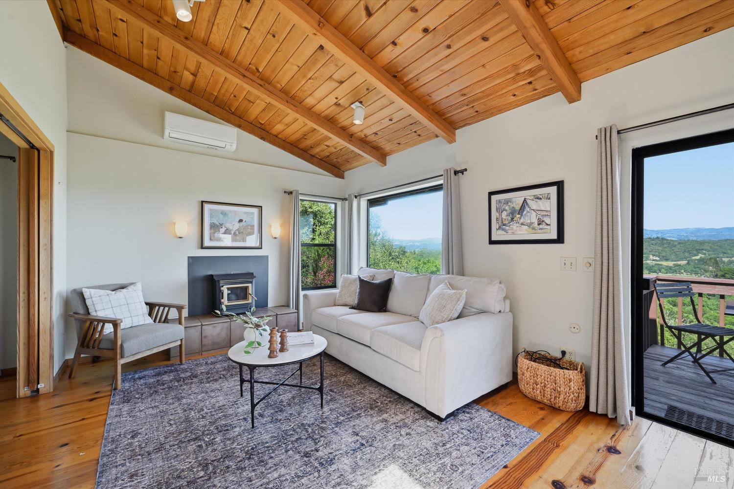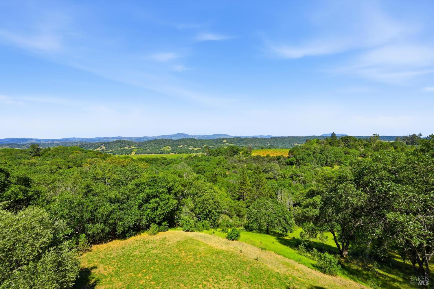 Experience the pinnacle of Wine Country living on this nearly 2-acre retreat, perfectly situated to capture breathtaking views of Sonoma County's Dry Creek Valley. Tucked at the end of a private road with no neighbors in sight, this property features a 3-bed, 2-bath mid-century modern main home and a 1-bed, 1-bath detached cottage. Surrounded by tiered gardens, a hobby vineyard, and tranquil oak woodlands, it offers a seamless blend of nature and sophistication. The main home boasts floor-to-ceiling windows, warm wood finishes, and an expansive deck with panoramic valley views, including Mt. St. Helena. The open living, kitchen, and dining areas flow effortlessly, while the private primary suite features a spa-like bath, walk-in closet, and private deck. Two additional bedrooms share a full bath, and the versatile lower level includes a flex space, laundry, wine cellar, and two-car garage with a workbench. Designed for outdoor entertaining, the property includes an alfresco kitchen with a BBQ, wood-fired pizza oven, and live-edge dining table. Winding paths lead through enchanting gardens, an orchard with citrus, plums,figs, apples, olives plus a ⅓-acre hobby vineyard planted with Zinfandel and Carignan. A seasonal creek, chicken coop, and storage shed add to the charm. The detached unit offers a private haven with a covered porch, tiered deck, vaulted ceilings, and stunning valley views. Its bright living room, open kitchen, cozy bedroom, and full bath make it ideal for guests, multi-generational living, or rental income. Located just 10 minutes from the Dry Creek General Store, 15 minutes from Highway 101, and 20 minutes from Healdsburg Plaza, this property combines luxury, privacy, and convenience, a true Wine Country paradise.