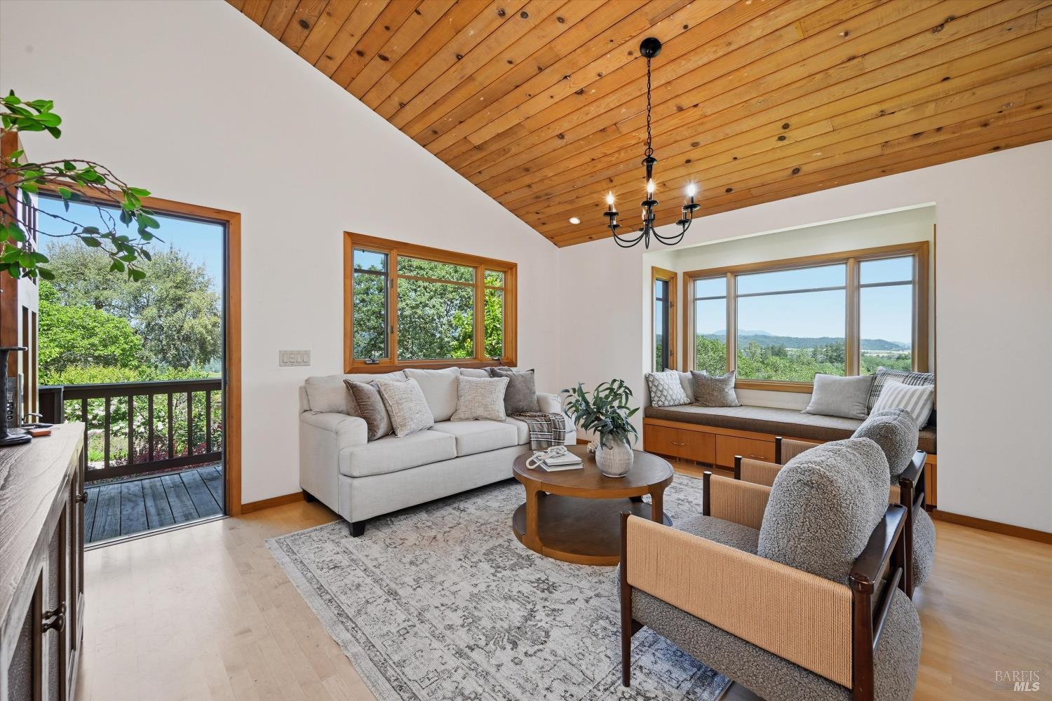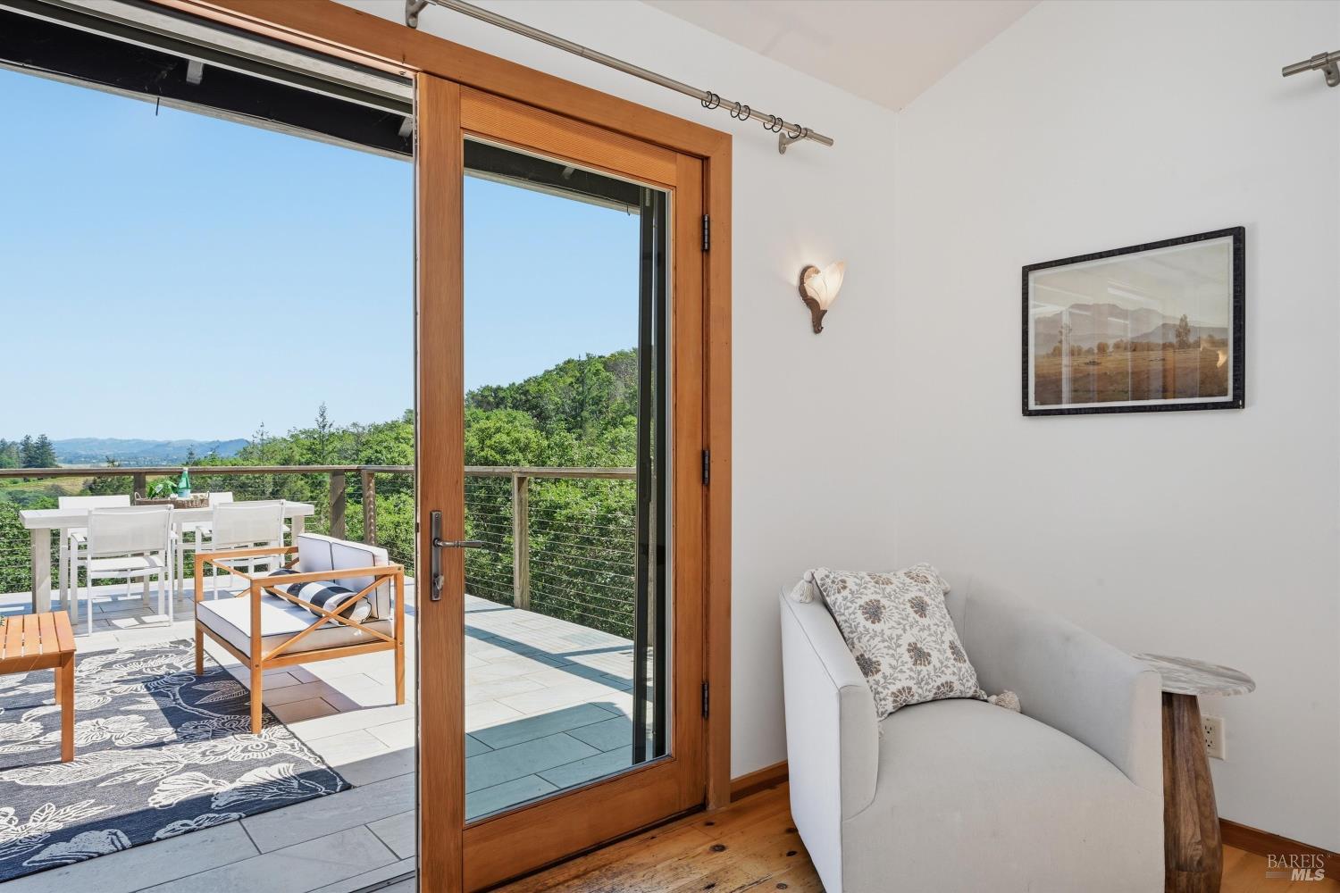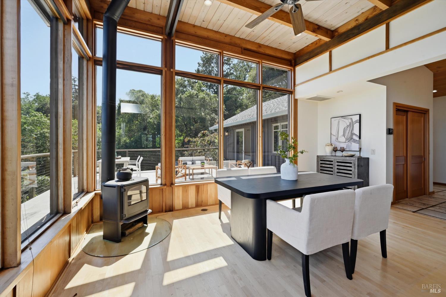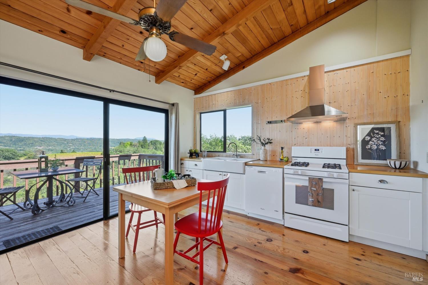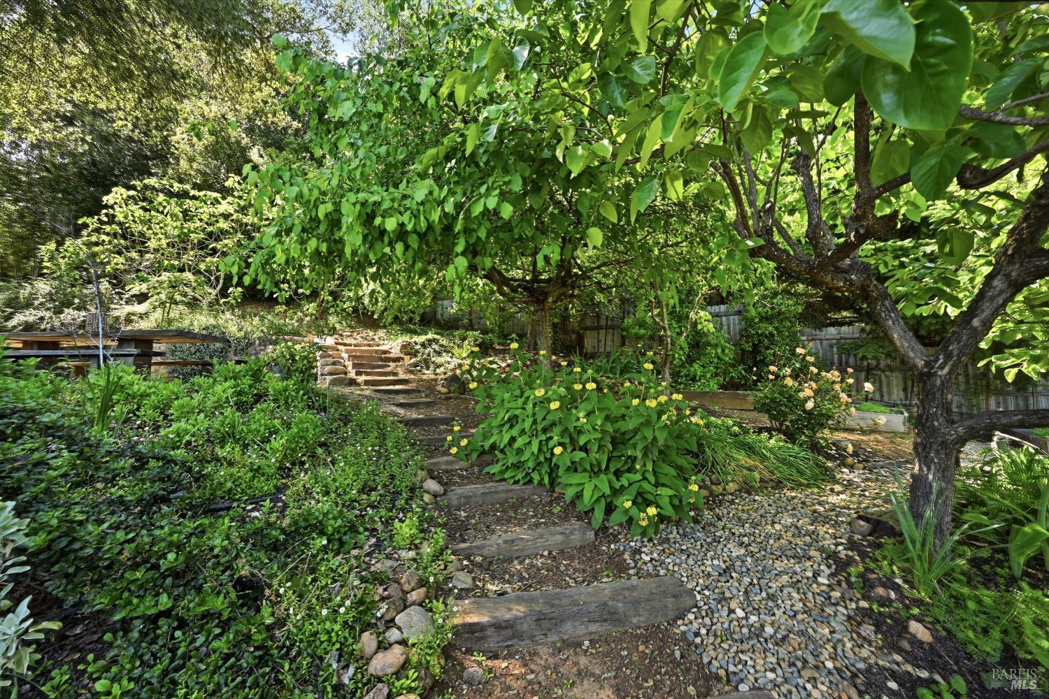 Experience the pinnacle of Wine Country living on this nearly 2-acre retreat, perfectly situated to capture breathtaking views of Sonoma County's Dry Creek Valley. Tucked at the end of a private road with no neighbors in sight, this property features a 3-bed, 2-bath mid-century modern main home and a 1-bed, 1-bath detached cottage. Surrounded by tiered gardens, a hobby vineyard, and tranquil oak woodlands, it offers a seamless blend of nature and sophistication. The main home boasts floor-to-ceiling windows, warm wood finishes, and an expansive deck with panoramic valley views, including Mt. St. Helena. The open living, kitchen, and dining areas flow effortlessly, while the private primary suite features a spa-like bath, walk-in closet, and private deck. Two additional bedrooms share a full bath, and the versatile lower level includes a flex space, laundry, wine cellar, and two-car garage with a workbench. Designed for outdoor entertaining, the property includes an alfresco kitchen with a BBQ, wood-fired pizza oven, and live-edge dining table. Winding paths lead through enchanting gardens, an orchard with citrus, plums,figs, apples, olives plus a ⅓-acre hobby vineyard planted with Zinfandel and Carignan. A seasonal creek, chicken coop, and storage shed add to the charm. The detached unit offers a private haven with a covered porch, tiered deck, vaulted ceilings, and stunning valley views. Its bright living room, open kitchen, cozy bedroom, and full bath make it ideal for guests, multi-generational living, or rental income. Located just 10 minutes from the Dry Creek General Store, 15 minutes from Highway 101, and 20 minutes from Healdsburg Plaza, this property combines luxury, privacy, and convenience, a true Wine Country paradise.