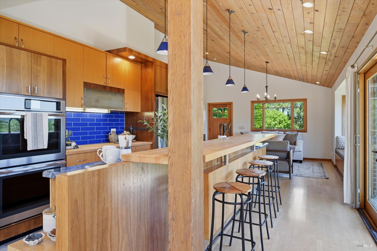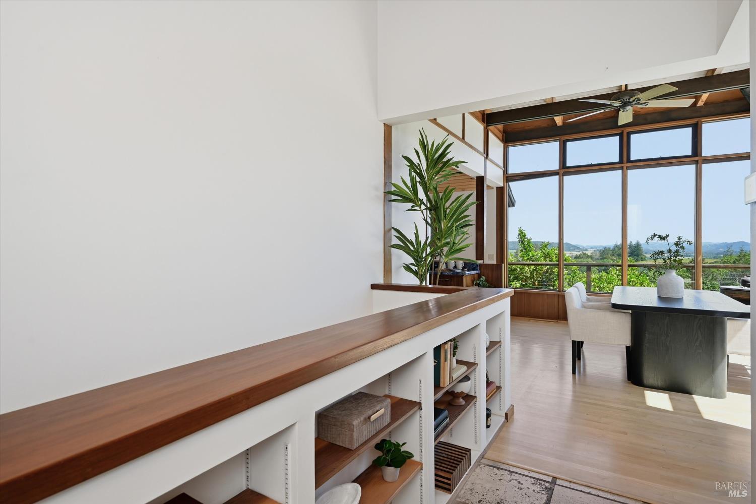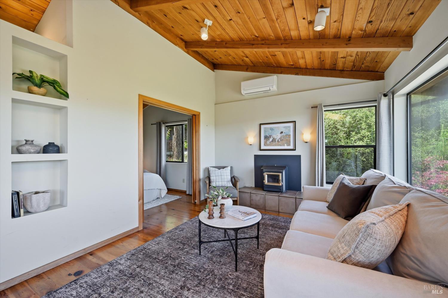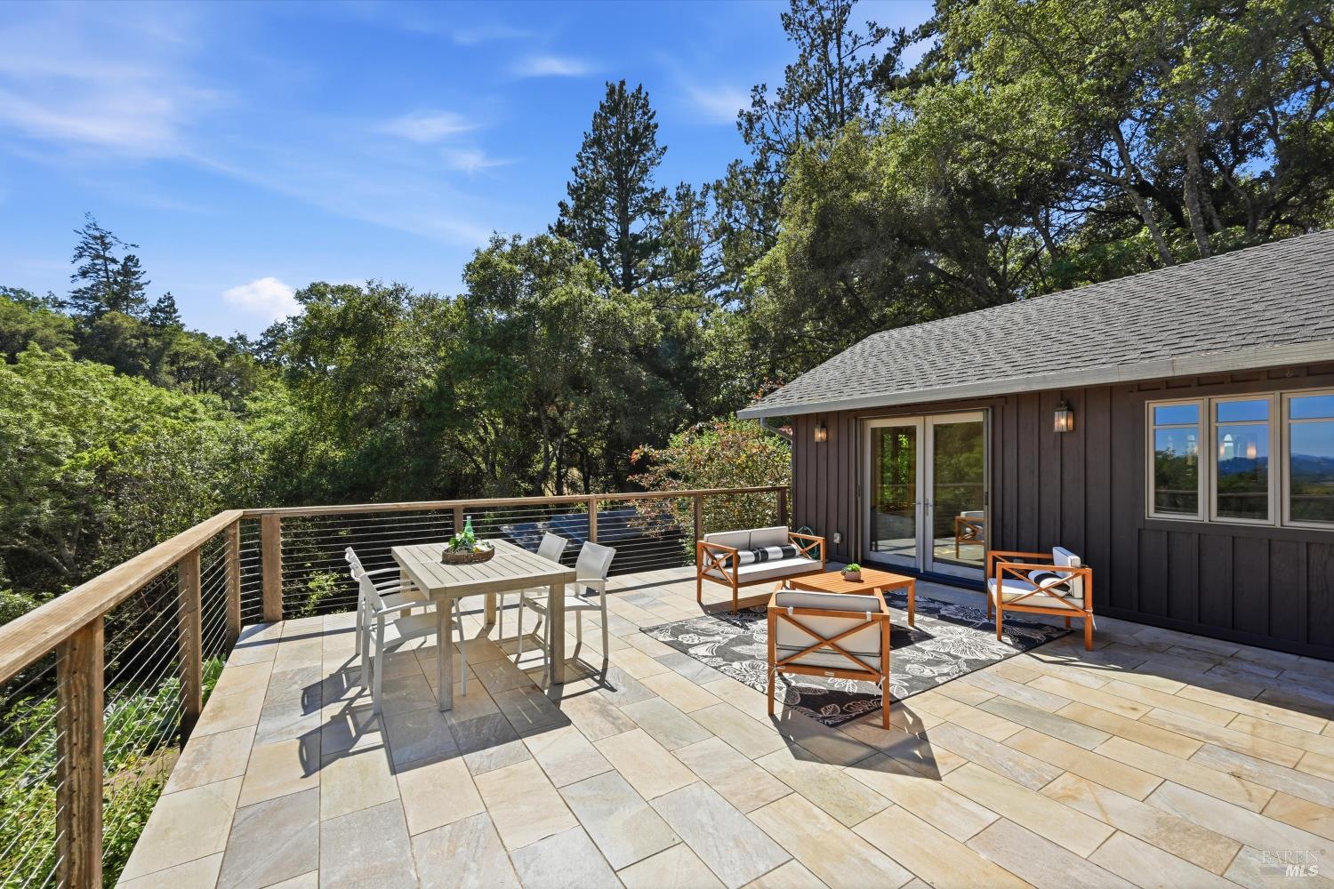 Experience the pinnacle of Wine Country living on this nearly 2-acre retreat, perfectly situated to capture breathtaking views of Sonoma County's Dry Creek Valley. Tucked at the end of a private road with no neighbors in sight, this property features a 3-bed, 2-bath mid-century modern main home and a 1-bed, 1-bath detached cottage. Surrounded by tiered gardens, a hobby vineyard, and tranquil oak woodlands, it offers a seamless blend of nature and sophistication. The main home boasts floor-to-ceiling windows, warm wood finishes, and an expansive deck with panoramic valley views, including Mt. St. Helena. The open living, kitchen, and dining areas flow effortlessly, while the private primary suite features a spa-like bath, walk-in closet, and private deck. Two additional bedrooms share a full bath, and the versatile lower level includes a flex space, laundry, wine cellar, and two-car garage with a workbench. Designed for outdoor entertaining, the property includes an alfresco kitchen with a BBQ, wood-fired pizza oven, and live-edge dining table. Winding paths lead through enchanting gardens, an orchard with citrus, plums,figs, apples, olives plus a ⅓-acre hobby vineyard planted with Zinfandel and Carignan. A seasonal creek, chicken coop, and storage shed add to the charm. The detached unit offers a private haven with a covered porch, tiered deck, vaulted ceilings, and stunning valley views. Its bright living room, open kitchen, cozy bedroom, and full bath make it ideal for guests, multi-generational living, or rental income. Located just 10 minutes from the Dry Creek General Store, 15 minutes from Highway 101, and 20 minutes from Healdsburg Plaza, this property combines luxury, privacy, and convenience, a true Wine Country paradise.