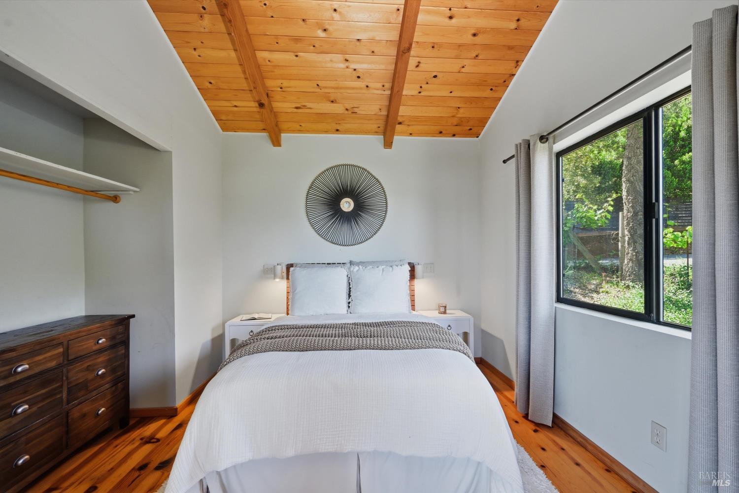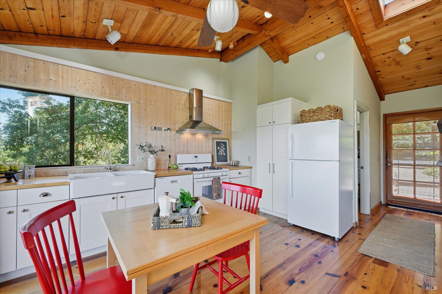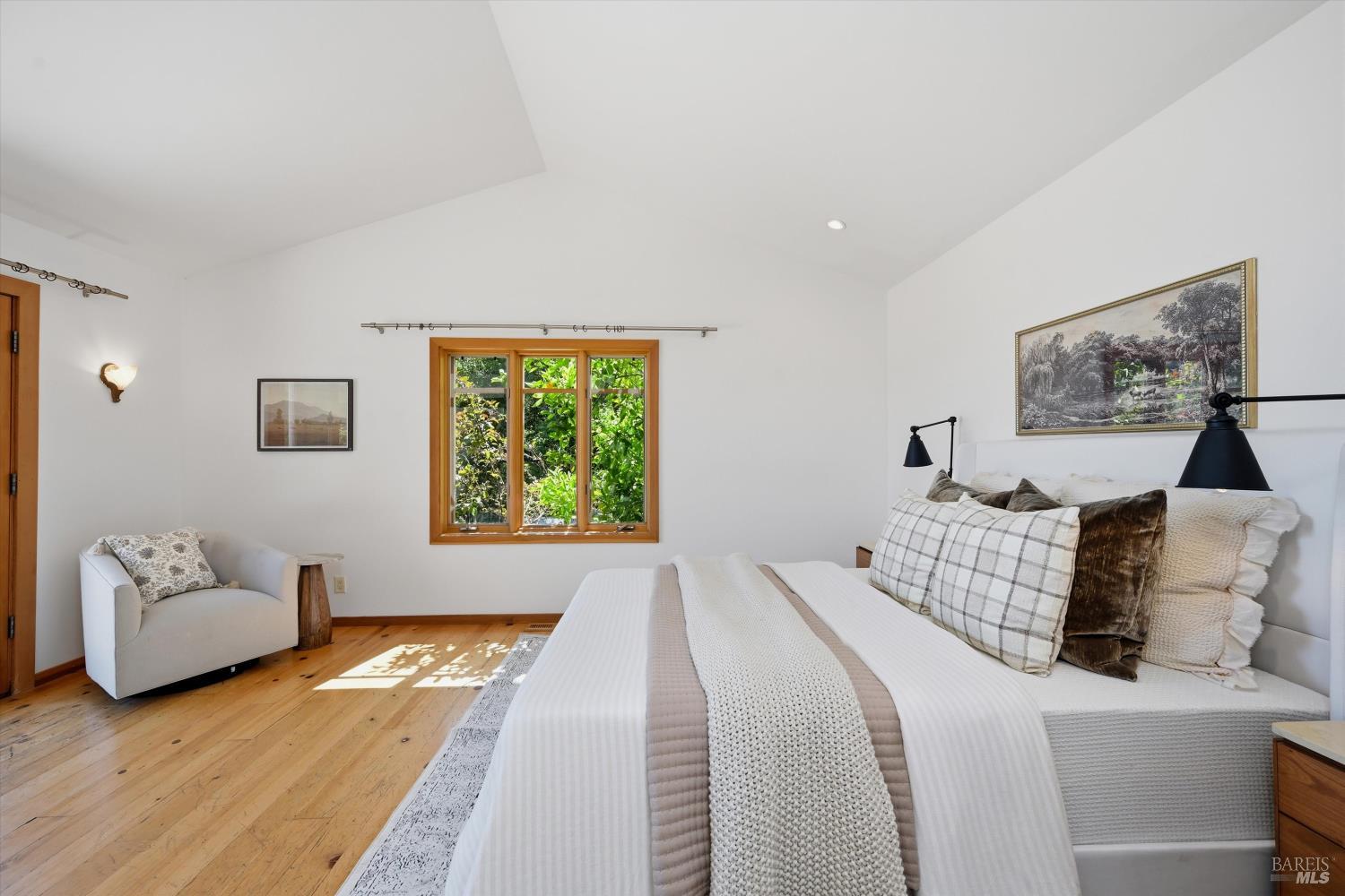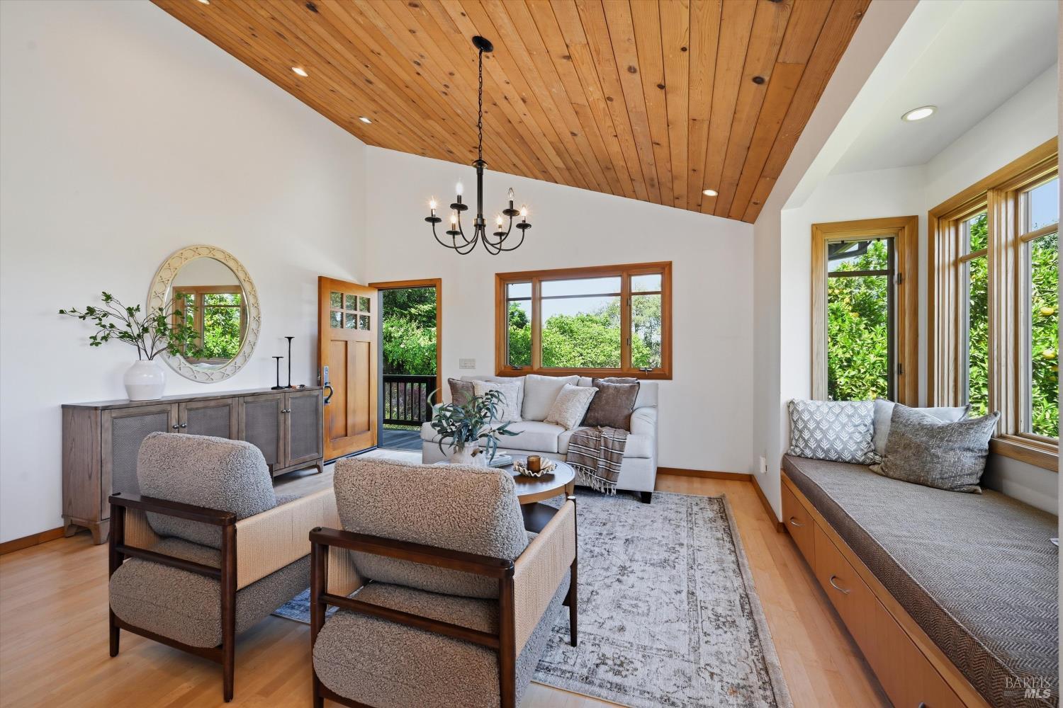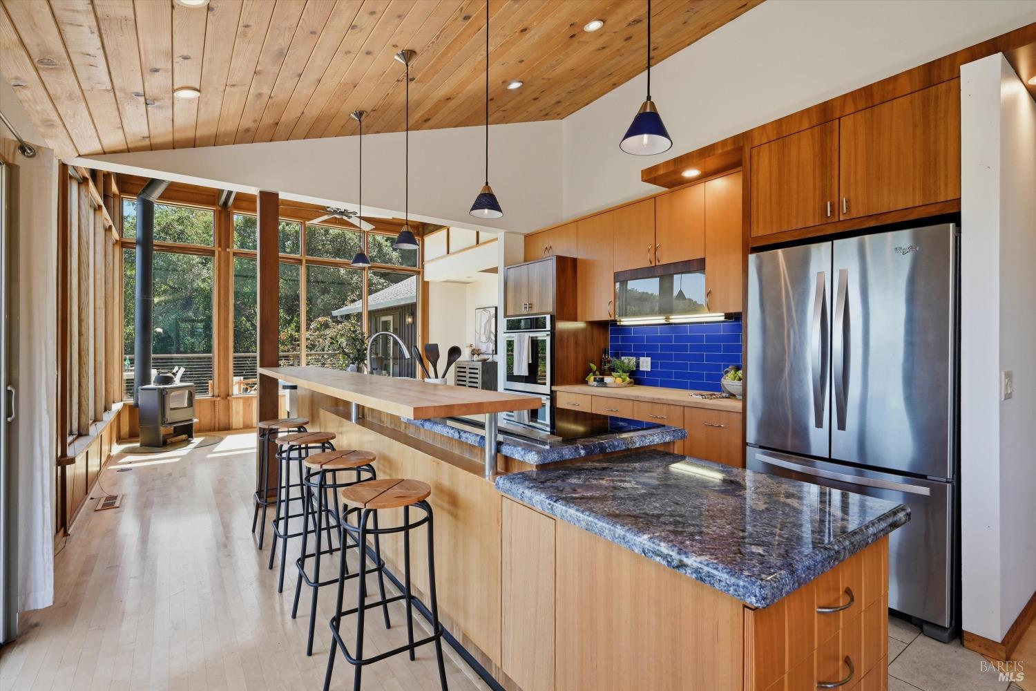 Experience the pinnacle of Wine Country living on this nearly 2-acre retreat, perfectly situated to capture breathtaking views of Sonoma County's Dry Creek Valley. Tucked at the end of a private road with no neighbors in sight, this property features a 3-bed, 2-bath mid-century modern main home and a 1-bed, 1-bath detached cottage. Surrounded by tiered gardens, a hobby vineyard, and tranquil oak woodlands, it offers a seamless blend of nature and sophistication. The main home boasts floor-to-ceiling windows, warm wood finishes, and an expansive deck with panoramic valley views, including Mt. St. Helena. The open living, kitchen, and dining areas flow effortlessly, while the private primary suite features a spa-like bath, walk-in closet, and private deck. Two additional bedrooms share a full bath, and the versatile lower level includes a flex space, laundry, wine cellar, and two-car garage with a workbench. Designed for outdoor entertaining, the property includes an alfresco kitchen with a BBQ, wood-fired pizza oven, and live-edge dining table. Winding paths lead through enchanting gardens, an orchard with citrus, plums,figs, apples, olives plus a ⅓-acre hobby vineyard planted with Zinfandel and Carignan. A seasonal creek, chicken coop, and storage shed add to the charm. The detached unit offers a private haven with a covered porch, tiered deck, vaulted ceilings, and stunning valley views. Its bright living room, open kitchen, cozy bedroom, and full bath make it ideal for guests, multi-generational living, or rental income. Located just 10 minutes from the Dry Creek General Store, 15 minutes from Highway 101, and 20 minutes from Healdsburg Plaza, this property combines luxury, privacy, and convenience, a true Wine Country paradise.