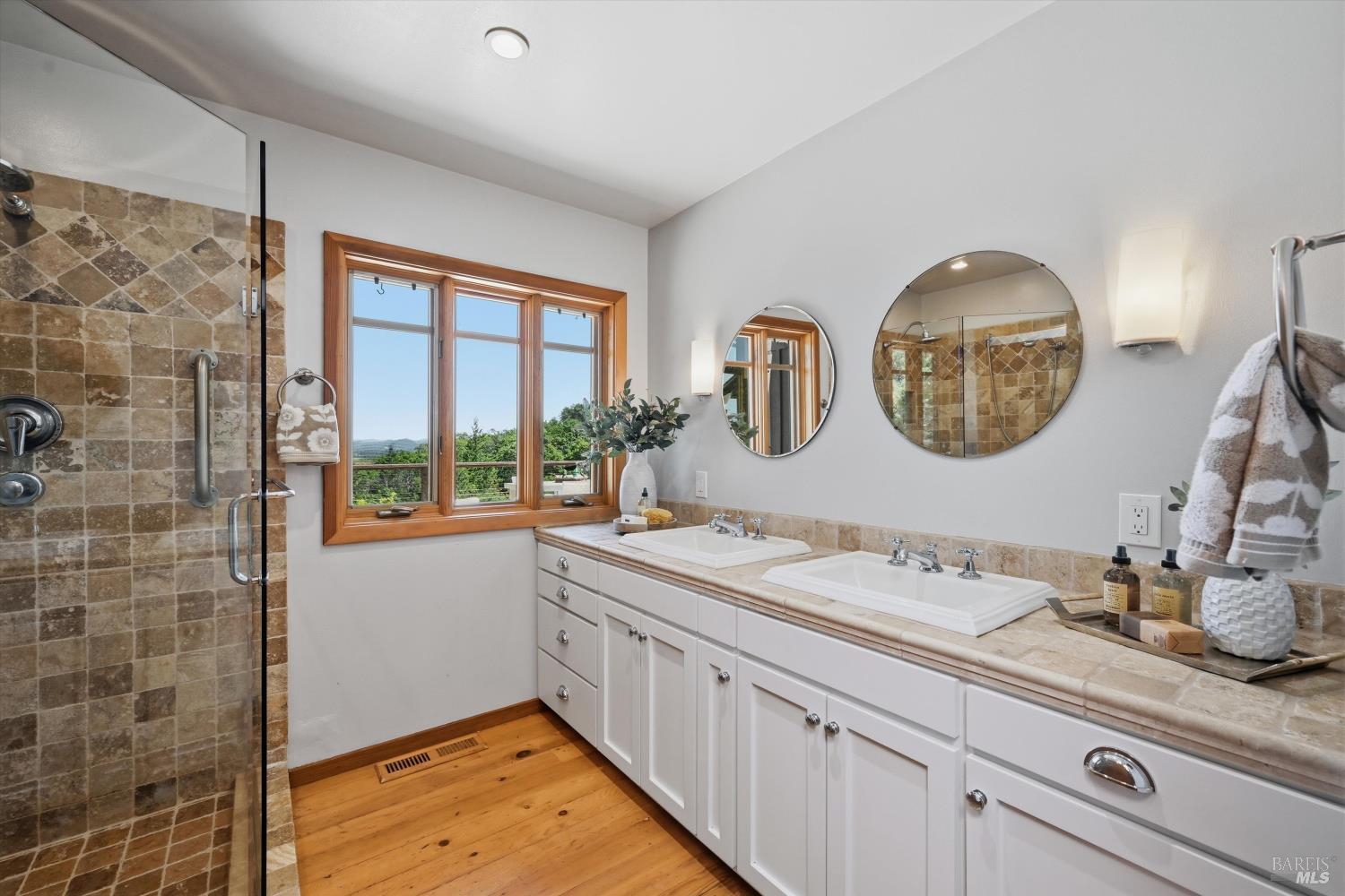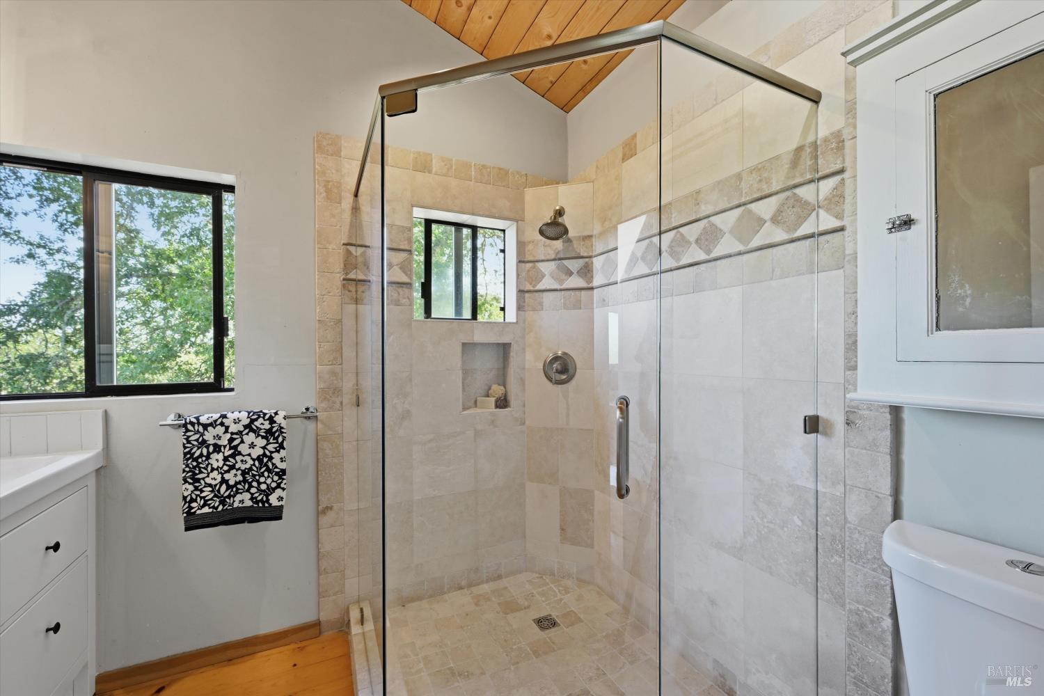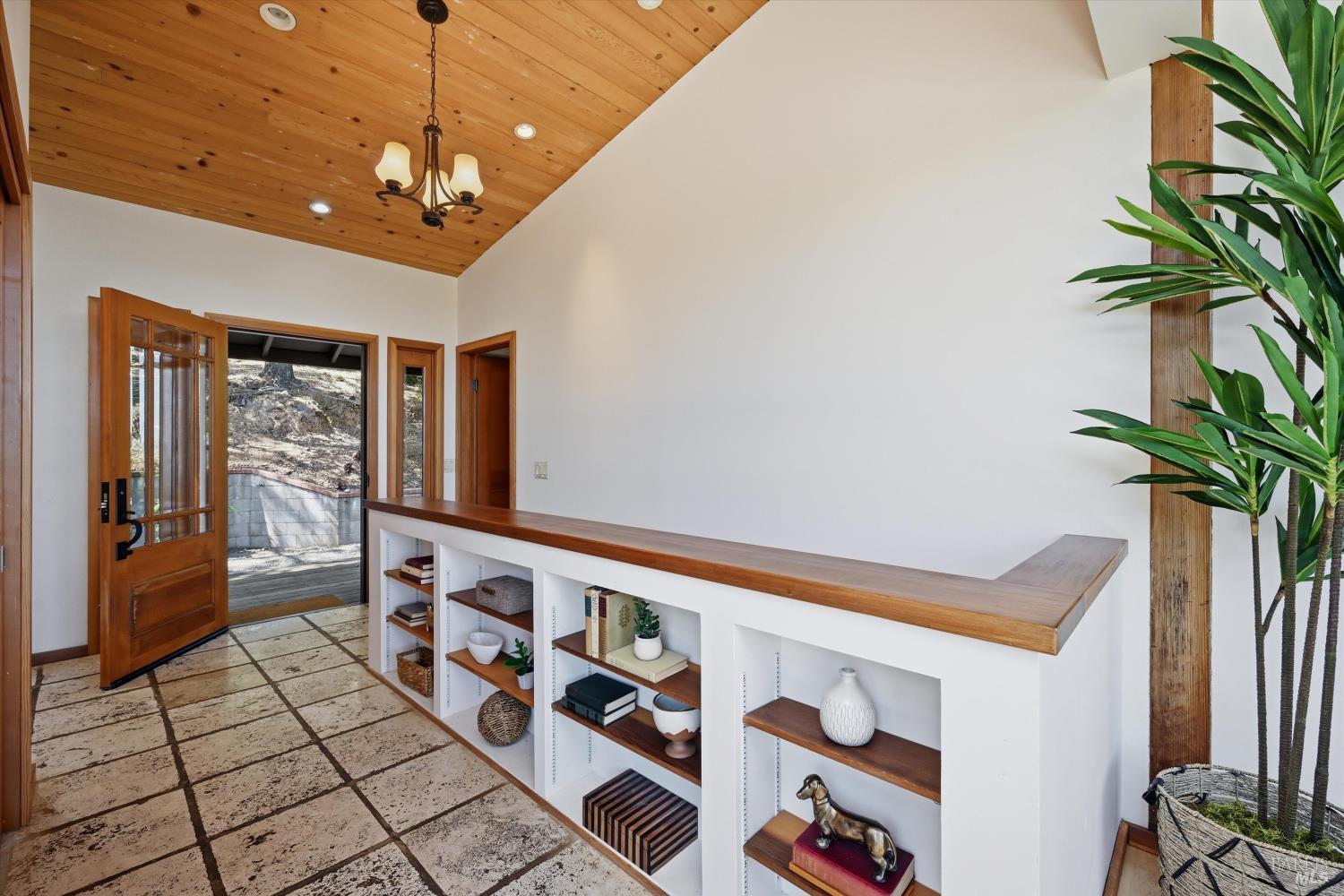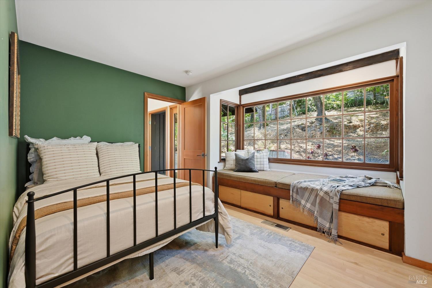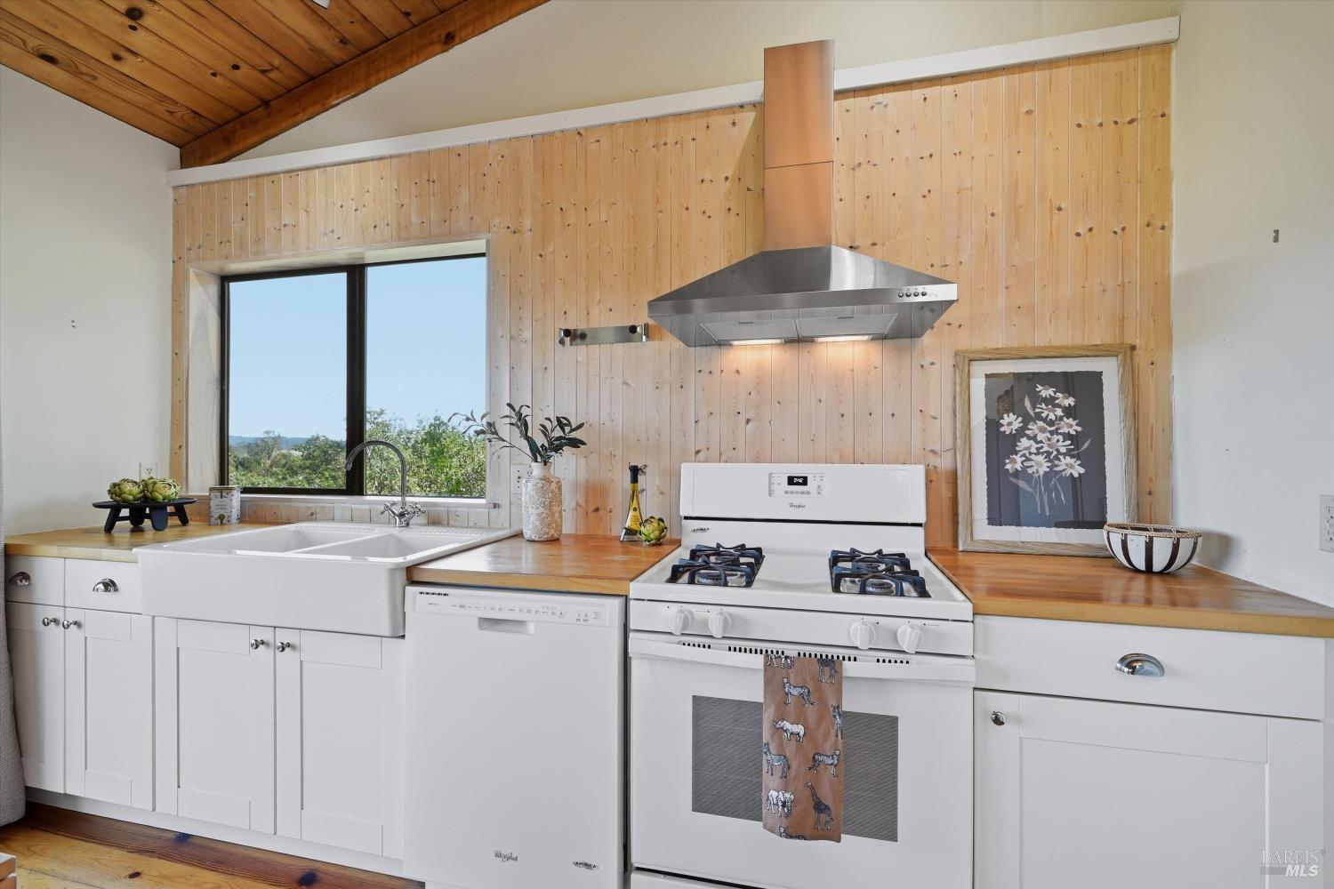 Experience the pinnacle of Wine Country living on this nearly 2-acre retreat, perfectly situated to capture breathtaking views of Sonoma County's Dry Creek Valley. Tucked at the end of a private road with no neighbors in sight, this property features a 3-bed, 2-bath mid-century modern main home and a 1-bed, 1-bath detached cottage. Surrounded by tiered gardens, a hobby vineyard, and tranquil oak woodlands, it offers a seamless blend of nature and sophistication. The main home boasts floor-to-ceiling windows, warm wood finishes, and an expansive deck with panoramic valley views, including Mt. St. Helena. The open living, kitchen, and dining areas flow effortlessly, while the private primary suite features a spa-like bath, walk-in closet, and private deck. Two additional bedrooms share a full bath, and the versatile lower level includes a flex space, laundry, wine cellar, and two-car garage with a workbench. Designed for outdoor entertaining, the property includes an alfresco kitchen with a BBQ, wood-fired pizza oven, and live-edge dining table. Winding paths lead through enchanting gardens, an orchard with citrus, plums,figs, apples, olives plus a ⅓-acre hobby vineyard planted with Zinfandel and Carignan. A seasonal creek, chicken coop, and storage shed add to the charm. The detached unit offers a private haven with a covered porch, tiered deck, vaulted ceilings, and stunning valley views. Its bright living room, open kitchen, cozy bedroom, and full bath make it ideal for guests, multi-generational living, or rental income. Located just 10 minutes from the Dry Creek General Store, 15 minutes from Highway 101, and 20 minutes from Healdsburg Plaza, this property combines luxury, privacy, and convenience, a true Wine Country paradise.