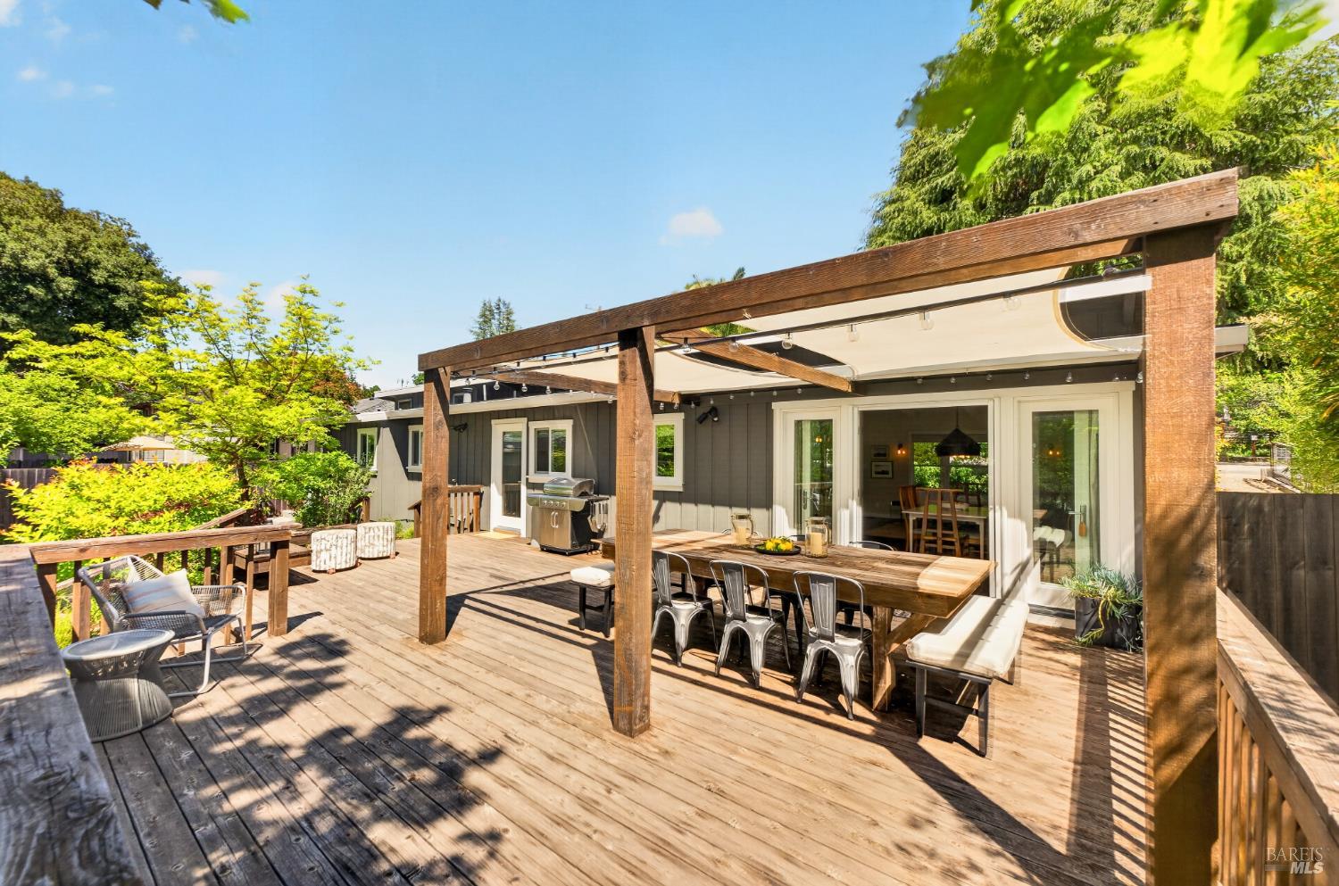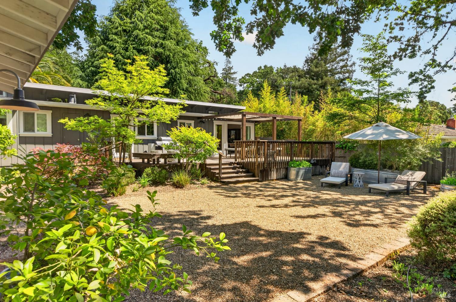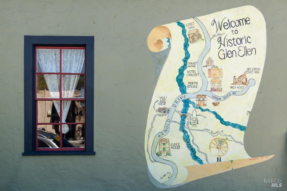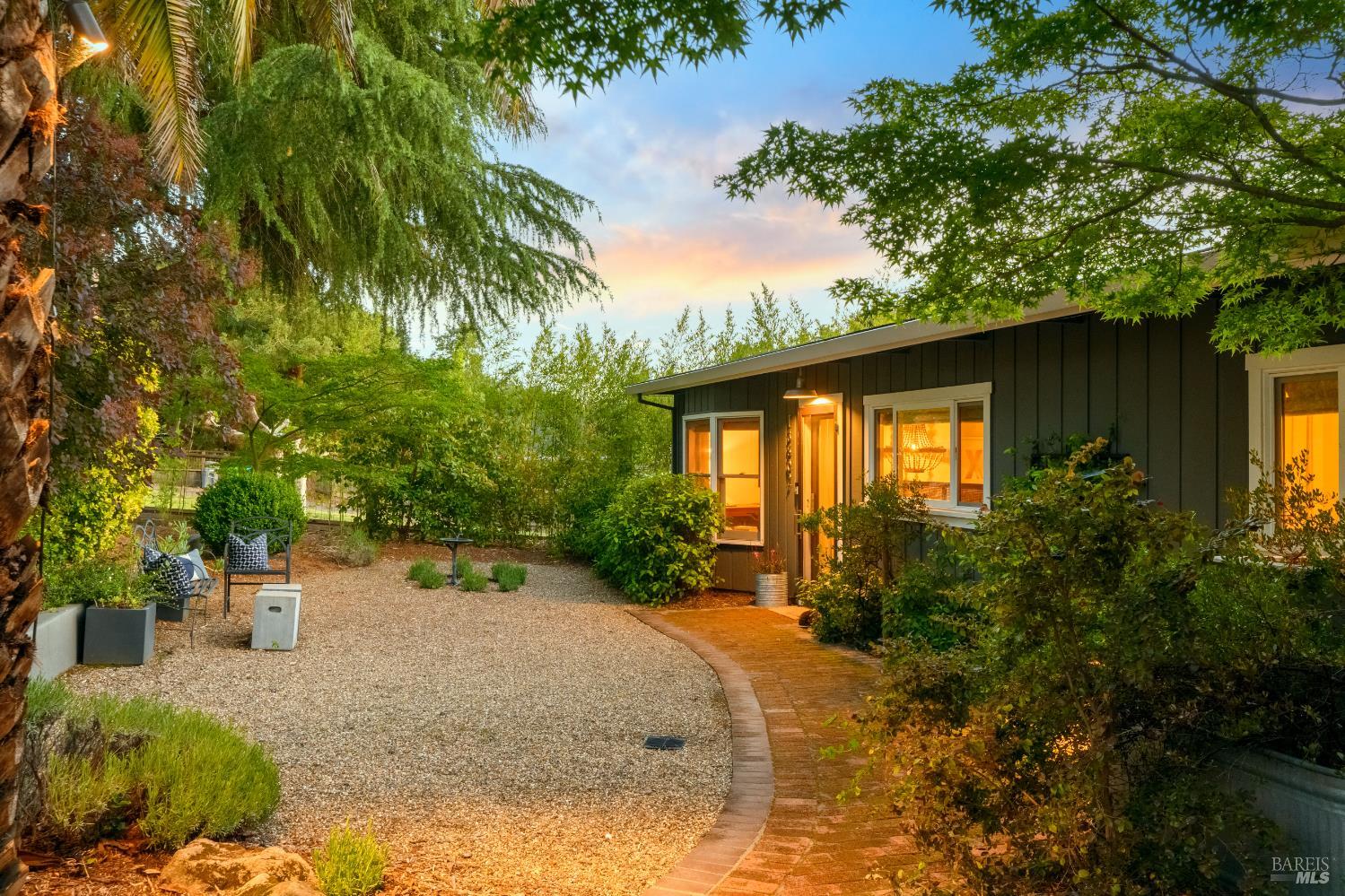 Tucked along a downtown Glen Ellen lane, this beautifully renovated 1954 Mid-Century Modern delivers 3 bedrooms, 2 baths, and an effortless indoor-outdoor flow on approximately 1/3 acre with Sonoma Mountain views. Just blocks from acclaimed restaurants, tasting rooms, a French bakery and gourmet market, the location is as compelling as the home itself. Inside, soaring beam ceilings, skylights, smooth walls, a bay window, and plank flooring create a crisp, contemporary feel, while the stylish kitchen pairs a Bertazzoni range, double farm sink, soft-close cabinetry, Miele dishwasher, and pantry with everyday function. The expansive primary suite accesses the grounds, and both baths have been freshly updated with sleek tile and glass showers. Outside, lush gardens, a generous entertaining deck with custom shade, and room for a pool invite relaxed Sonoma living, with space for lounging, gardening, and play, plus a storage building and public utilities. Sophisticated, refreshed, and move-in ready, this is Glen Ellen living with a modern edge.