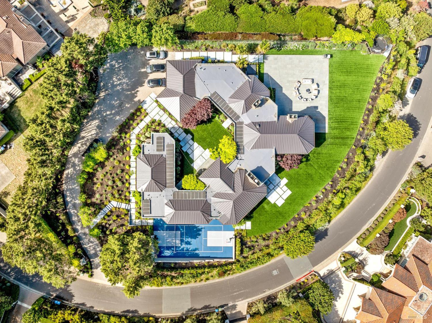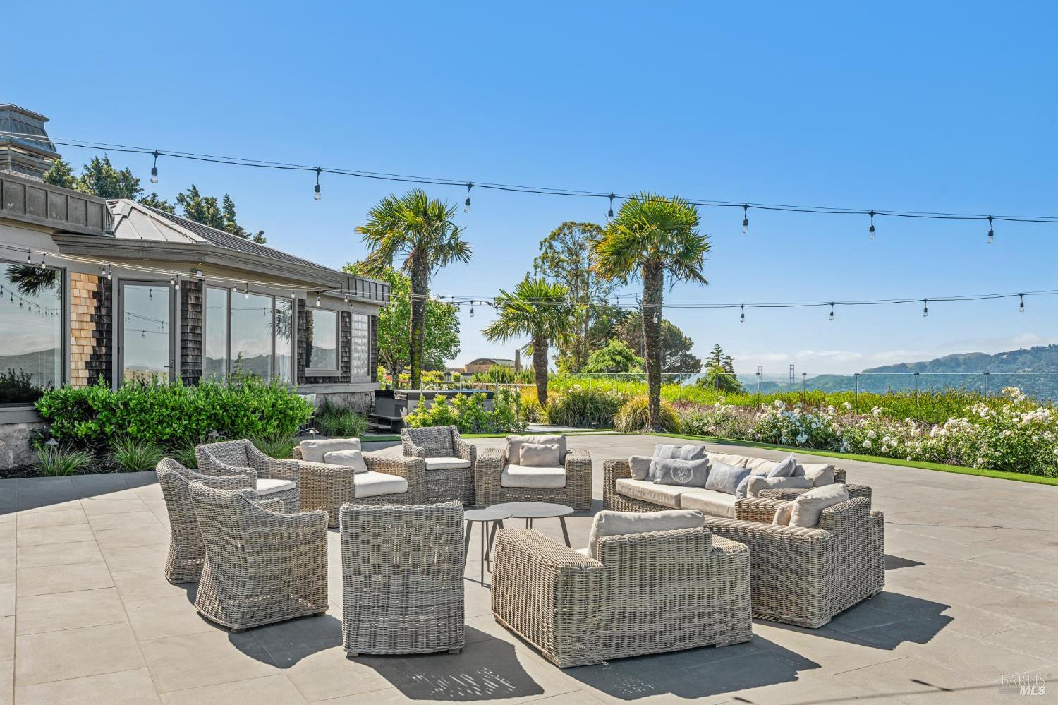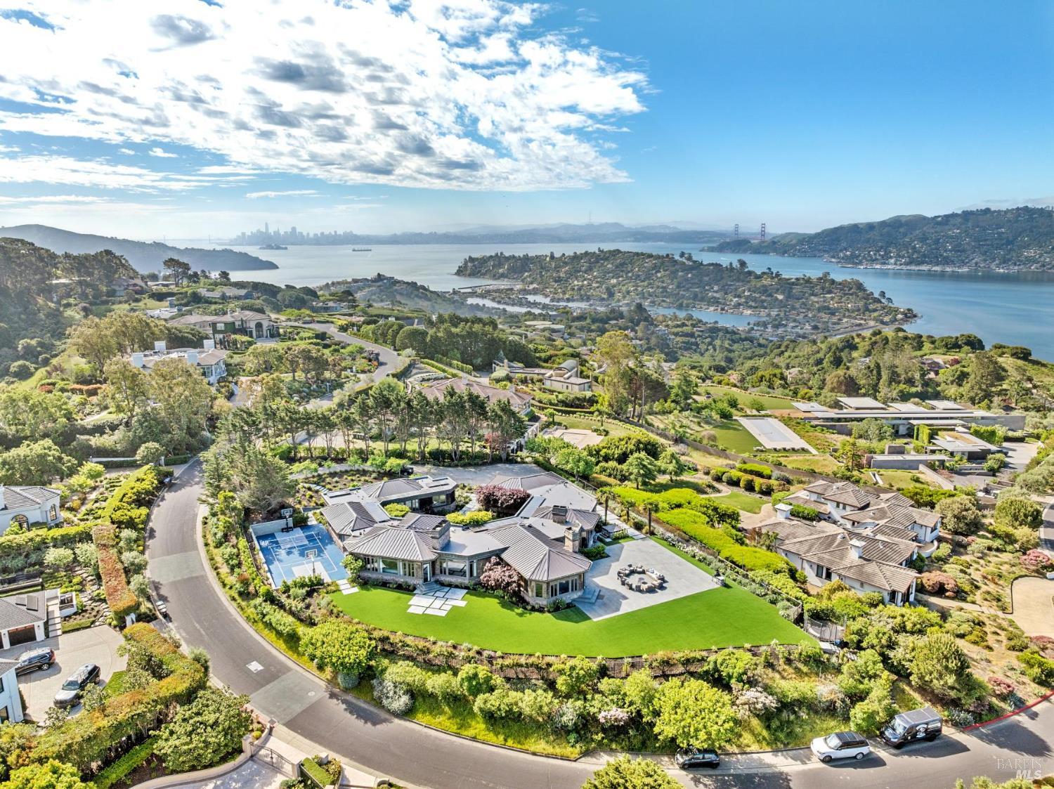A rare lease opportunity in one of Tiburon's most coveted settings, this exceptional single-level estate sits on approximately one acre of beautifully level grounds, capturing sweeping, panoramic views of the San Francisco Bay, the Golden Gate Bridge, and beyond. Designed for effortless indoor-outdoor living, the property offers expansive lawns ideal for entertaining, along with a sport court, pickleball court, hot tub, cold plunge, and multiple terraces that invite gatherings of any scale. A long, private gated drive leads to a generous motor court and a three-car garage, creating both presence and privacy. Inside, the home is equally impressive. The kitchen and adjoining great room are truly showpiecesthoughtfully designed, light-filled, and perfectly scaled for everyday living and entertaining alike. A grand living room, formal dining space, and a separate office provide flexibility and comfort, all on one level. Offered for lease furnished or unfurnished for a one-year term beginning early fall, this is a turnkey opportunity to experience the best of Tiburon living in a truly special setting.