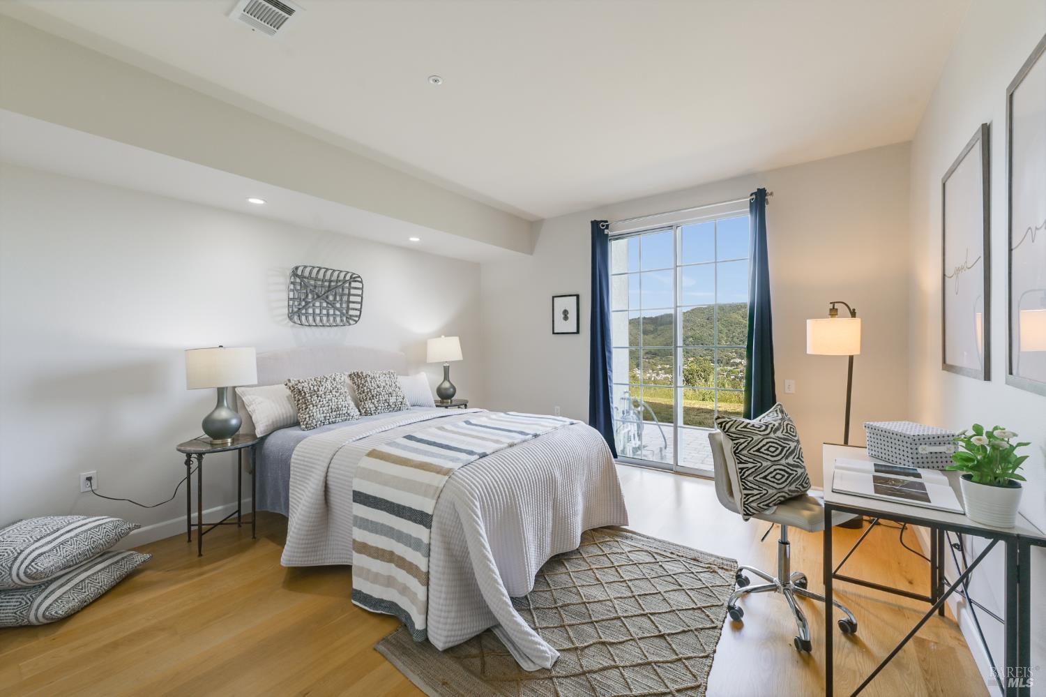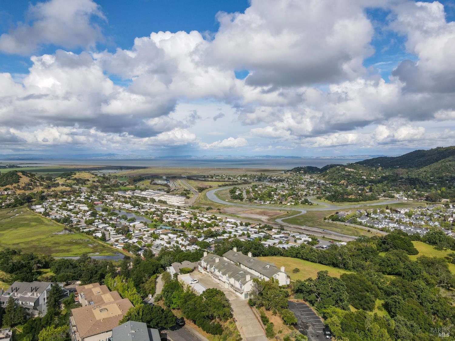 Step into this beautiful 2BR/2BA ground-floor condo that perfectly combines serene living with breathtaking panoramic views. Nestled within an intimate complex of just nine units, this rare single-level gem offers an exceptional blend of tranquility and convenience. Flooded with natural light, the home boasts high ceilings and a seamless indoor-outdoor flow, creating an inviting atmosphere for both relaxation and entertaining. The vistas stretch endlessly, from the sparkling bay to the rolling hillsviews that will truly take your breath away. The well-designed layout includes a spacious primary suite with its own share of the spectacular views, a comfortable second bedroom and bath, and a welcoming entryway. Thoughtful touches like in-unit laundry, a shared garage, and a private locked storage room add to the ease of living here. Outside, you'll find lovely spaces to unwind or host gatherings, all while soaking in the serene surroundings. Perched atop the hill, this home feels like a peaceful retreat, yet it's just minutes from Highway 101, the Marin Civic Center, San Rafael Farmers Market, Northgate Mall, and the outdoor adventures of China Camp.