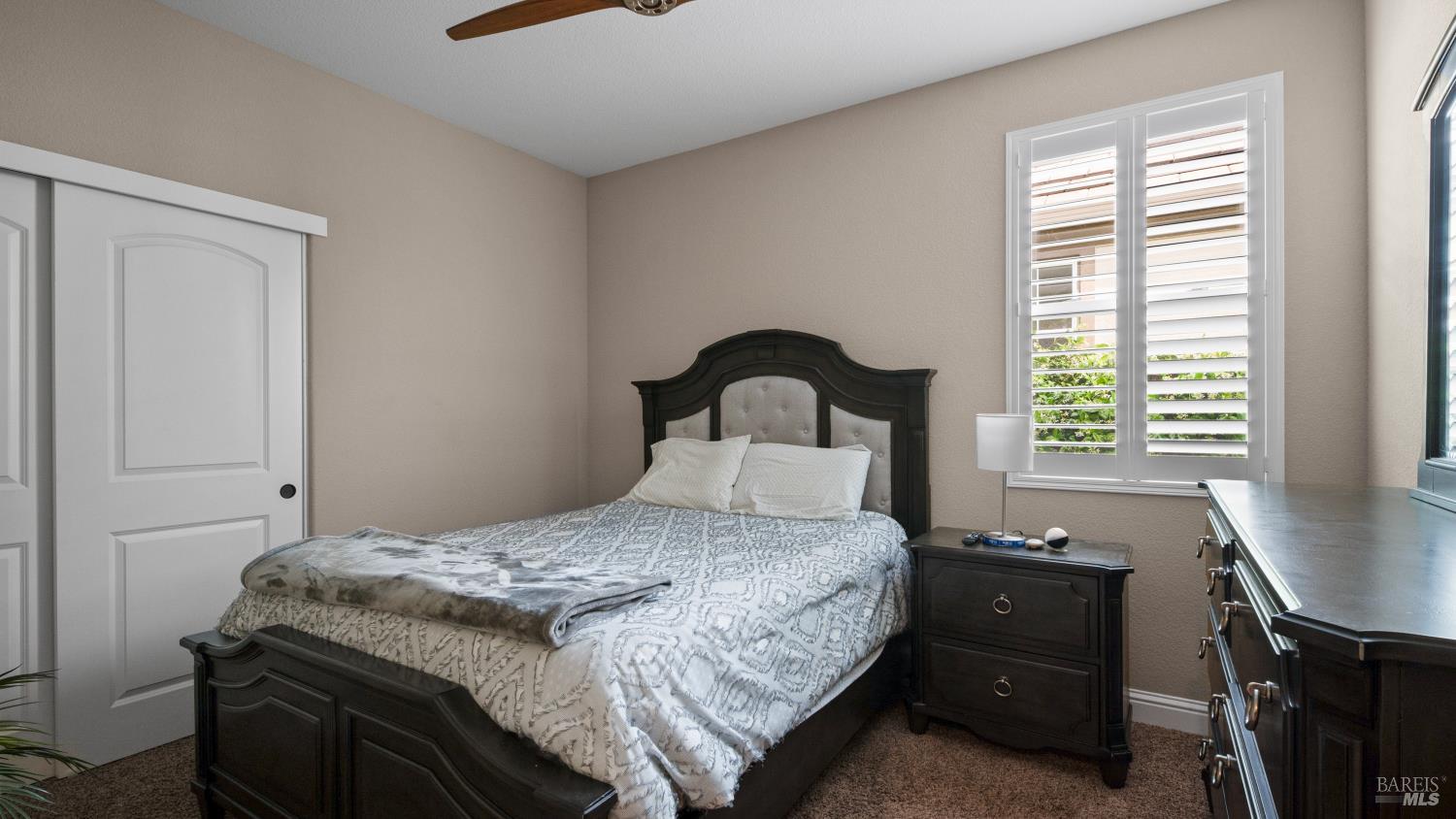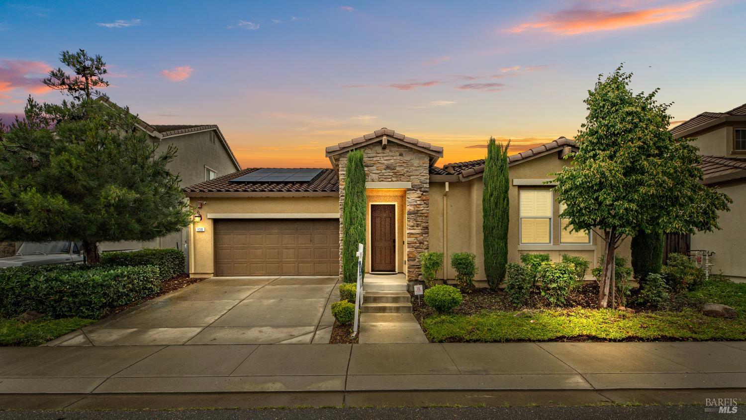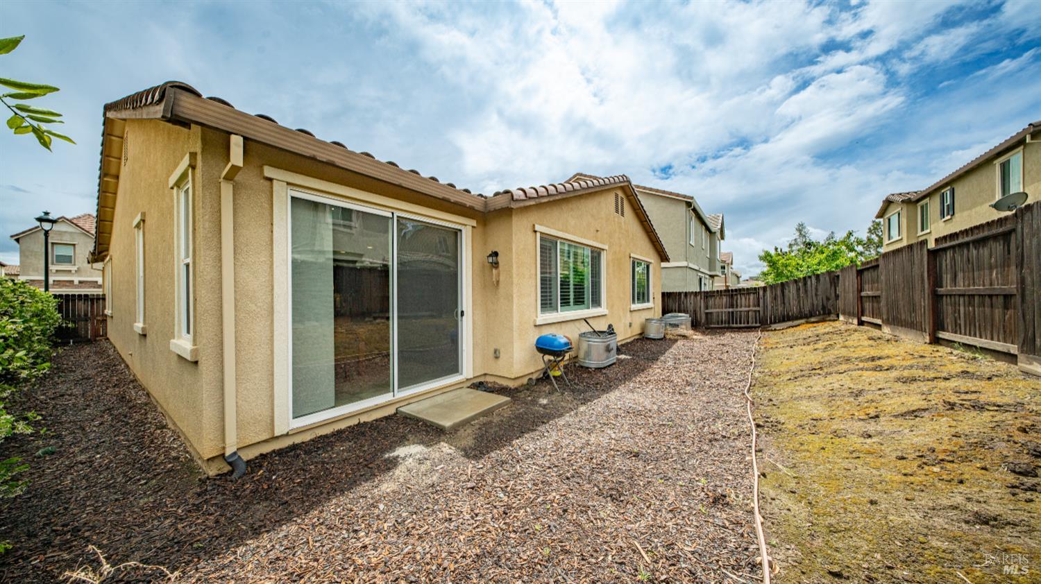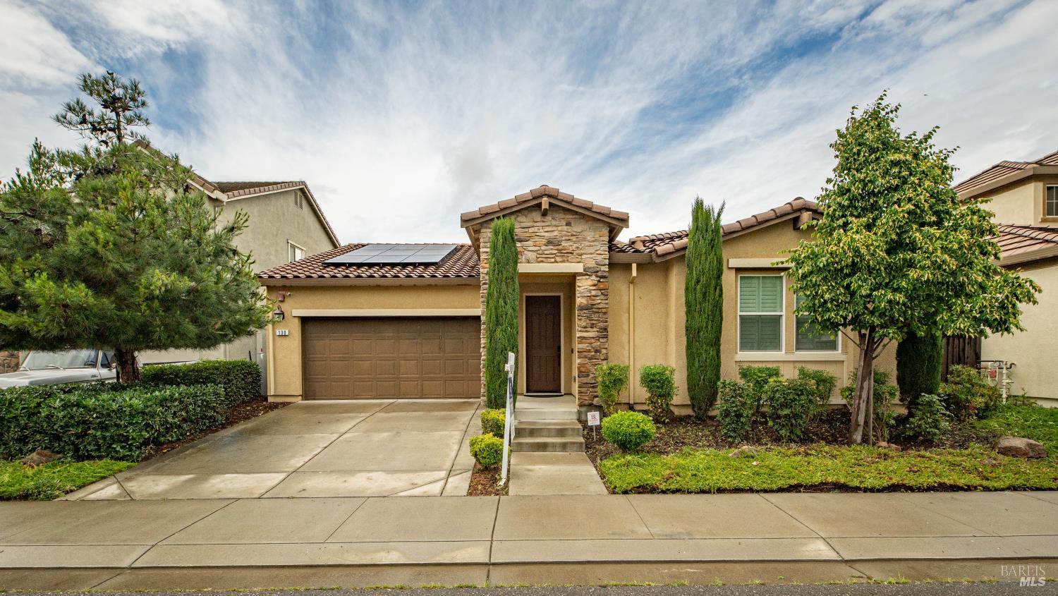 Beautifully maintained and move-in ready, this single-story home built in 2017 offers 3 bedrooms, 2 bathrooms, solar, and no HOA. A standout feature is the rare assumable VA loan in the low 3's for qualified VA buyers, creating an incredible opportunity in today's market. Designed with comfort and functionality in mind, the home features tile flooring and part carpet. Interior panel interior doors, and thoughtful upgrades throughout. The gourmet kitchen features a large island with a sink and bar seating, granite countertops, a decorative backsplash, stainless steel appliances, extra cabinetry, and a walk-in pantry. Interior shutters add style and charm. The spacious primary suite offers a sitting area, a walk-in closet, and a well-appointed bath with dual sinks, decorative mirrors, a soaking tub, and a separate shower. The hall bathroom includes a shower/tub combo and a vanity with cabinets. Additional highlights include an indoor laundry room with sink and cabinets, and a 2-car garage. Extremely well cared for and ready for its next owner, this home combines modern living, energy efficiency, and exceptional value in a desirable Vacaville location.