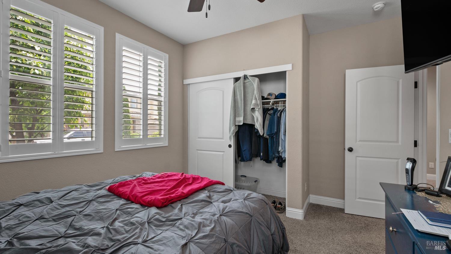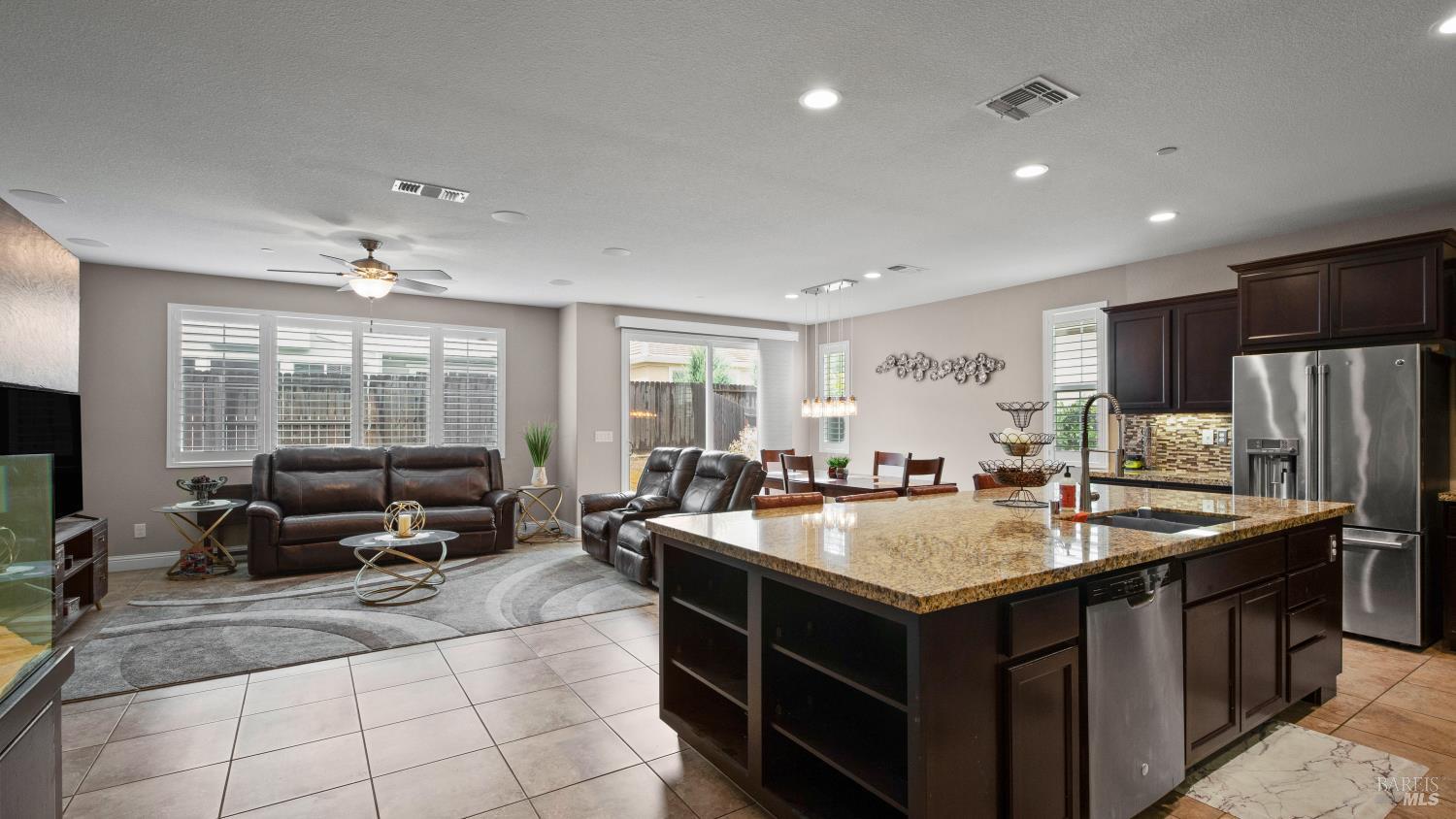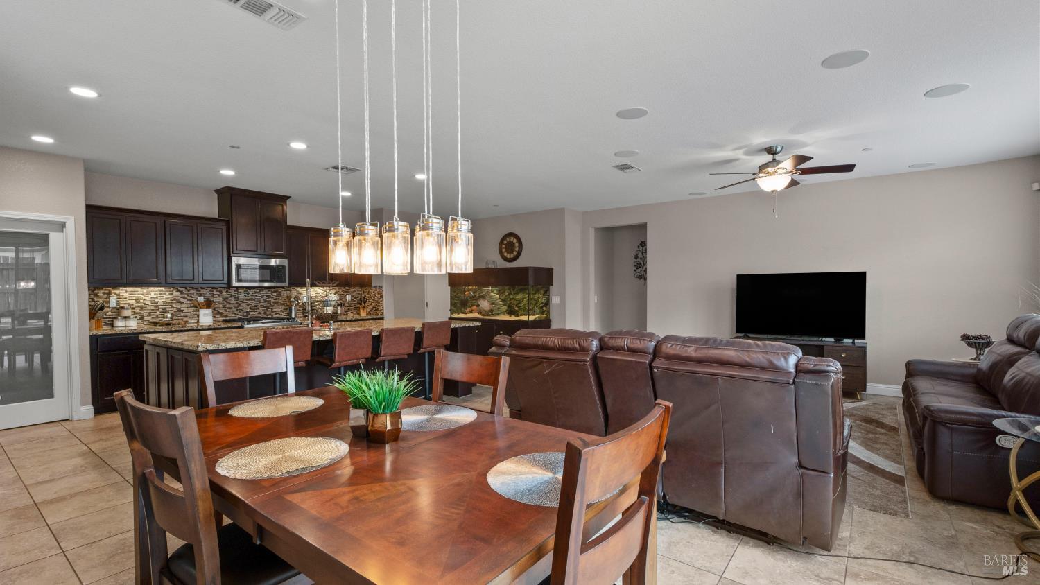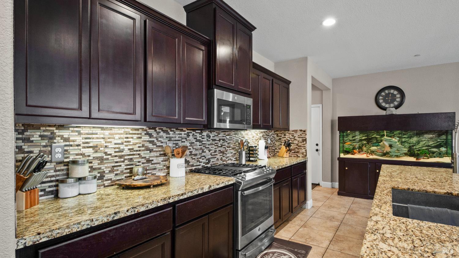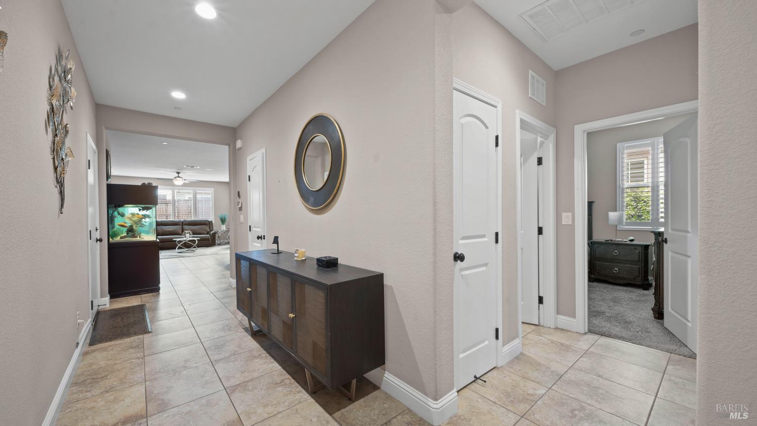 Beautifully maintained and move-in ready, this single-story home built in 2017 offers 3 bedrooms, 2 bathrooms, solar, and no HOA. A standout feature is the rare assumable VA loan in the low 3's for qualified VA buyers, creating an incredible opportunity in today's market. Designed with comfort and functionality in mind, the home features tile flooring and part carpet. Interior panel interior doors, and thoughtful upgrades throughout. The gourmet kitchen features a large island with a sink and bar seating, granite countertops, a decorative backsplash, stainless steel appliances, extra cabinetry, and a walk-in pantry. Interior shutters add style and charm. The spacious primary suite offers a sitting area, a walk-in closet, and a well-appointed bath with dual sinks, decorative mirrors, a soaking tub, and a separate shower. The hall bathroom includes a shower/tub combo and a vanity with cabinets. Additional highlights include an indoor laundry room with sink and cabinets, and a 2-car garage. Extremely well cared for and ready for its next owner, this home combines modern living, energy efficiency, and exceptional value in a desirable Vacaville location.