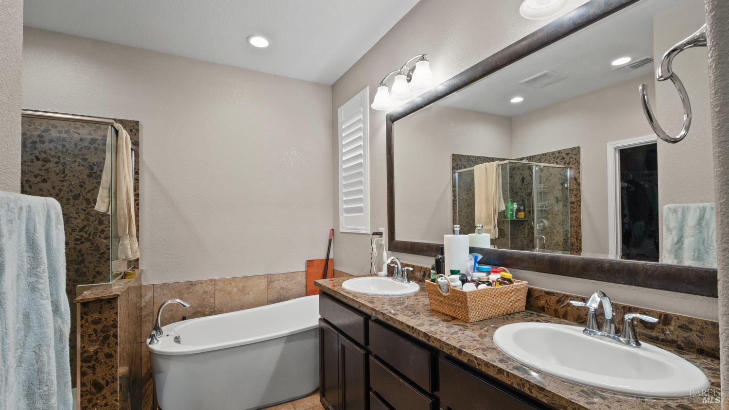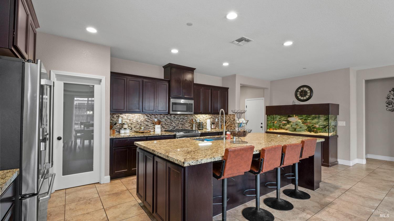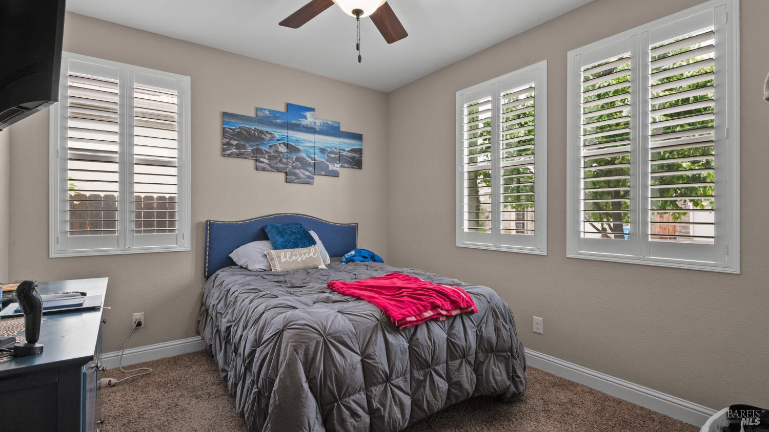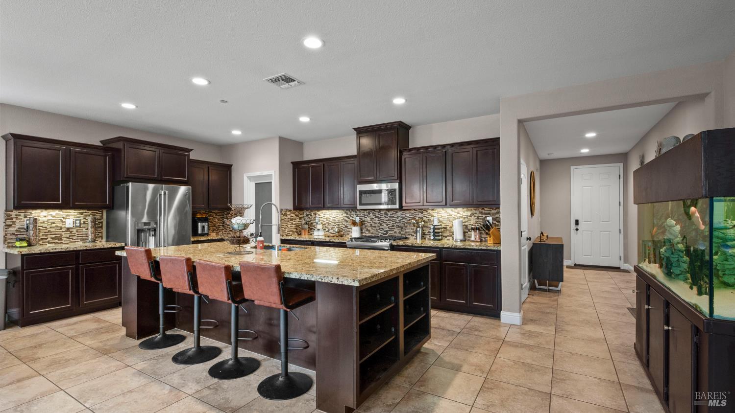 Beautifully maintained and move-in ready, this single-story home built in 2017 offers 3 bedrooms, 2 bathrooms, solar, and no HOA. A standout feature is the rare assumable VA loan in the low 3's for qualified VA buyers, creating an incredible opportunity in today's market. Designed with comfort and functionality in mind, the home features tile flooring and part carpet. Interior panel interior doors, and thoughtful upgrades throughout. The gourmet kitchen features a large island with a sink and bar seating, granite countertops, a decorative backsplash, stainless steel appliances, extra cabinetry, and a walk-in pantry. Interior shutters add style and charm. The spacious primary suite offers a sitting area, a walk-in closet, and a well-appointed bath with dual sinks, decorative mirrors, a soaking tub, and a separate shower. The hall bathroom includes a shower/tub combo and a vanity with cabinets. Additional highlights include an indoor laundry room with sink and cabinets, and a 2-car garage. Extremely well cared for and ready for its next owner, this home combines modern living, energy efficiency, and exceptional value in a desirable Vacaville location.