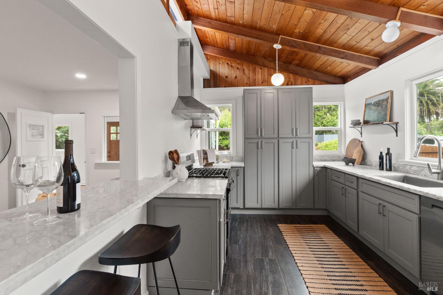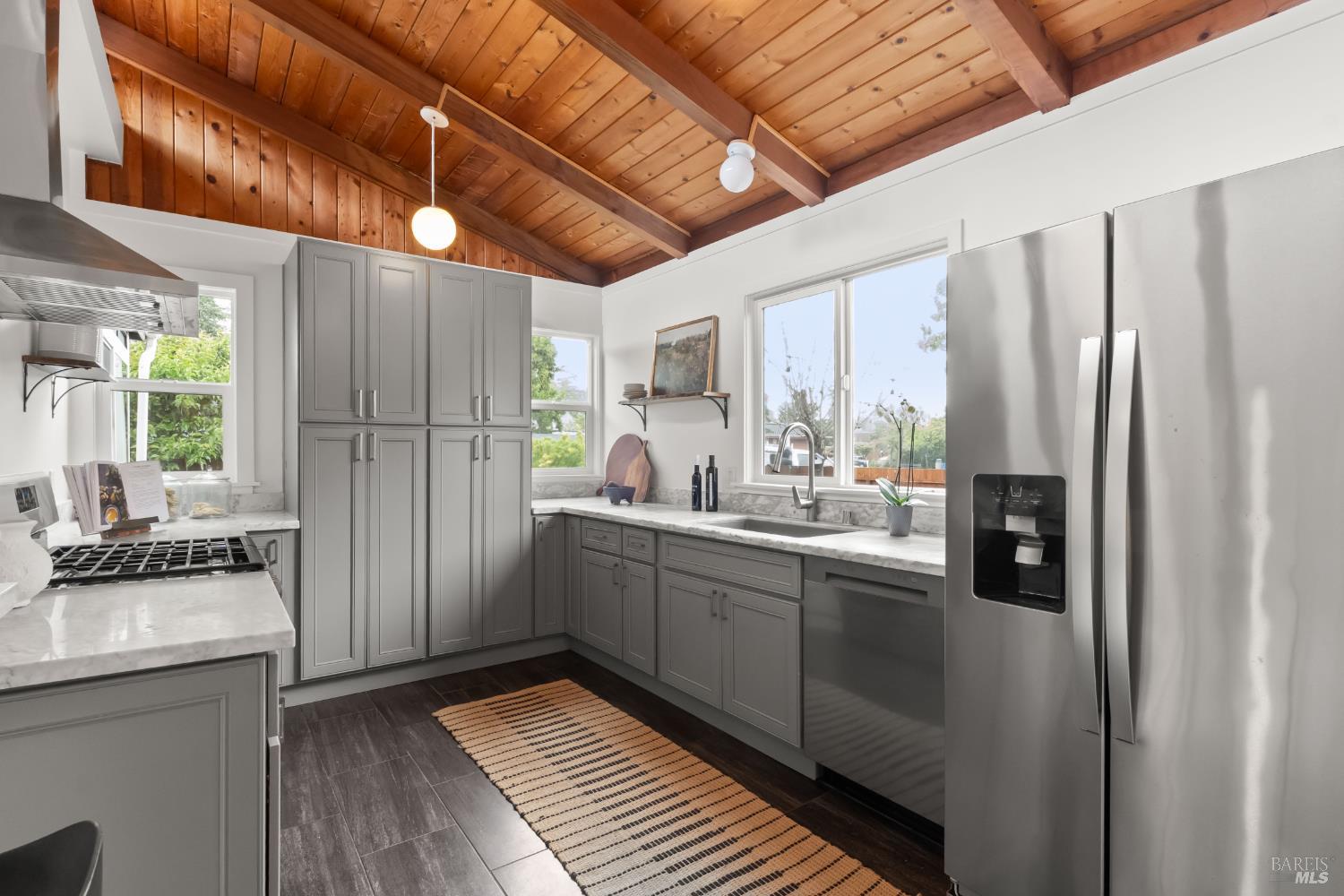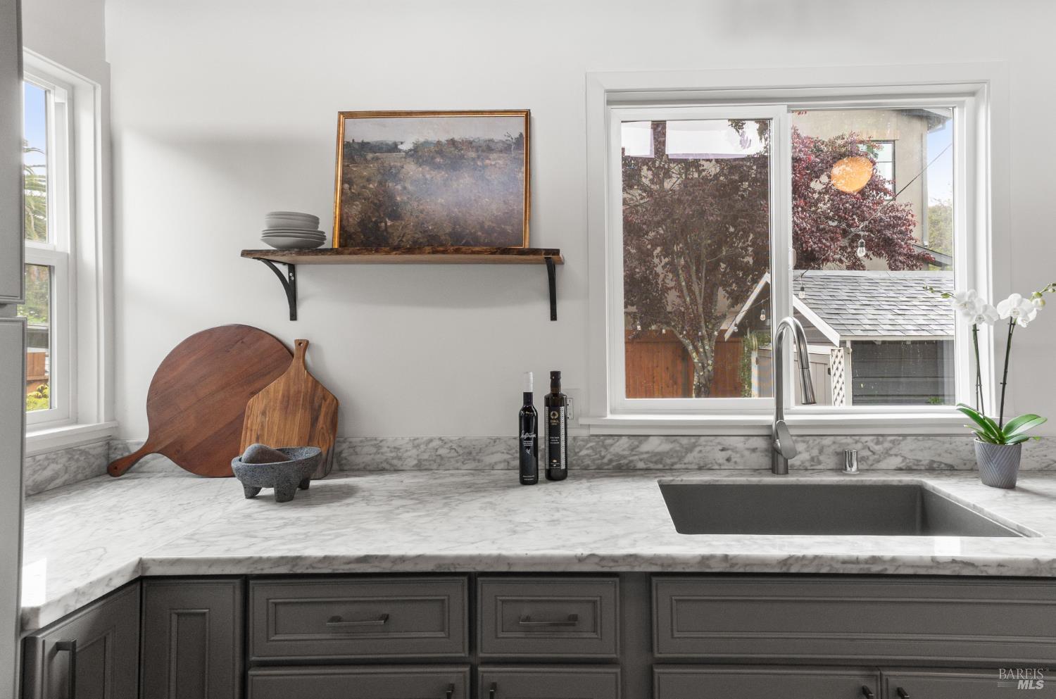 Located in the highly sought-after Chapman Park neighborhood, this charming 1920s home has been tastefully updated. Flexible floor plan offers 1162* square feet, three-bedrooms and two updated bathrooms and additional flex space ideal for a mudroom, playroom, or home office complete with laundry area. The renovated kitchen offers Carrera marble countertops and stainless steel appliances, accented by vaulted wood ceilings, ample windows, with abundant natural light. Raised garden beds and inviting space for outdoor gatherings are complemented by string lights. A detached garage offers additional storage and a built-in workbench. Situated in the heart of the Chapman Park flats, directly across from Corte Madera Town Park enjoy playgrounds, soccer fields, tennis court and Recreation Center close by. Highly desirable schools. Close to the Larkspur-Corte Madera bike path, numerous hiking trails, and two premier malls. Yoga studios, restaurants, and a wine bar are all just blocks away. This sweet Chapman Park charmer has been lovingly updated and is ready for it's next owner.