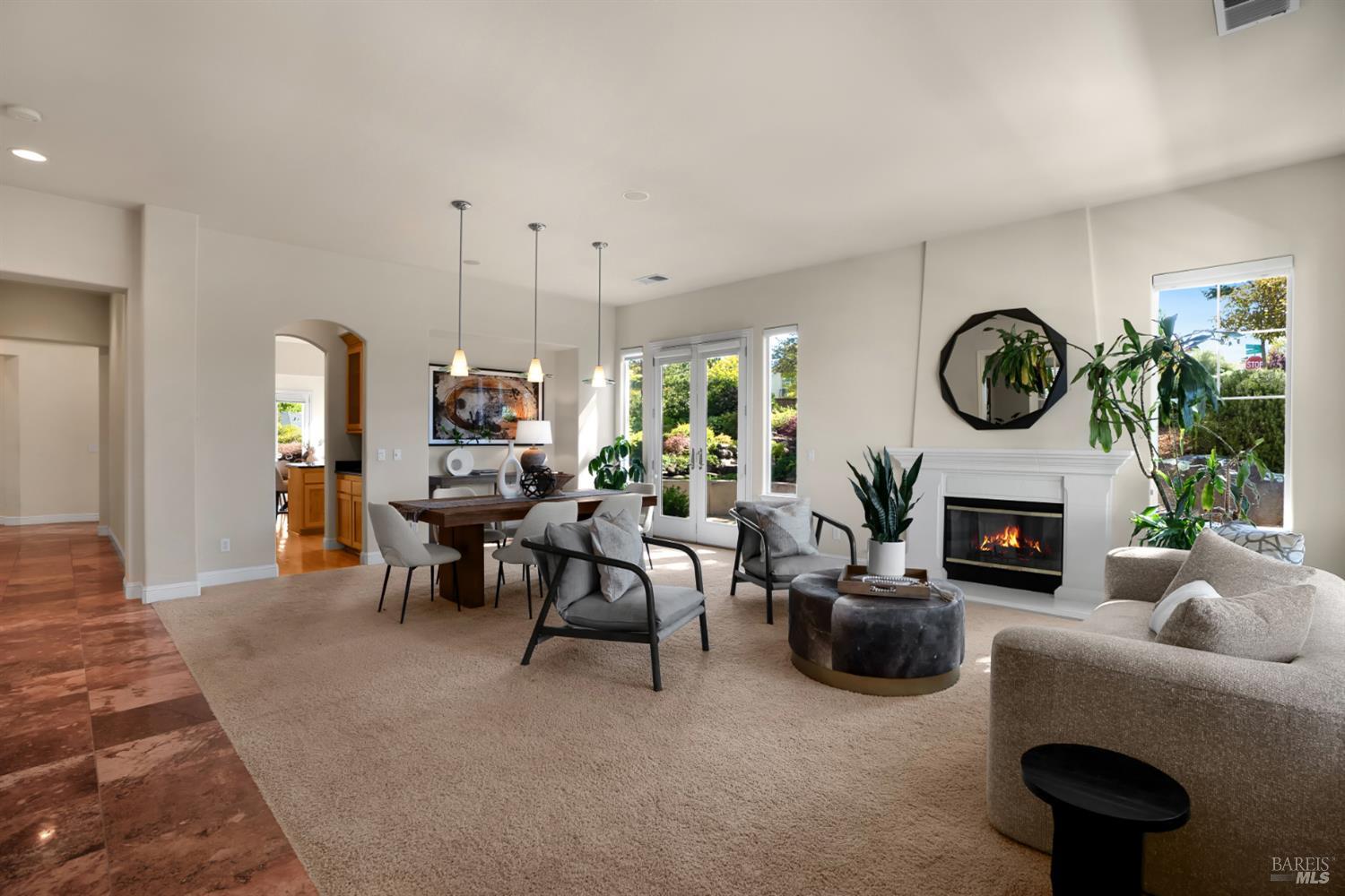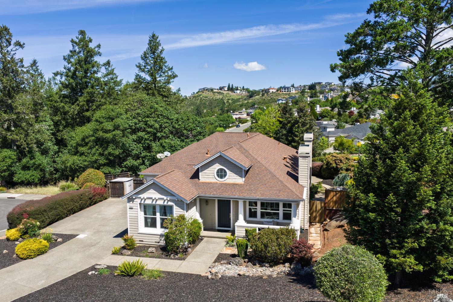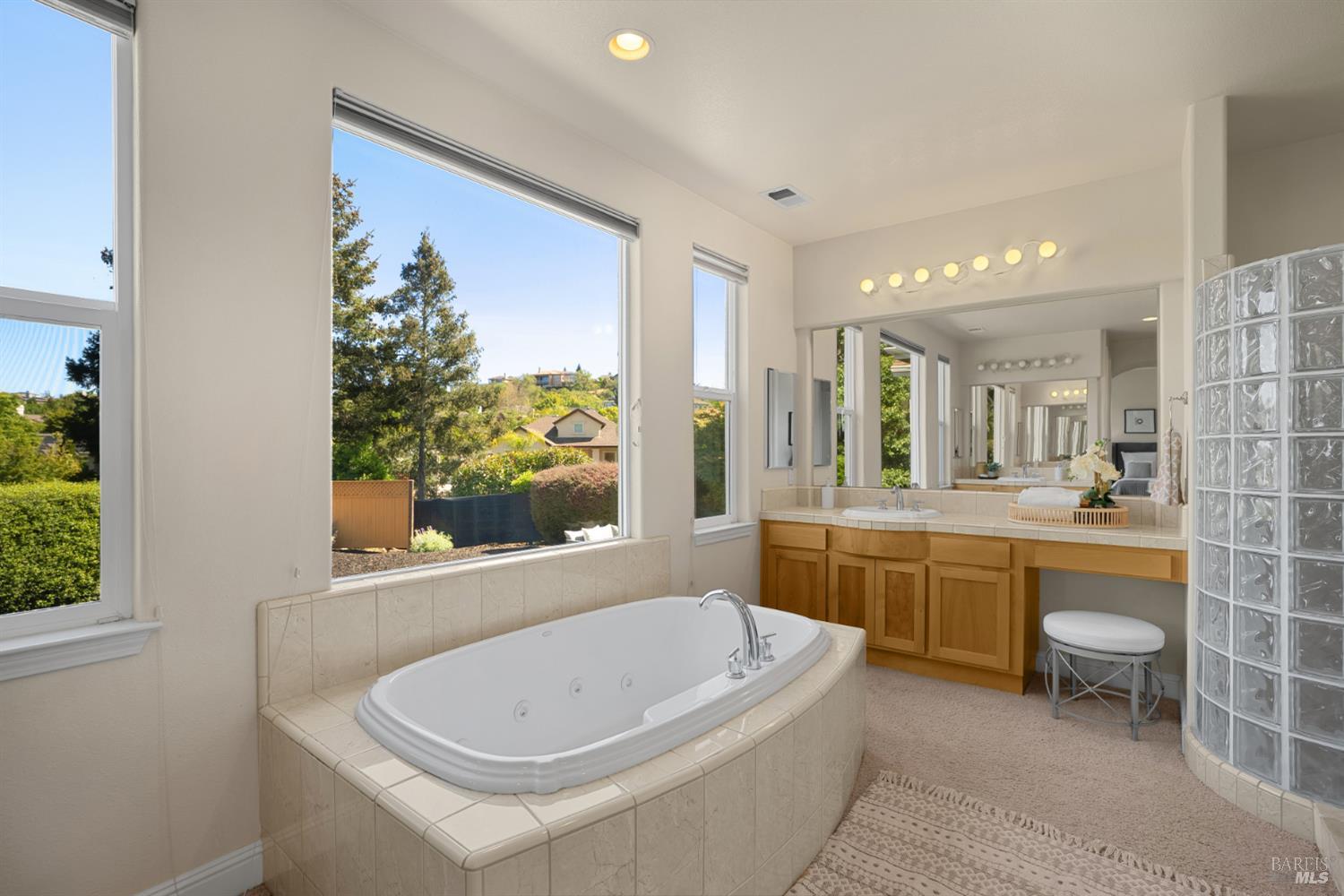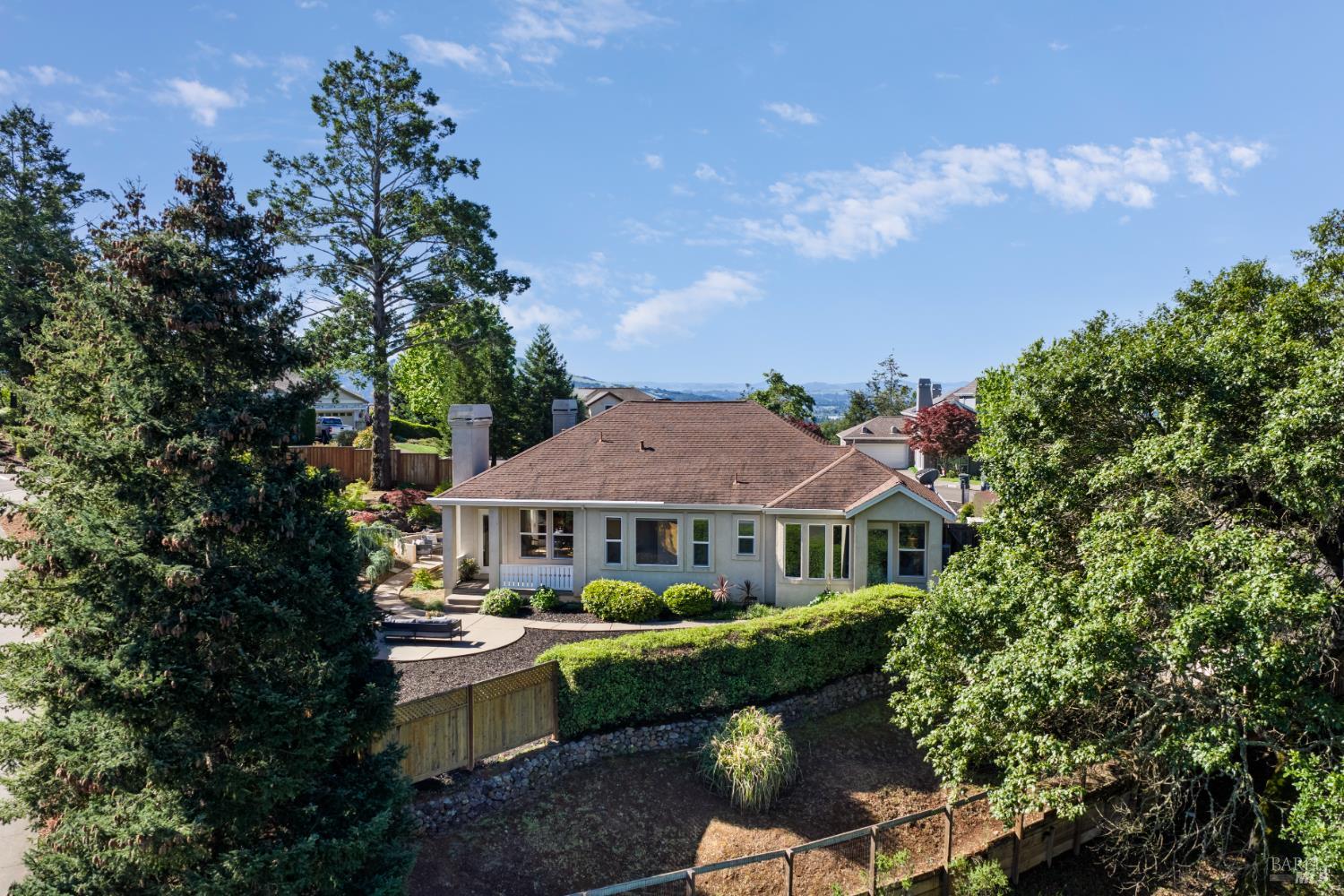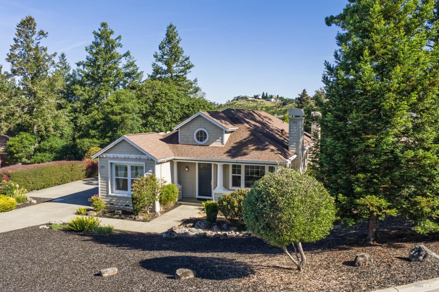 Located in this desirable Fountaingrove neighborhood, the home offers a rare single-level retreat on a private half-acre cul-de-sac lot backing to open space. Surrounded by mature landscaping, this property delivers exceptional privacy and seamless indoor-outdoor living. The thoughtfully designed floor plan includes 3 bedrooms plus a dedicated office with glass doors. The spacious primary suite features crown molding, French doors to the backyard, a walk-in closet, dual vanities, a soaking tub, and a separate shower. A front ensuite bedroom is ideal for guests, while a secondary bedroom connects to a Jack-and-Jill bath. The well-appointed kitchen is equipped with a 6-burner Thermador gas cooktop, professional hood with heat lamps, built-in oven, and microwave. Shaker alder/birch cabinetry, stone slab countertops, under-cabinet lighting, wood flooring, and a bright breakfast nook with French doors to the patio complete the space. Designed for both entertaining and everyday comfort, the home offers formal living and family rooms with gas-start fireplaces, a dining area with butler's pantry, and multiple French doors opening to the patio and yard. Additional features include a hot tub, laundry room with sink and cabinetry. A rare opportunity to enjoy privacy, space, and tranquility in Fountaingrove.