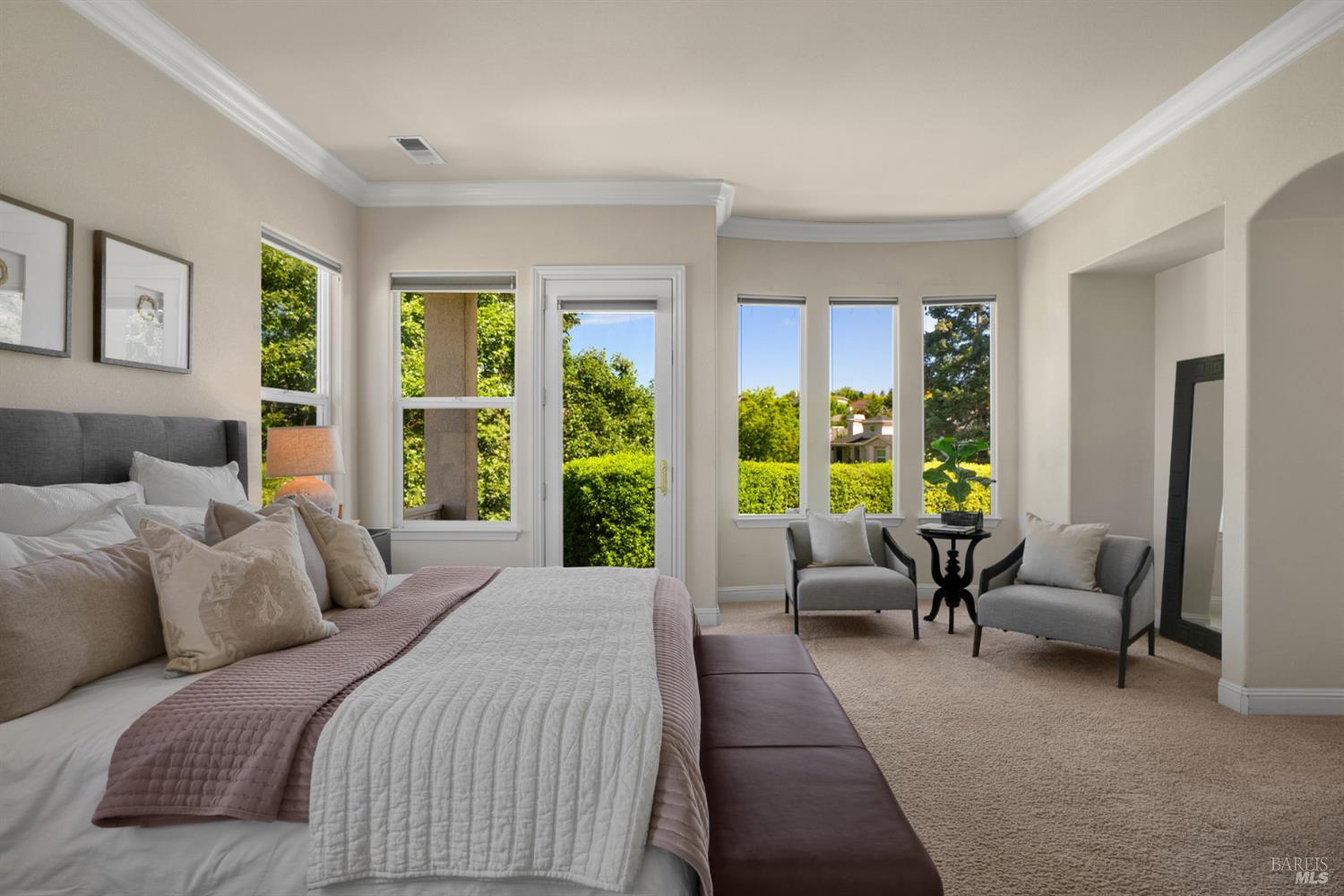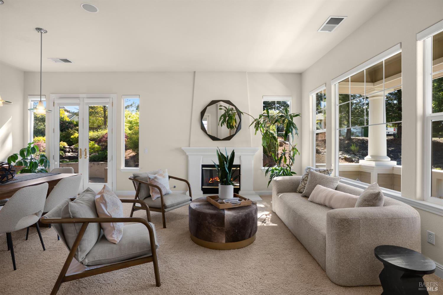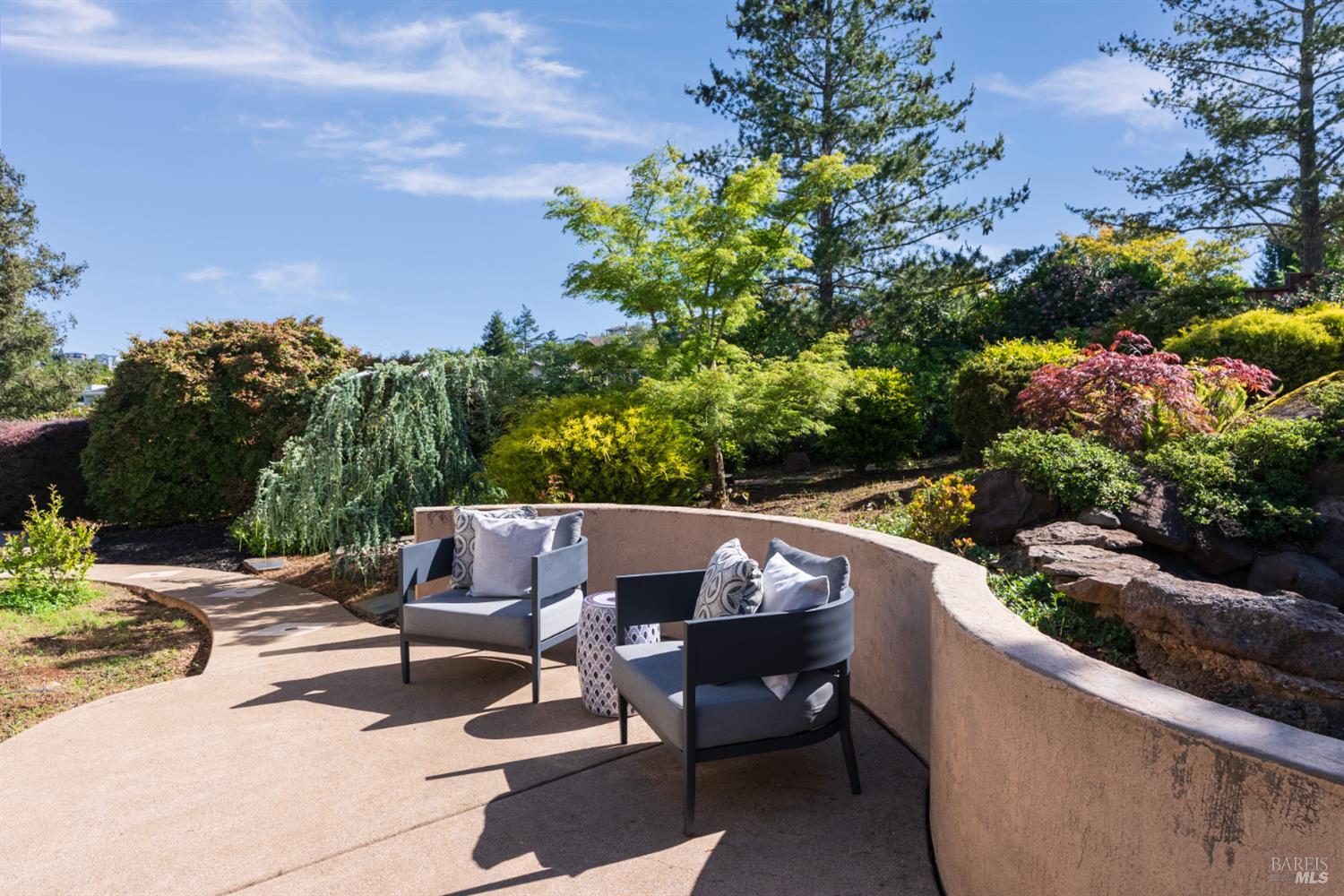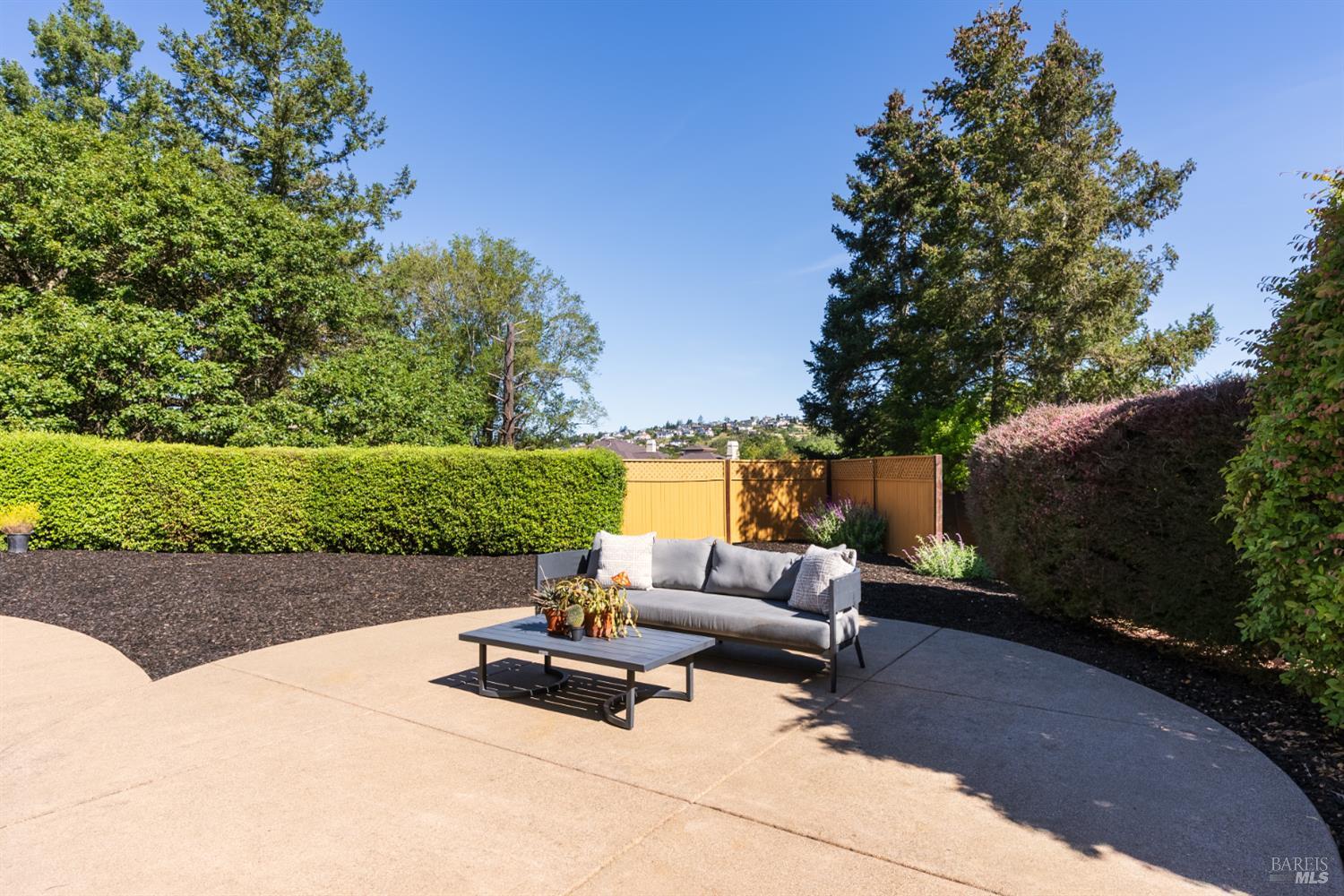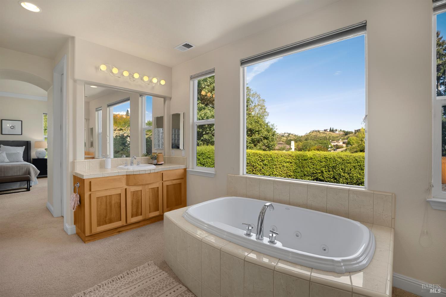 Located in this desirable Fountaingrove neighborhood, the home offers a rare single-level retreat on a private half-acre cul-de-sac lot backing to open space. Surrounded by mature landscaping, this property delivers exceptional privacy and seamless indoor-outdoor living. The thoughtfully designed floor plan includes 3 bedrooms plus a dedicated office with glass doors. The spacious primary suite features crown molding, French doors to the backyard, a walk-in closet, dual vanities, a soaking tub, and a separate shower. A front ensuite bedroom is ideal for guests, while a secondary bedroom connects to a Jack-and-Jill bath. The well-appointed kitchen is equipped with a 6-burner Thermador gas cooktop, professional hood with heat lamps, built-in oven, and microwave. Shaker alder/birch cabinetry, stone slab countertops, under-cabinet lighting, wood flooring, and a bright breakfast nook with French doors to the patio complete the space. Designed for both entertaining and everyday comfort, the home offers formal living and family rooms with gas-start fireplaces, a dining area with butler's pantry, and multiple French doors opening to the patio and yard. Additional features include a hot tub, laundry room with sink and cabinetry. A rare opportunity to enjoy privacy, space, and tranquility in Fountaingrove.