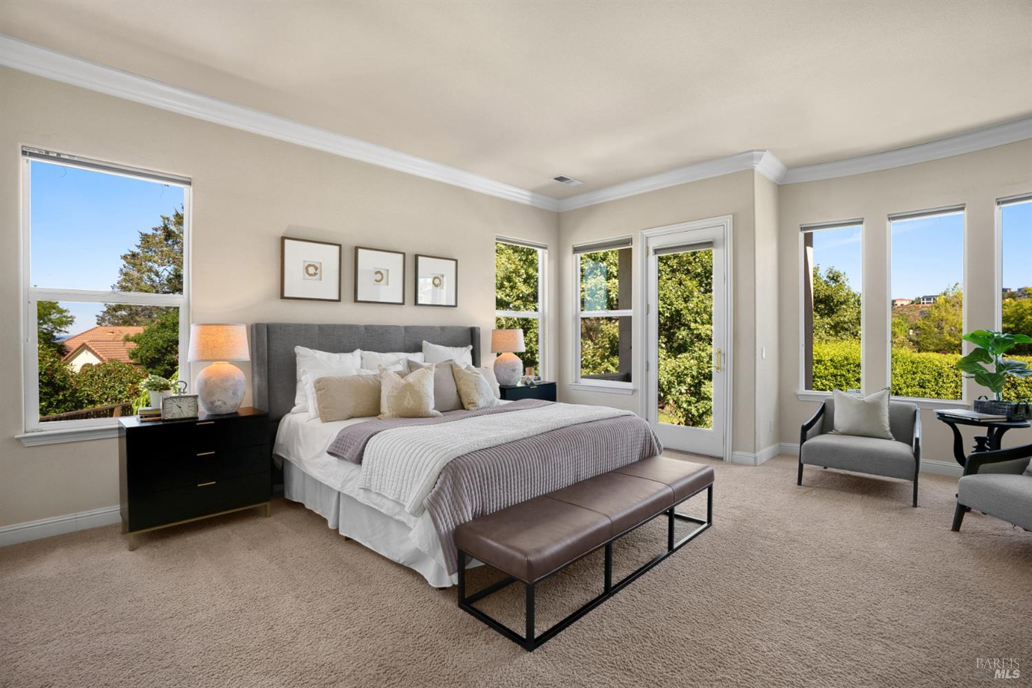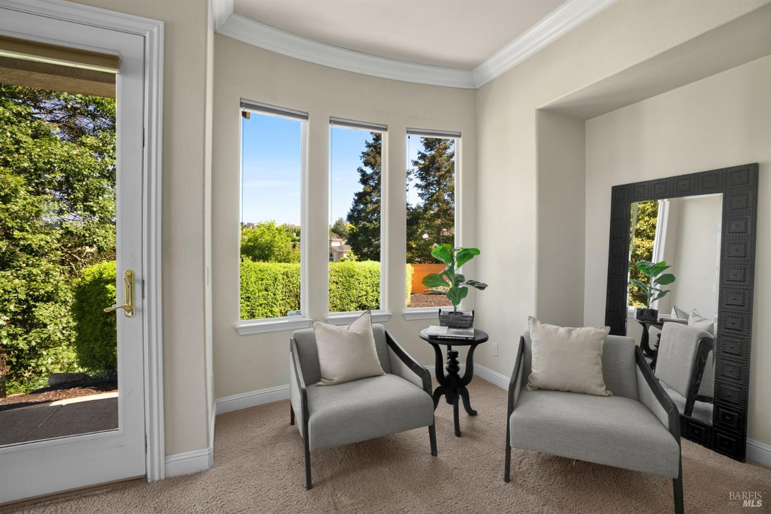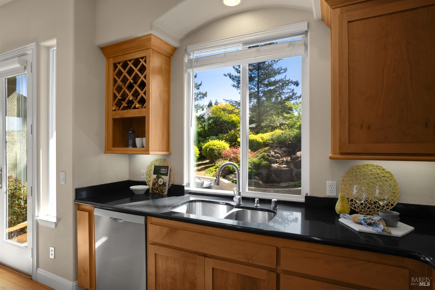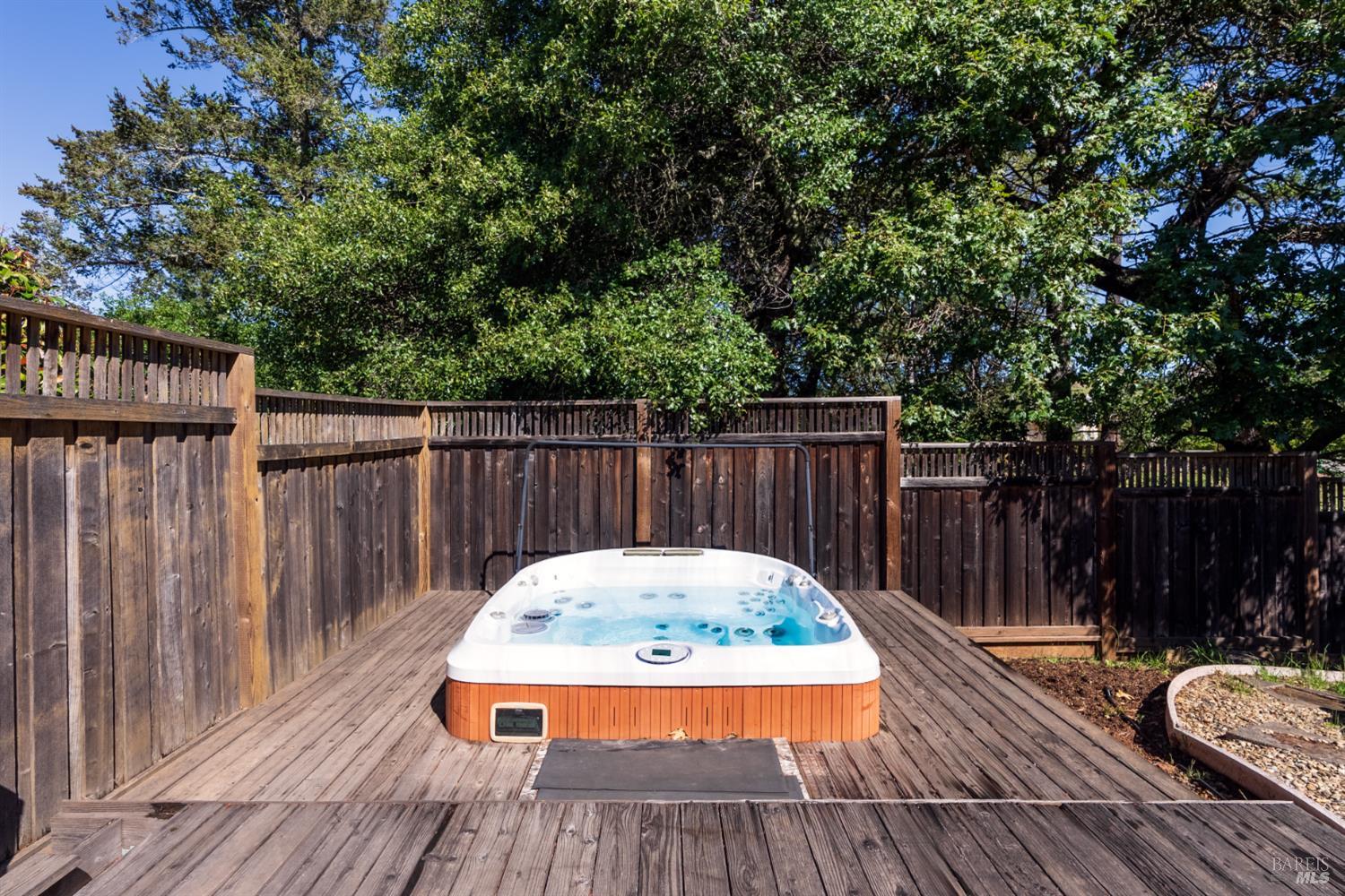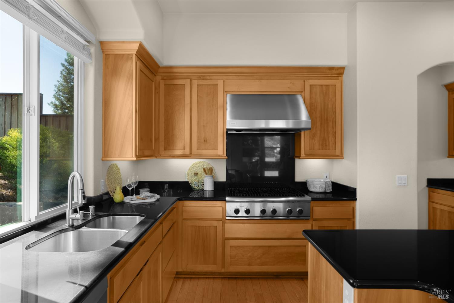 Located in this desirable Fountaingrove neighborhood, the home offers a rare single-level retreat on a private half-acre cul-de-sac lot backing to open space. Surrounded by mature landscaping, this property delivers exceptional privacy and seamless indoor-outdoor living. The thoughtfully designed floor plan includes 3 bedrooms plus a dedicated office with glass doors. The spacious primary suite features crown molding, French doors to the backyard, a walk-in closet, dual vanities, a soaking tub, and a separate shower. A front ensuite bedroom is ideal for guests, while a secondary bedroom connects to a Jack-and-Jill bath. The well-appointed kitchen is equipped with a 6-burner Thermador gas cooktop, professional hood with heat lamps, built-in oven, and microwave. Shaker alder/birch cabinetry, stone slab countertops, under-cabinet lighting, wood flooring, and a bright breakfast nook with French doors to the patio complete the space. Designed for both entertaining and everyday comfort, the home offers formal living and family rooms with gas-start fireplaces, a dining area with butler's pantry, and multiple French doors opening to the patio and yard. Additional features include a hot tub, laundry room with sink and cabinetry. A rare opportunity to enjoy privacy, space, and tranquility in Fountaingrove.